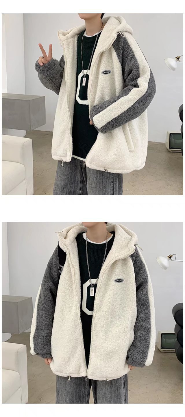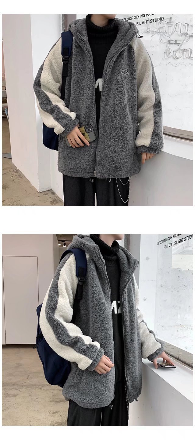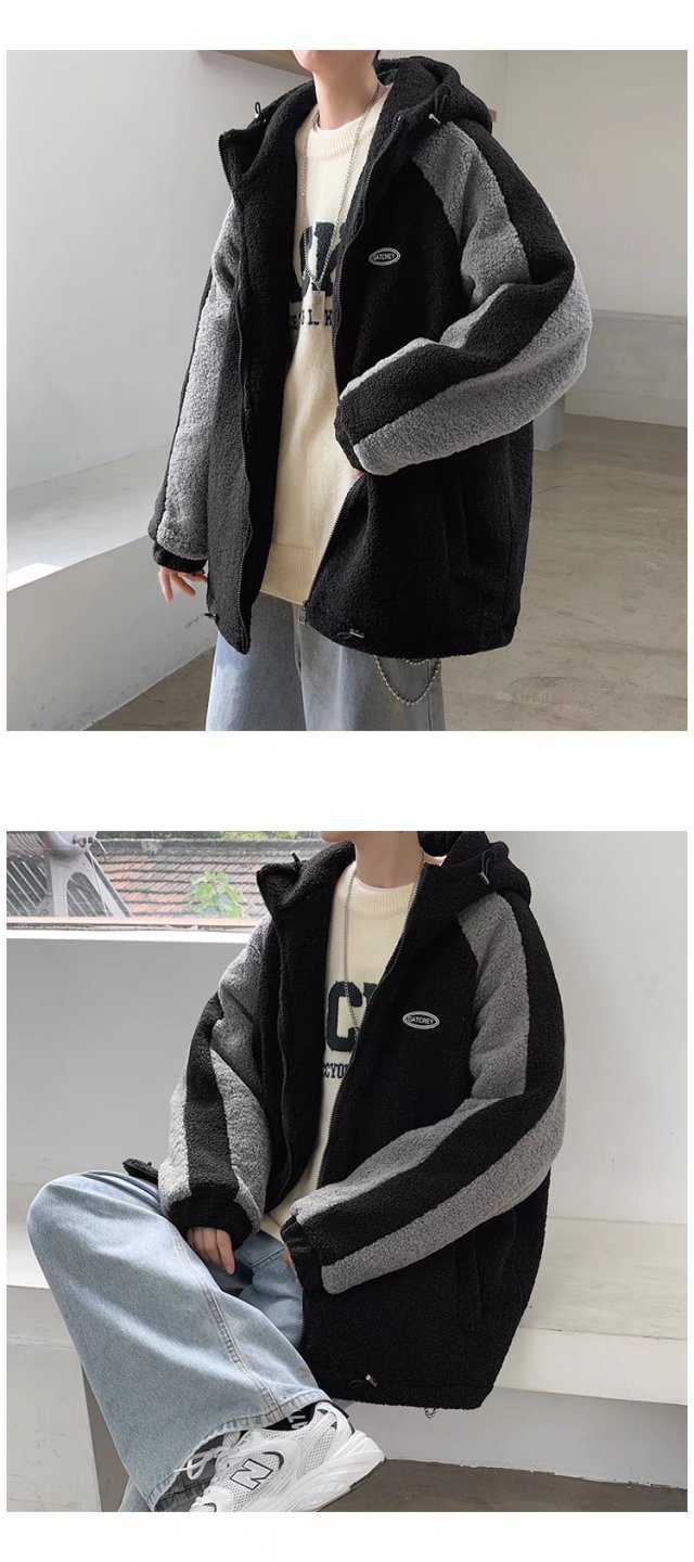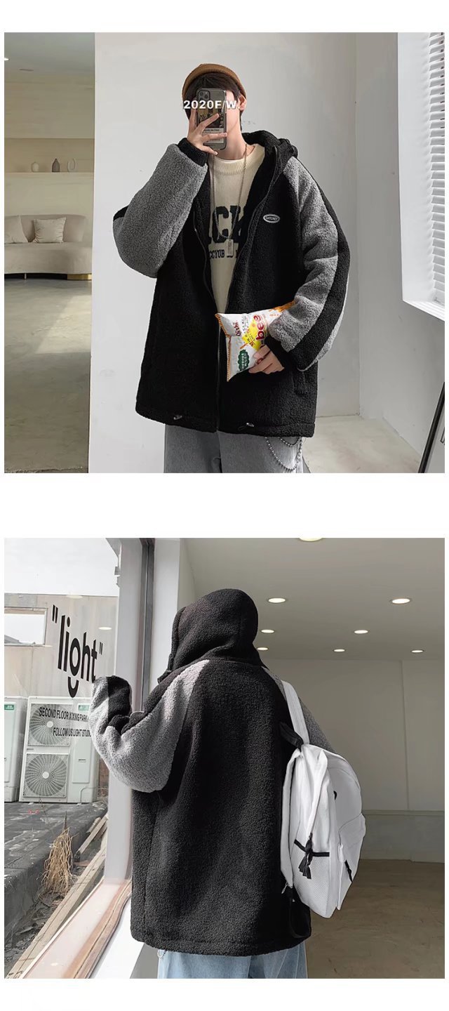 겨울 양가죽 스웨트 셔츠 남성용 두꺼운 후드 스티칭 재킷 트렌디 브랜드 루즈 트렌디 한 커플 양털 카디건 재킷스토어 가기