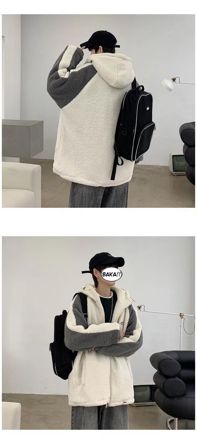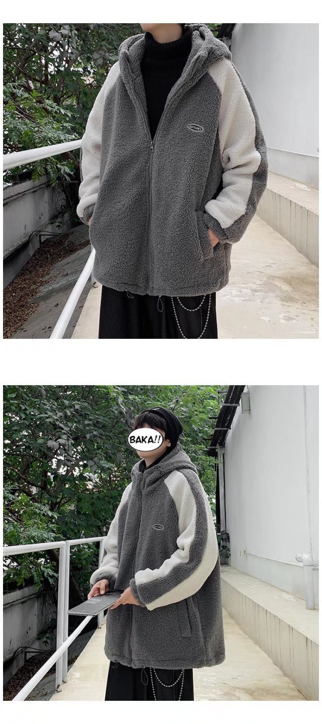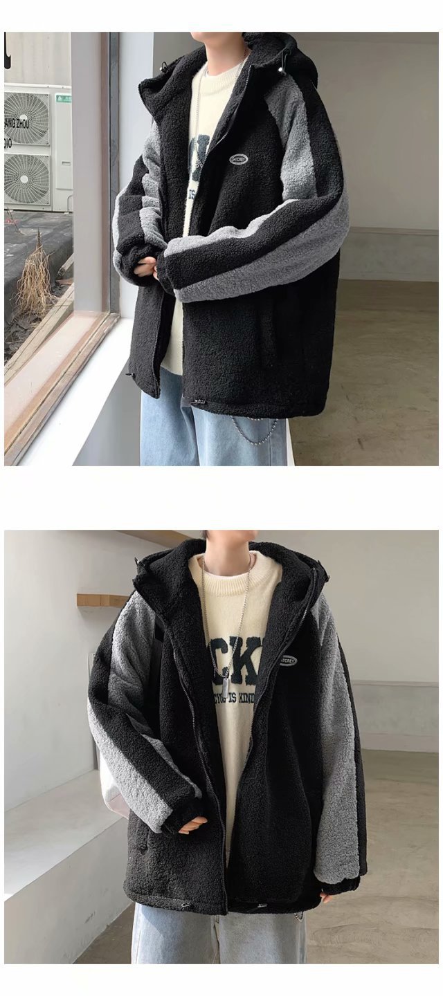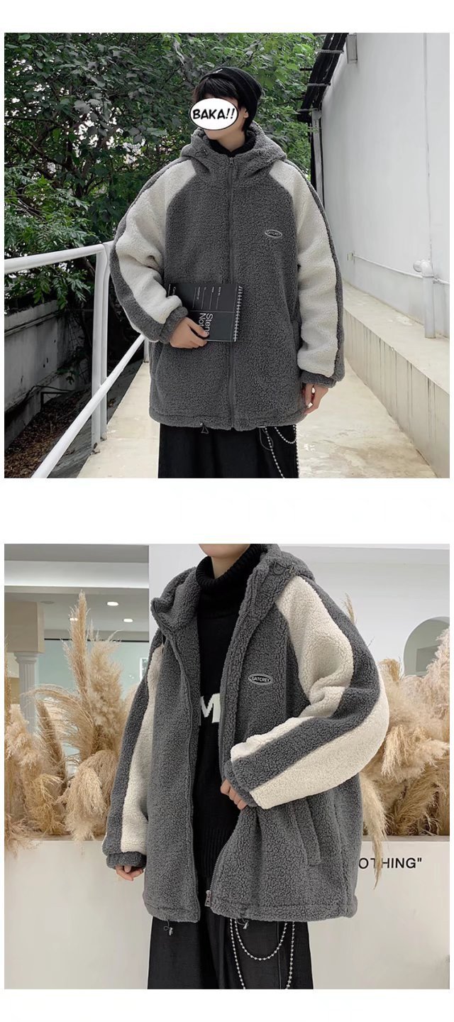 겨울 양가죽 스웨트 셔츠 남성용 두꺼운 후드 스티칭 재킷 트렌디 브랜드 루즈 트렌디 한 커플 양털 카디건 재킷스토어 가기