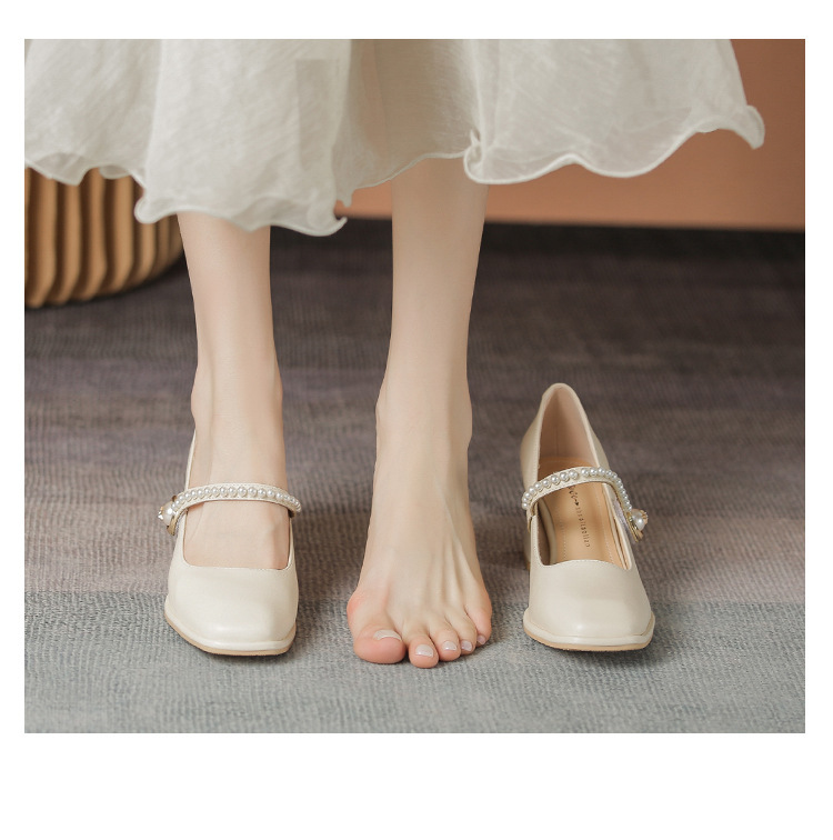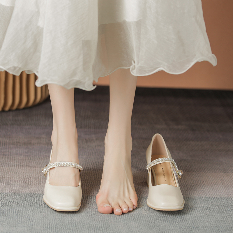 기질 진주 여성의 한국 스타일 봄과 가을 부드러운 얼굴 기질 광장 발가락 메리 제인 신발 진짜 가죽 신발 두꺼운 힐 5cm 높이 증가스토어 가기