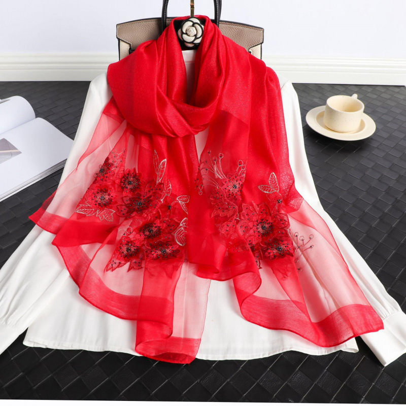 재고 새로운 손으로 만든 구슬 자수 실크 스카프 뽕나무 실크 자수 양모 스카프 여성 꽃 실크 양모 목도리스토어 가기