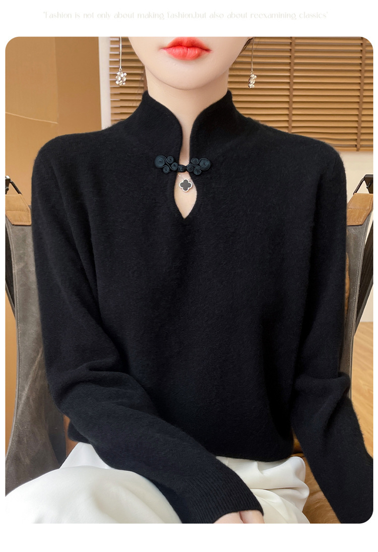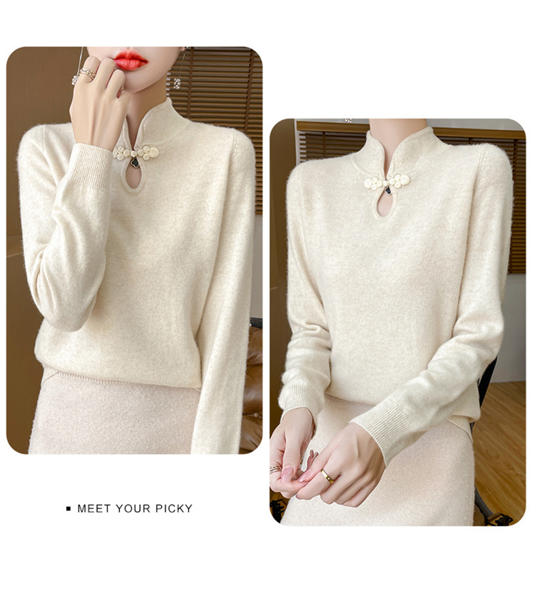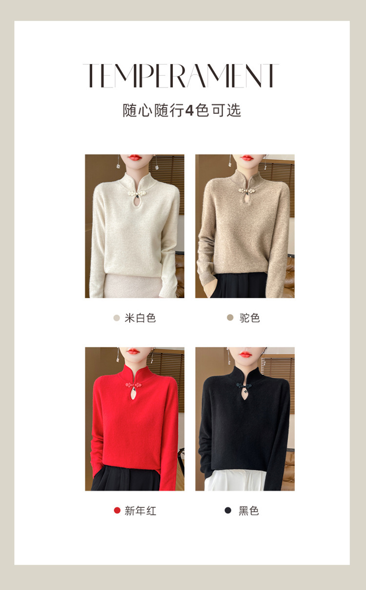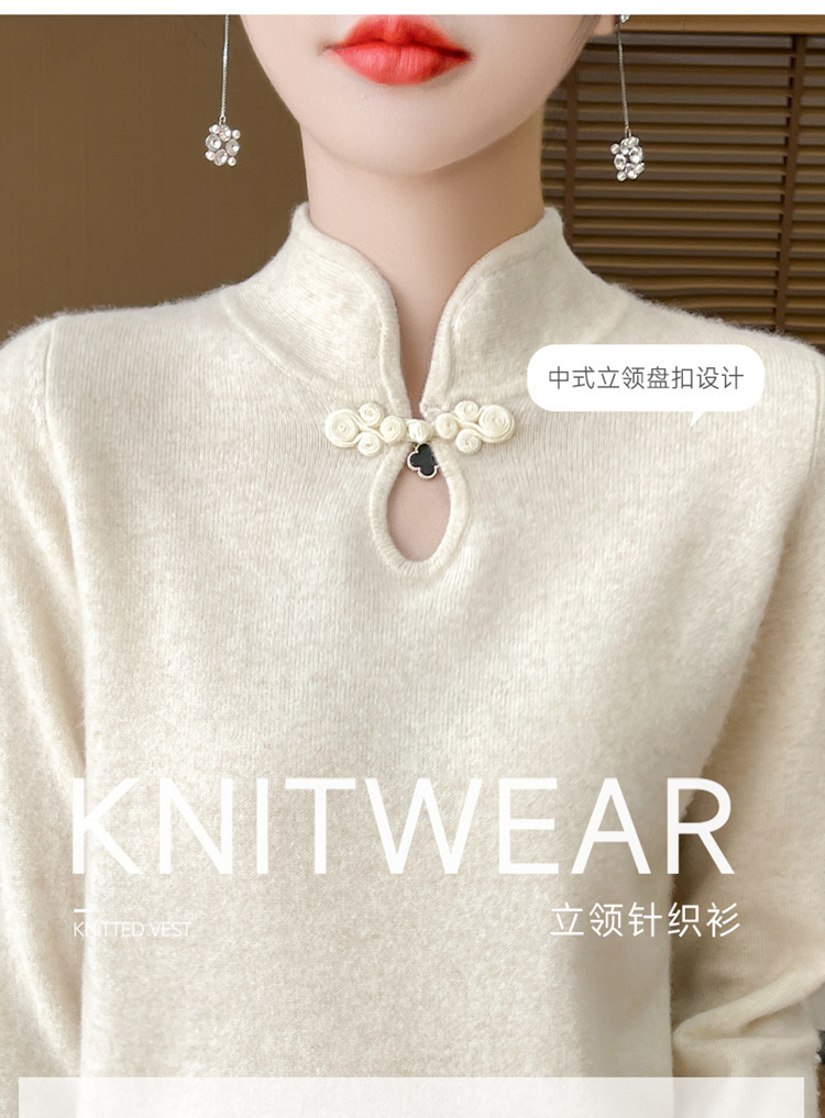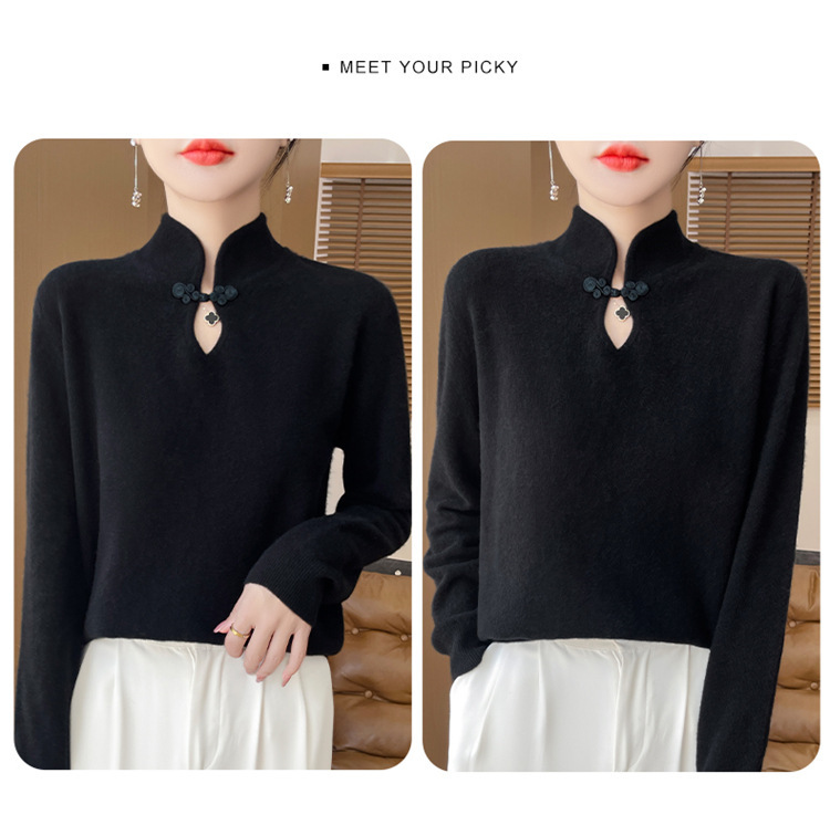 2025 가을 겨울 신상품, 새로운 중국풍 스타일의 스탠드 칼라 스웨터, 여성용 슬림핏 루즈핏 베이스 셔츠, 니트웨어 상의 도매스토어 가기