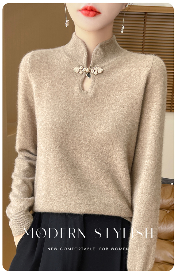 2025 가을 겨울 신상품, 새로운 중국풍 스타일의 스탠드 칼라 스웨터, 여성용 슬림핏 루즈핏 베이스 셔츠, 니트웨어 상의 도매