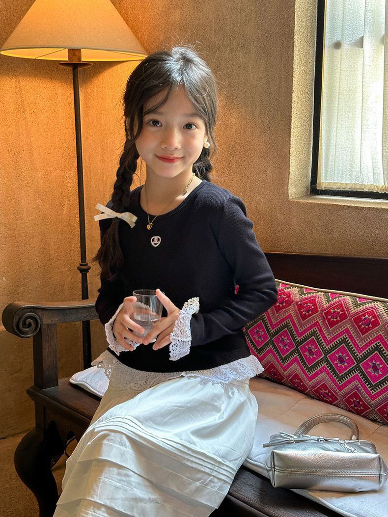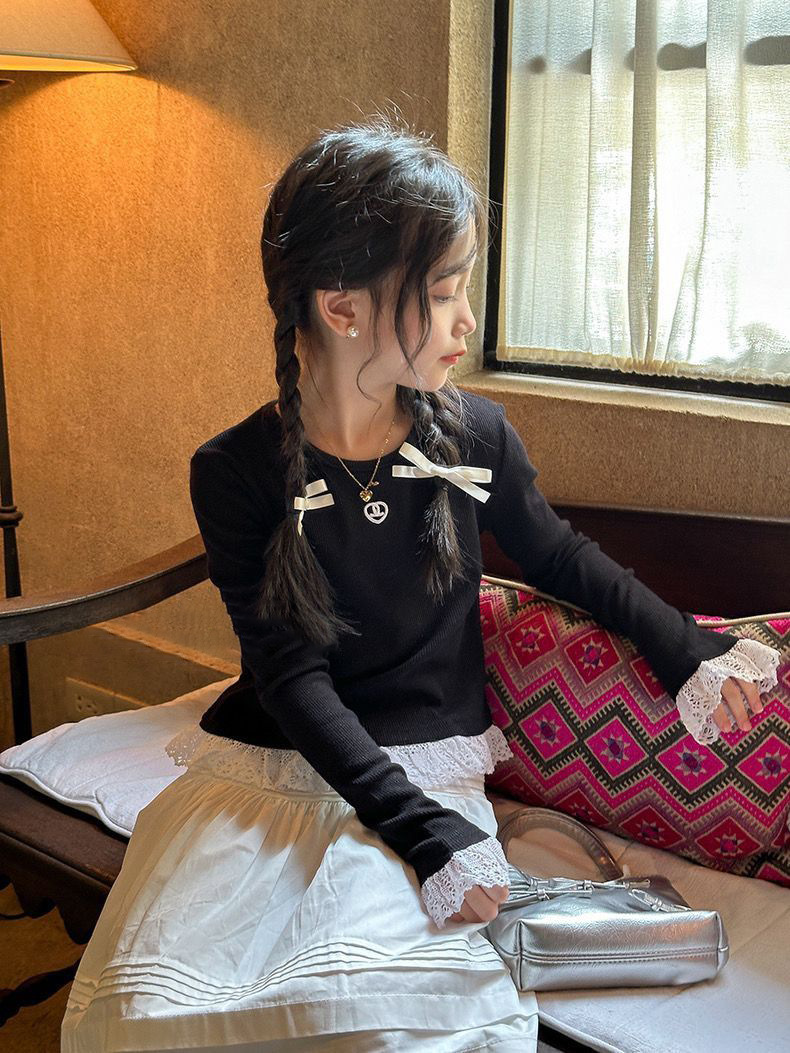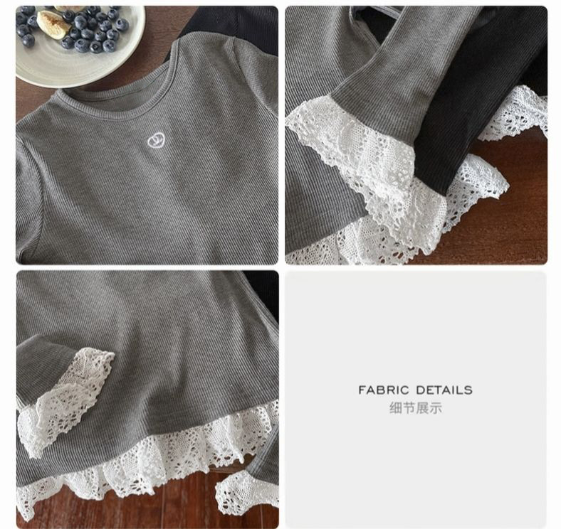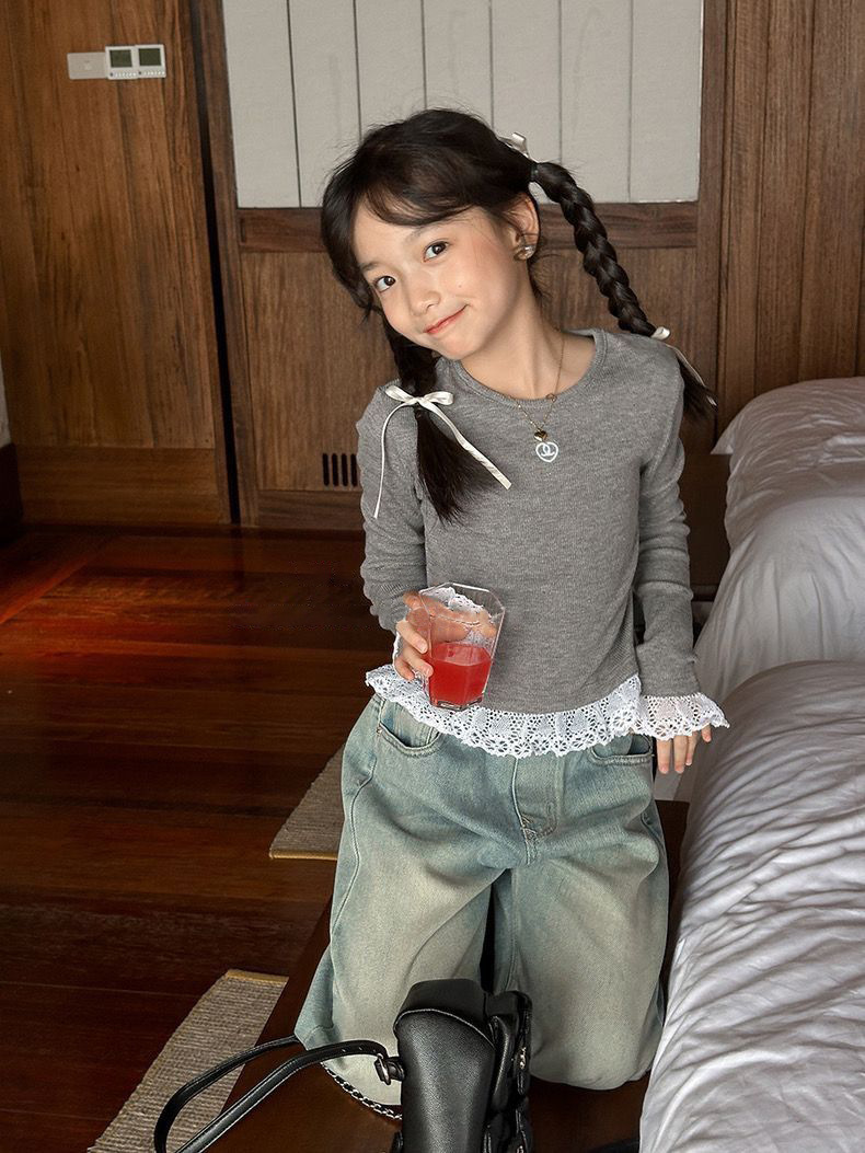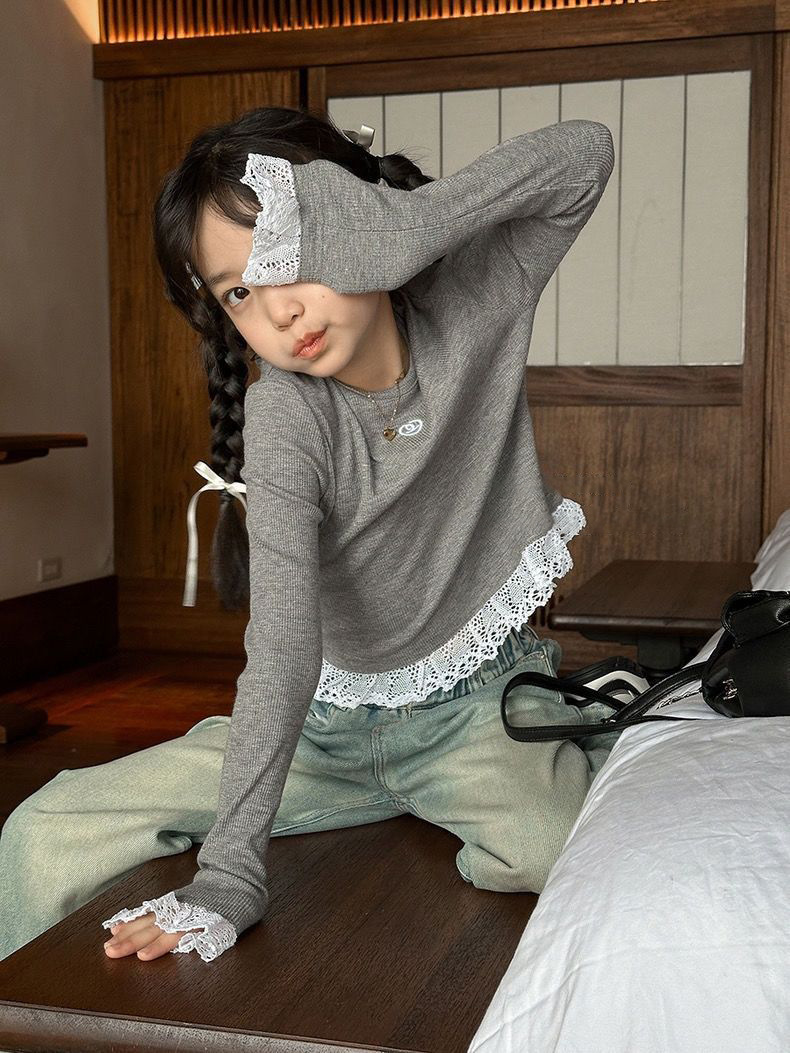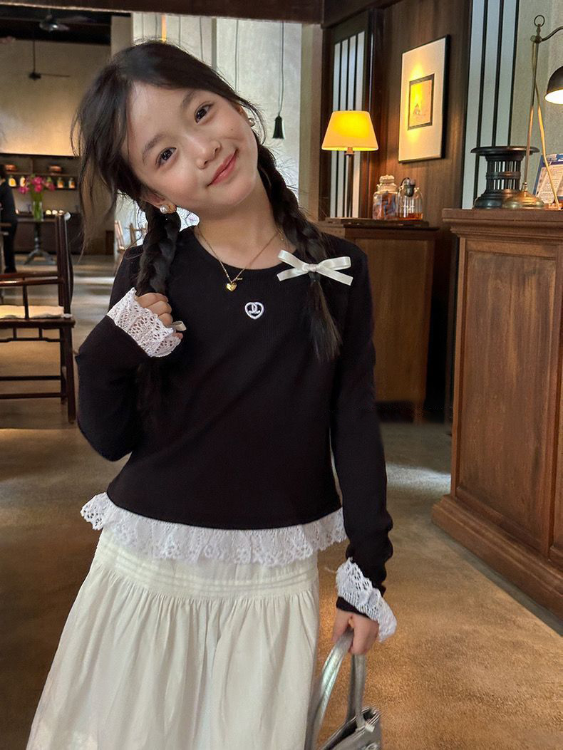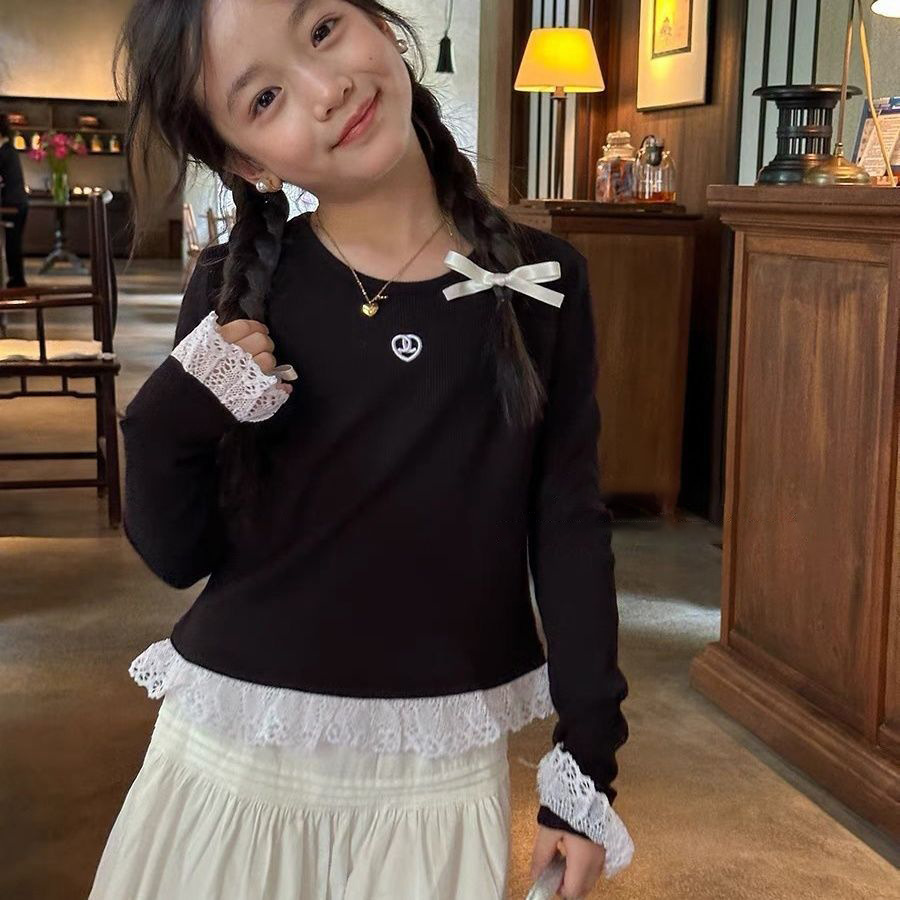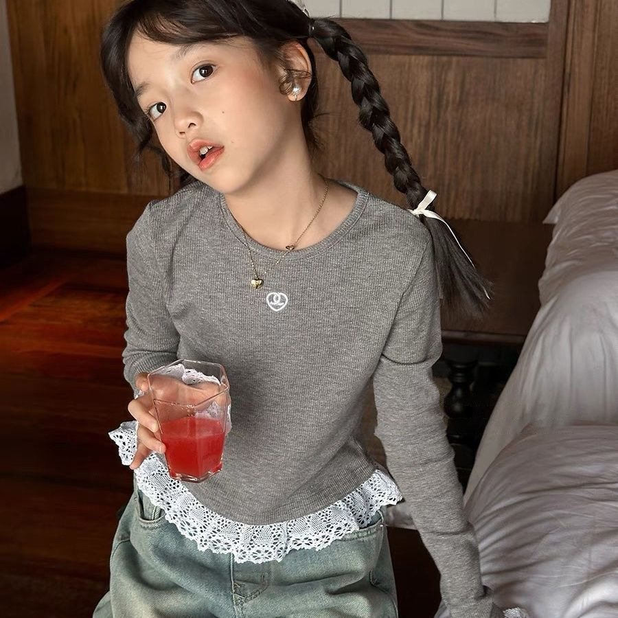 여자 티셔츠 2024 가을 새 레이스 바느질 슬림 핏 긴 소매베이스 셔츠 아기 소녀 탑 아동복스토어 가기