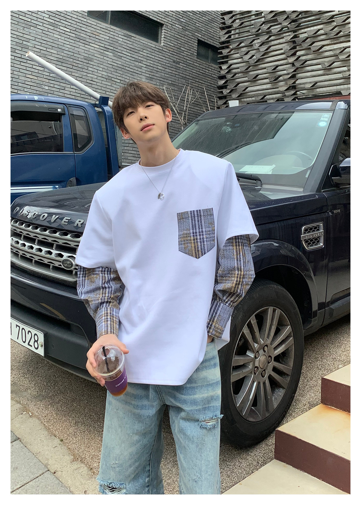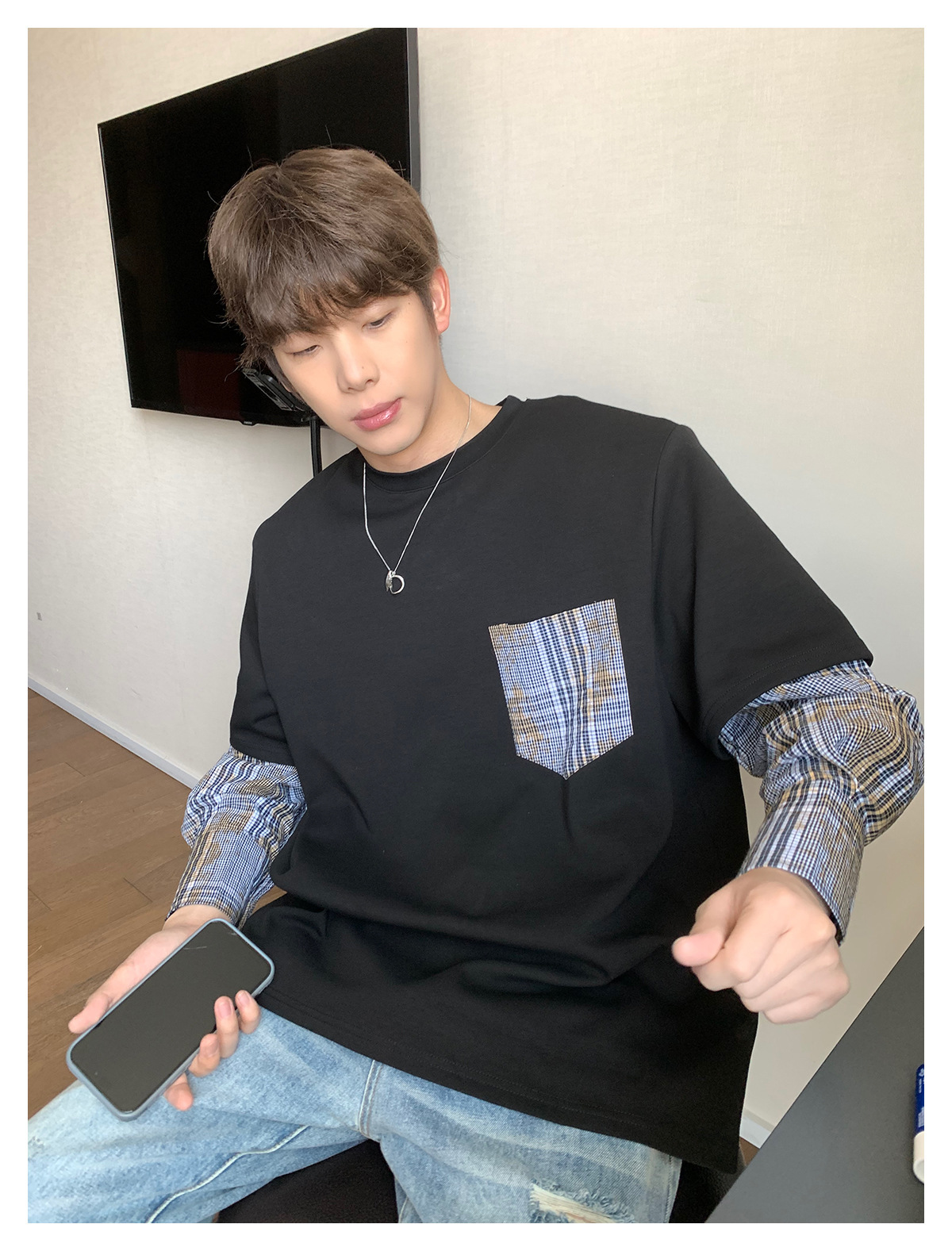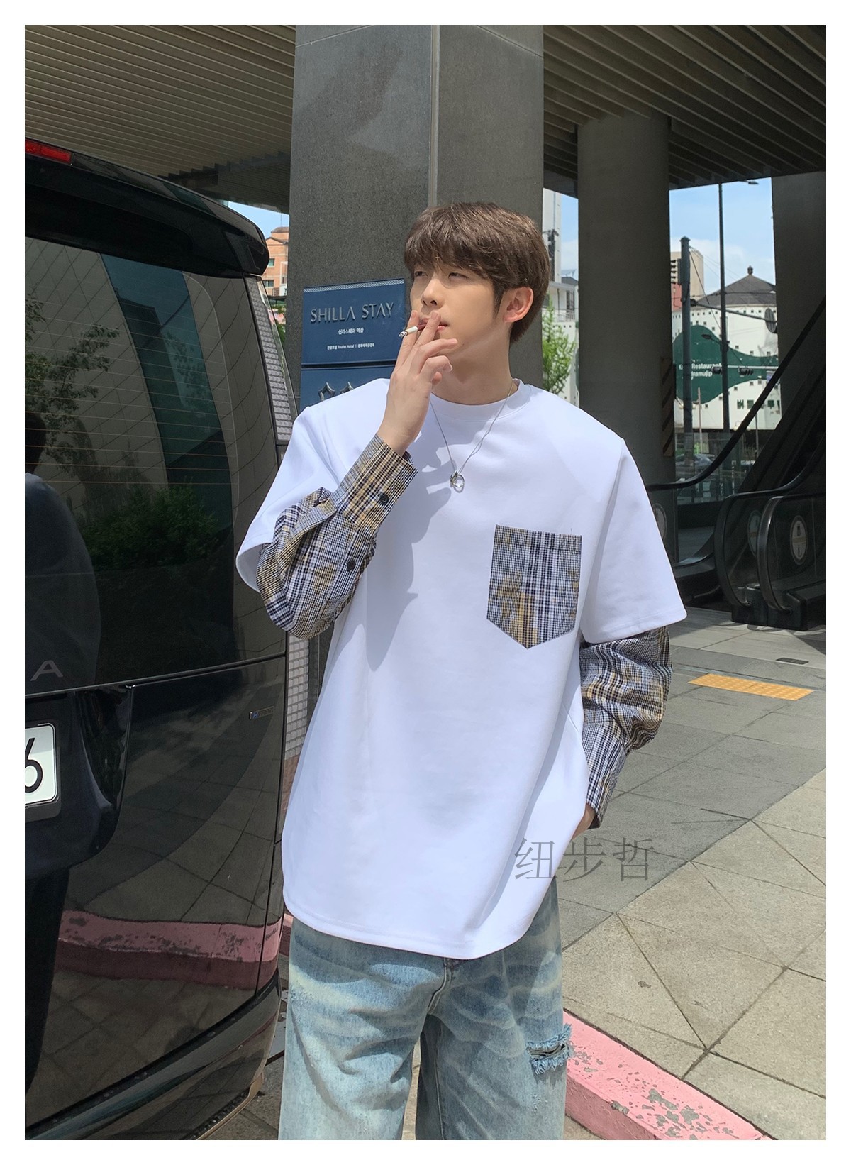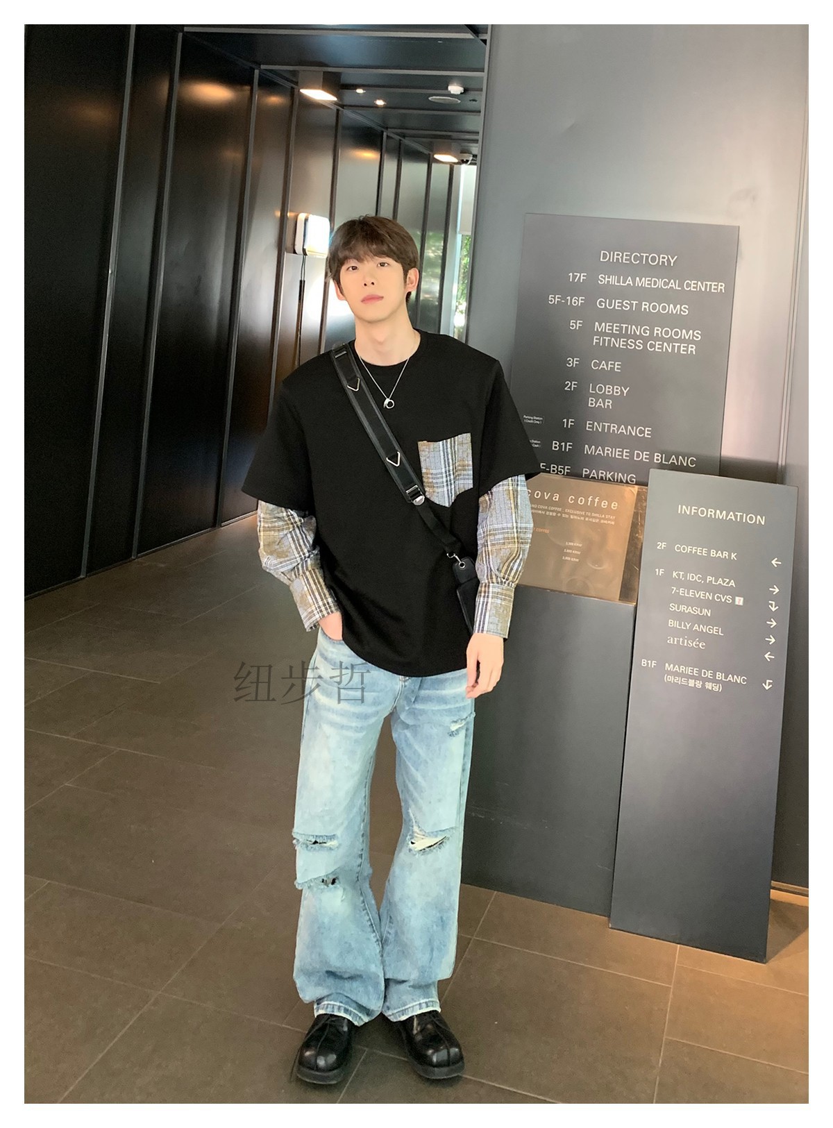 틈새 레트로 격자 무늬 바느질 가짜 투피스 긴팔 티셔츠 남성용 봄과 가을 느슨한 어깨 패드 디자인 센스 재킷 트렌드스토어 가기