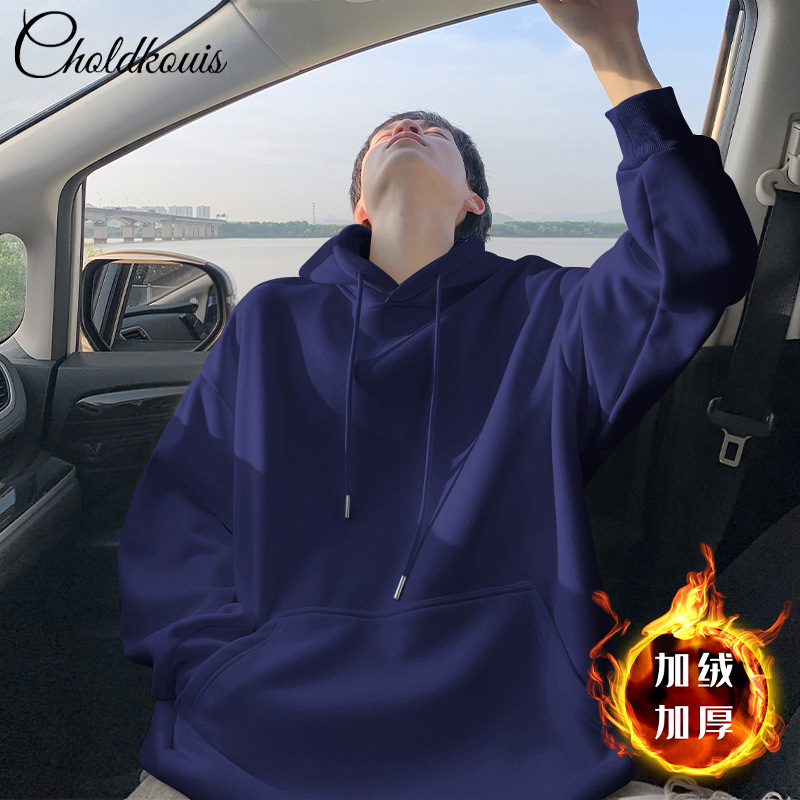 • 네이비 블루 후드 스웨트셔츠 플러스 벨벳 스타일 - 솔리드 컬러 [GL]