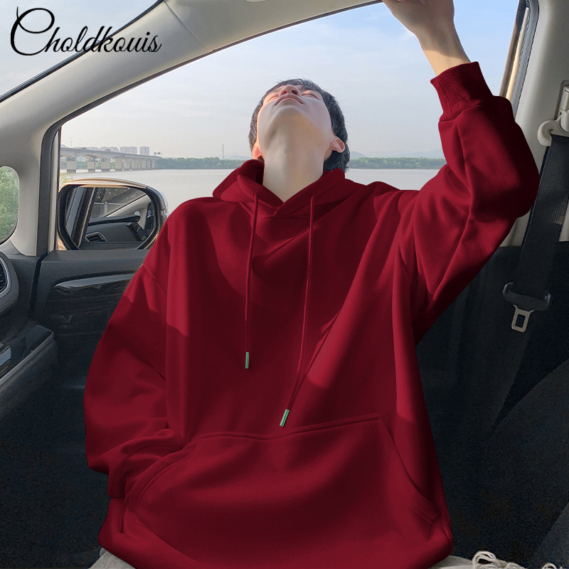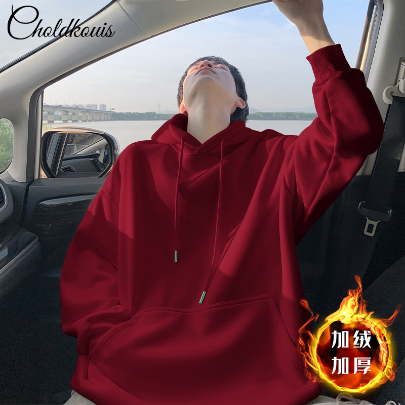 • 버건디 후드 스웨트셔츠 플러스 벨벳 스타일 - 솔리드 컬러 [GL]