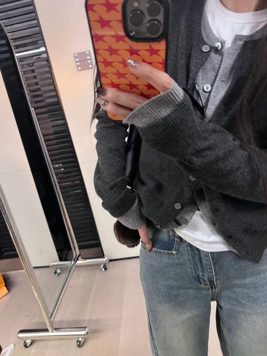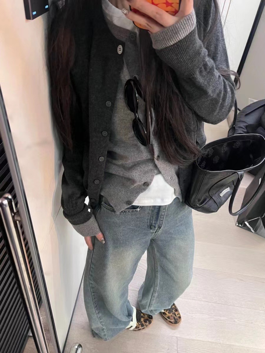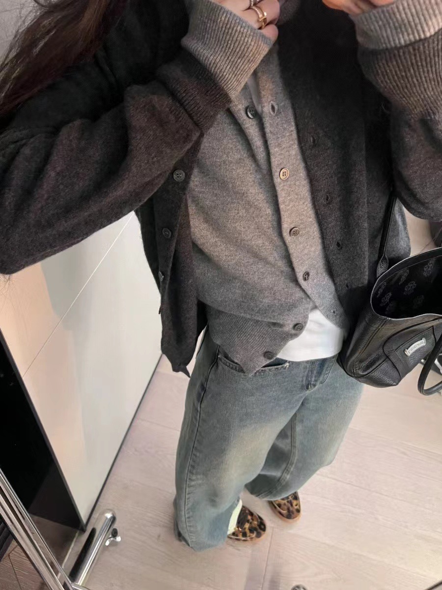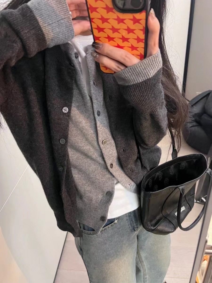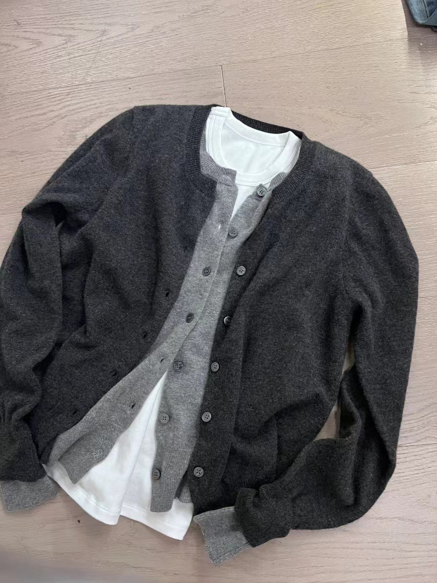 회색 가짜 2 피스 니트 카디건 스웨터 코트 여성용 봄 라운드 넥 슬림 올 매치 디자인 센스 스티칭 탑스토어 가기