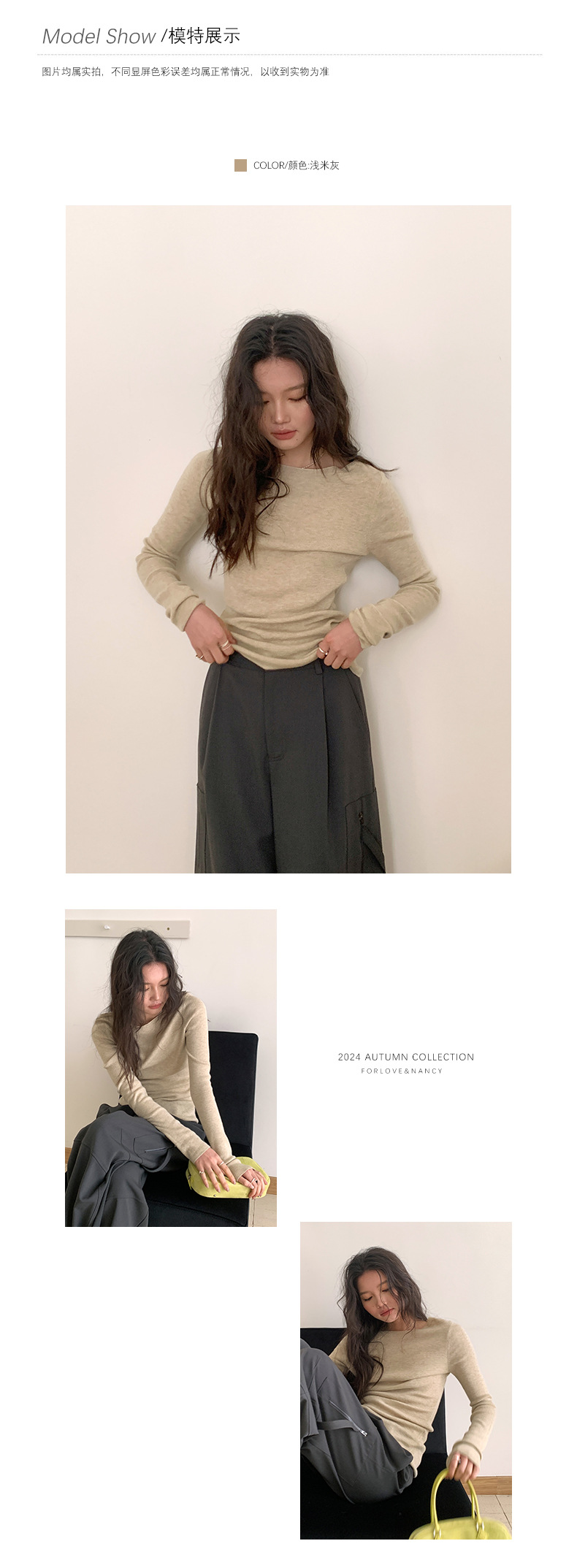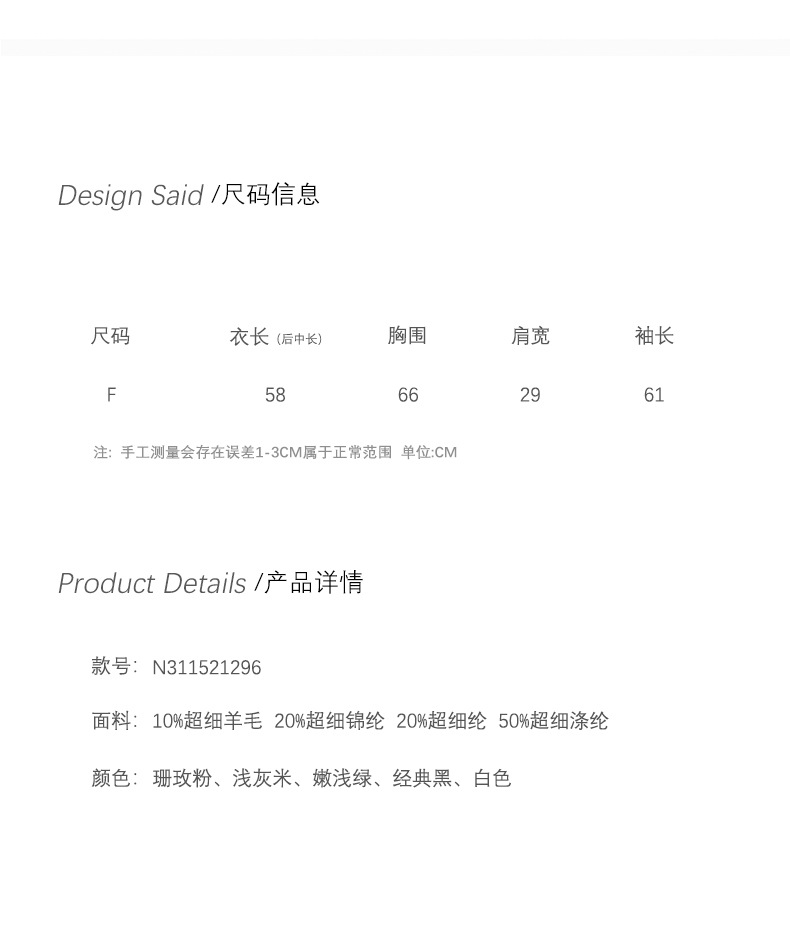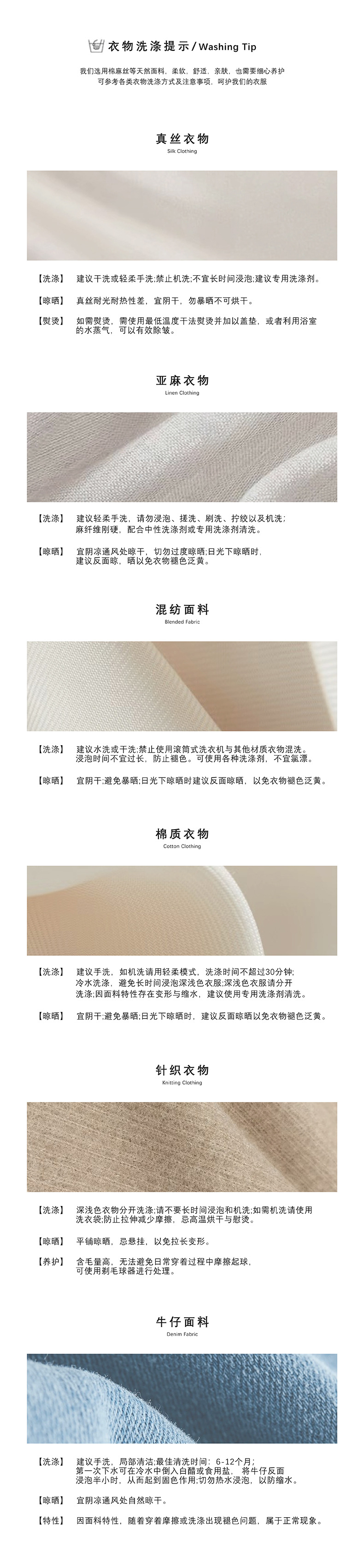 | 注意:毛衣掉毛属正常现象!并非质量问题!不可机洗!下单默认已读。 工厂在加工毛衣时,为了追求更好的外观和手感,会进行一定的处理,这也会导致在毛衣表面留有少许浮毛。这些浮毛在后续的穿着过程中,通过摩擦和洗涤会逐渐脱落。并不会影响毛衣的质量。对于掉毛问题可以尝试一些简单的处理方法。例如,使用透明胶或者粘毛器将浮毛清除,或者选择使用抗静电洗衣液清洗毛衣,以减少掉毛的情况。通过适当的处理和保养,可以大大减轻这种现象。 毛衣购前须知:关于缩水的贴心提示 亲爱的顾客,感谢您选择我们的毛衣产品!为了确保您购买到称心如意的衣物,请在选购前仔细阅读以下关于毛衣缩水的须知事项: 1. 缩水是天然面料的常见特性 羊毛、羊绒、棉等天然材质因纤维特性,在洗涤或受热时可能出现轻微缩水(约3%-5%),这属于正常现象,并非质量问题。 合成纤维(如涤纶、腈纶)缩水率较低,但透气性和保暖性相对较弱。 2. 选购时建议“留有余地” 若喜欢合身效果,可按正常尺码选择;若担心缩水,建议选大1码(尤其是高羊毛含量款式)。 参考商品详情页的「面料成分」和「洗涤建议」,高比例羊毛(>50%)更需注意护理方式。 3. 正确的护理能减少缩水风险 洗涤方式:建议手洗或选择洗衣机的“羊毛模式”,水温≤30℃,避免长时间浸泡。 晾晒方法:平铺阴干,切勿悬挂或暴晒,防止变形。 熨烫技巧:中低温隔布熨烫,避免直接接触纤维。 |