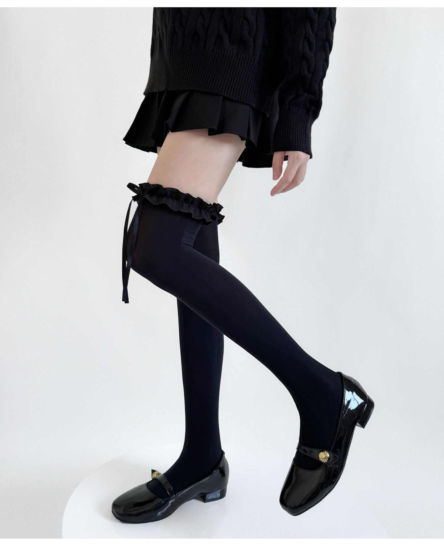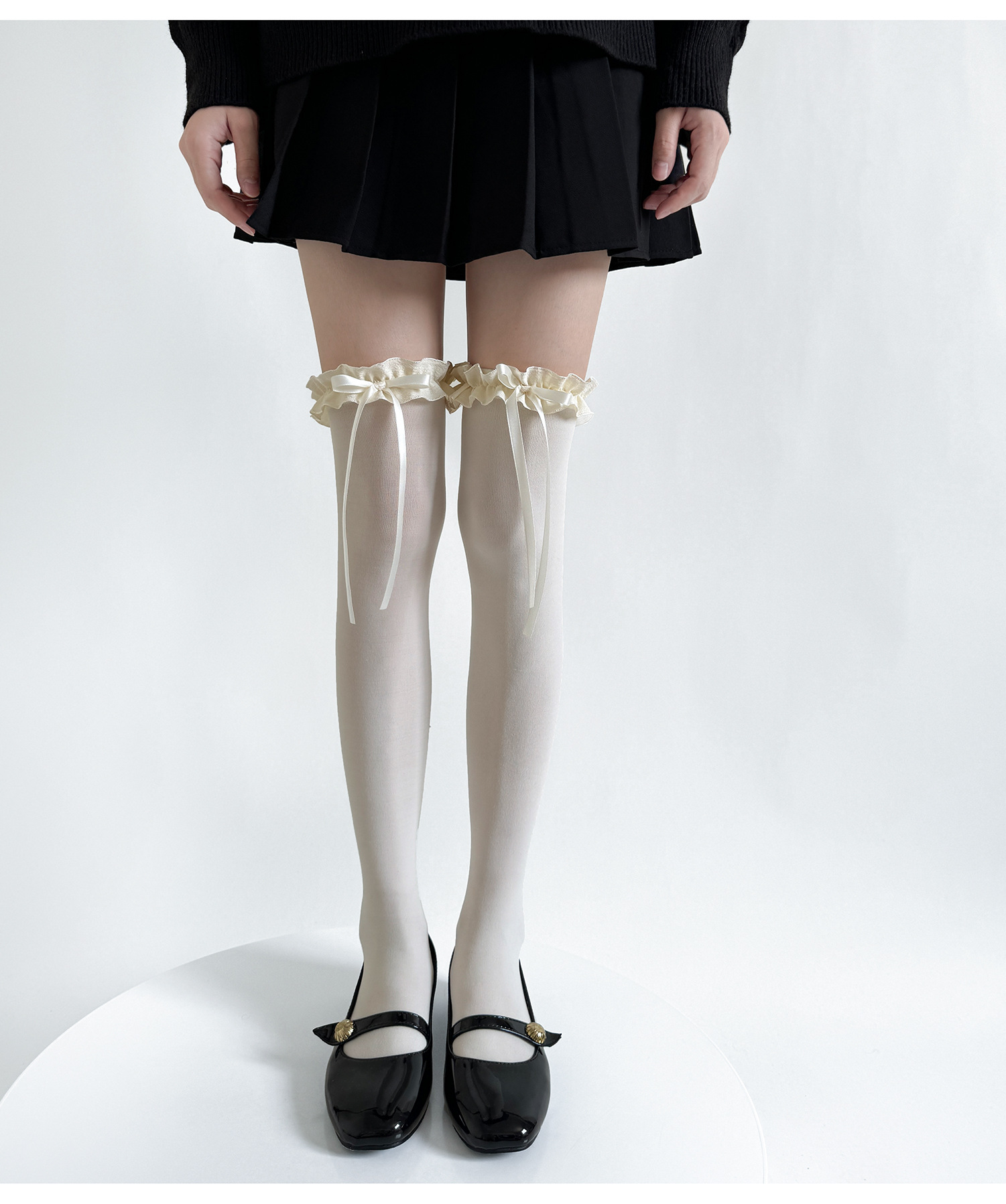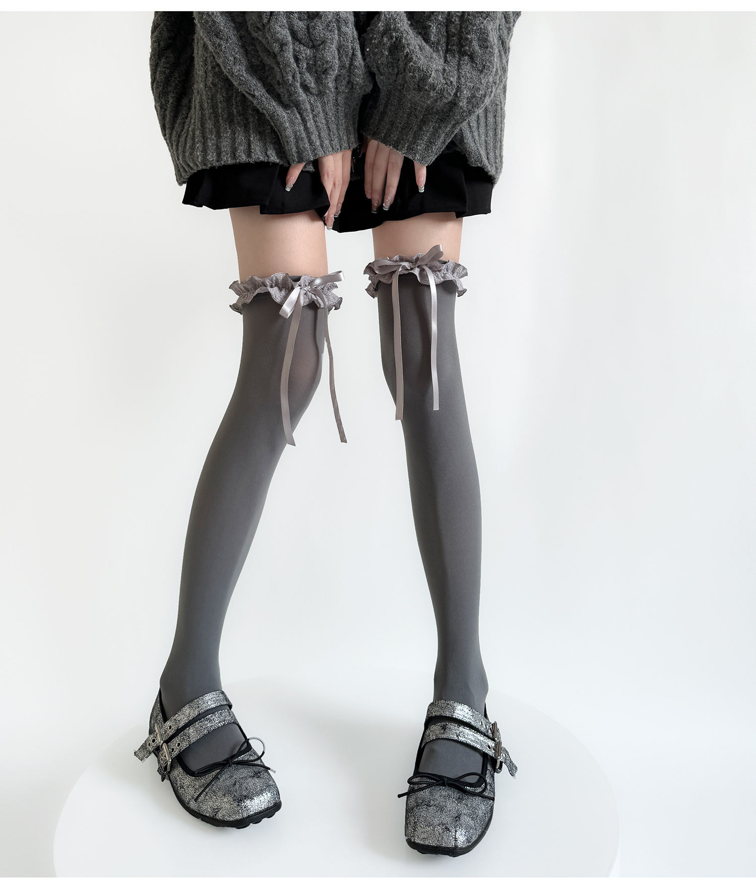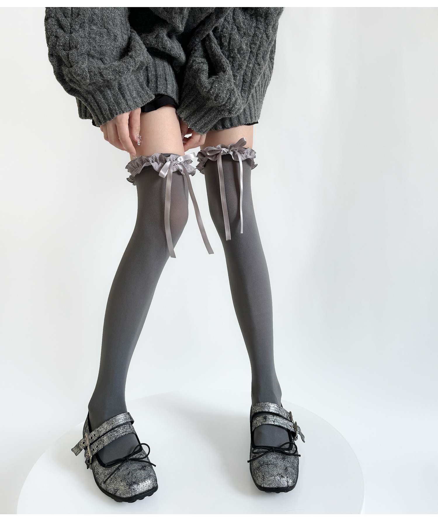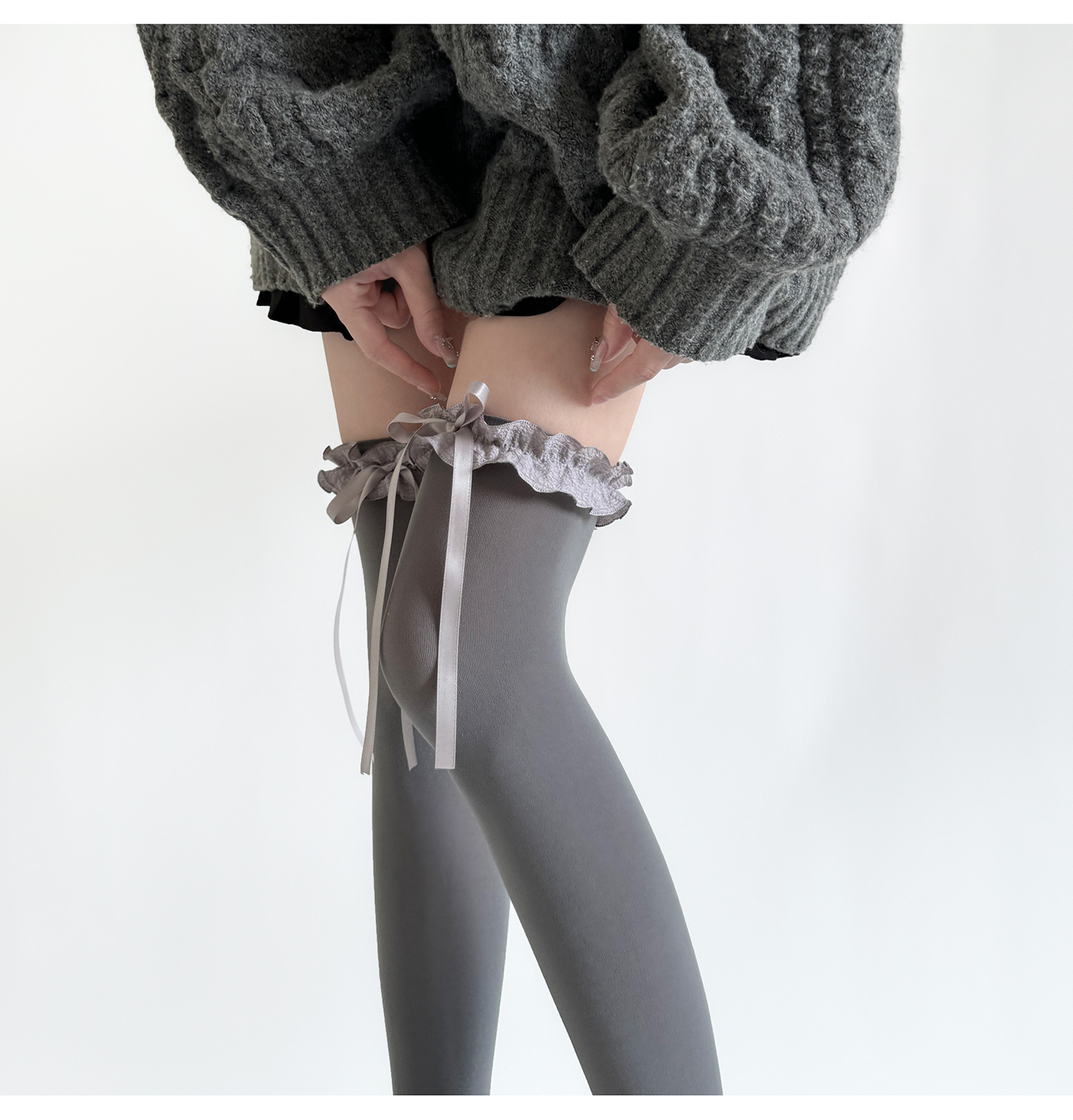 로리타 우유 흰색 무릎 양말 여성 벨벳 달콤한 레이스 활 레이스 긴 튜브 양말 회색 종아리 양말
