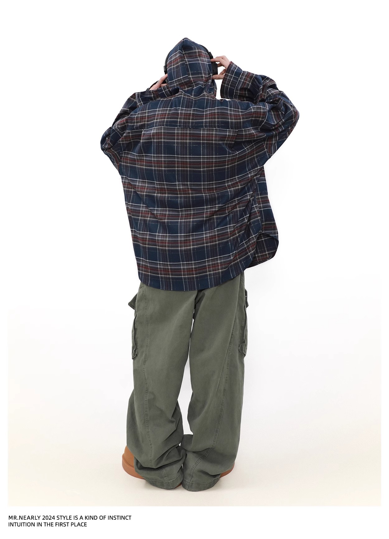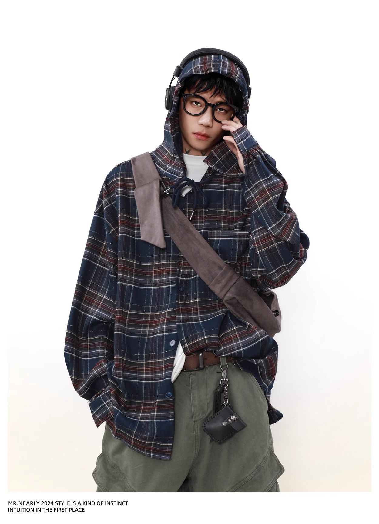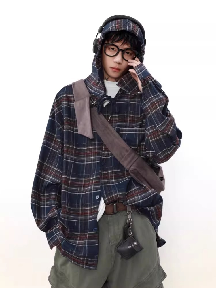 아메리칸 스타일 빈티지 콘트라스트 플레이드 후드 긴팔 셔츠 남성용 트렌디 스트리트 루즈 캐주얼 올 매치 셔츠 재킷