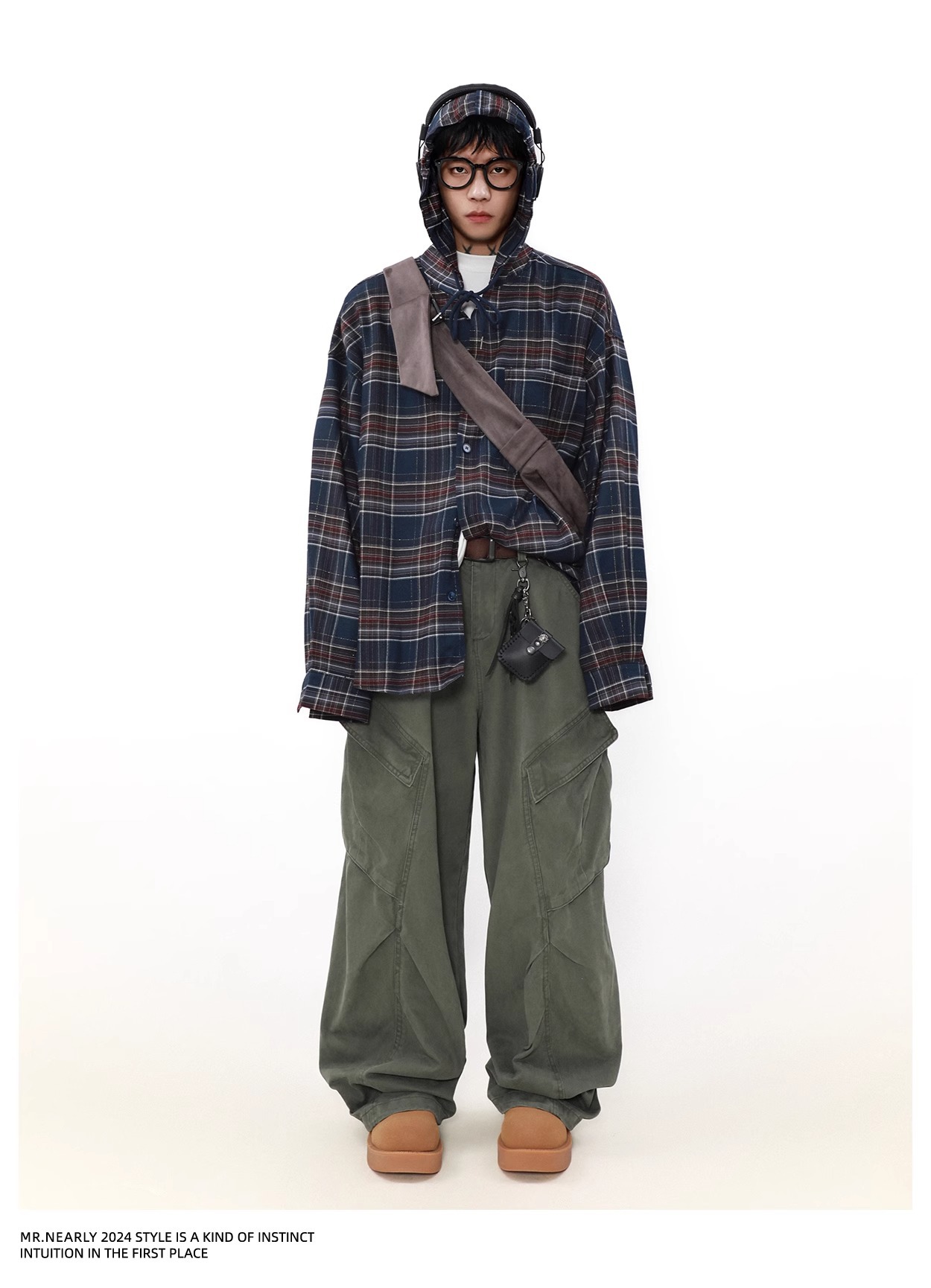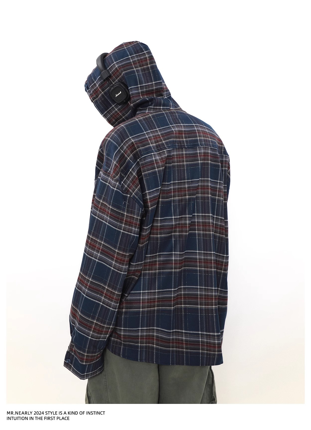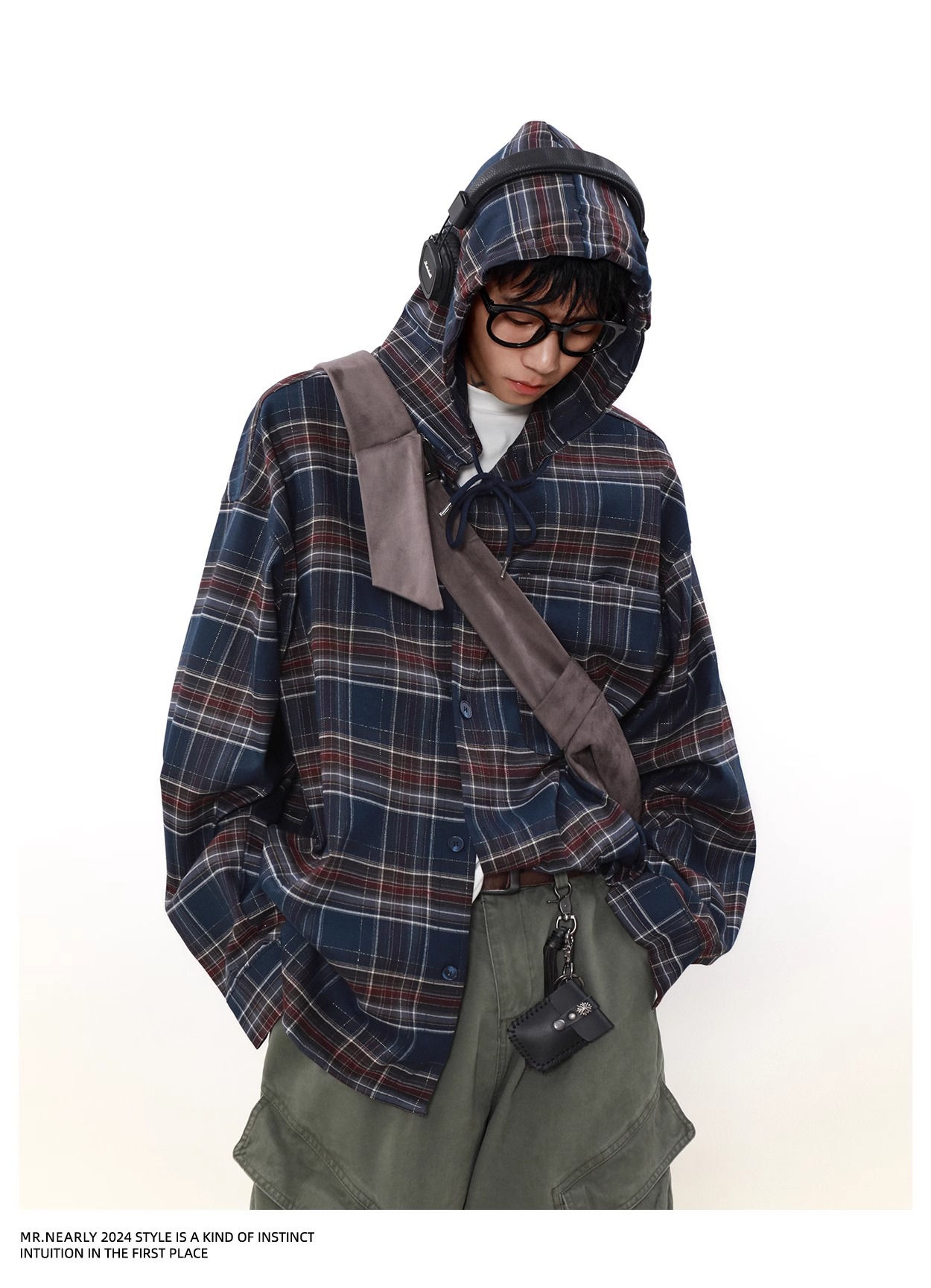아메리칸 스타일 빈티지 콘트라스트 플레이드 후드 긴팔 셔츠 남성용 트렌디 스트리트 루즈 캐주얼 올 매치 셔츠 재킷