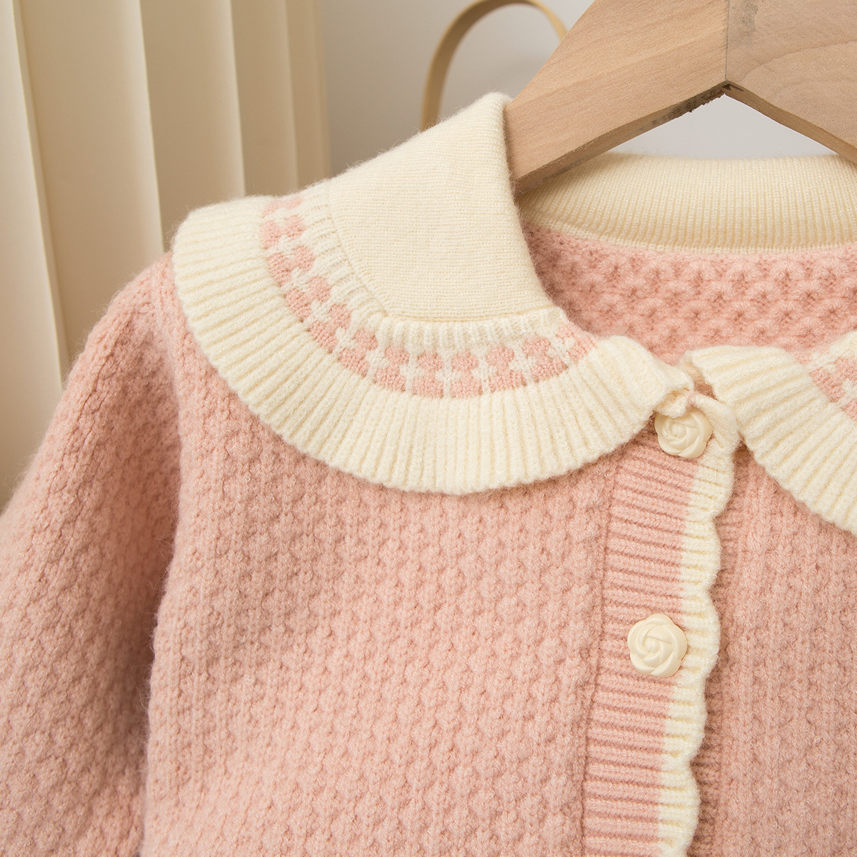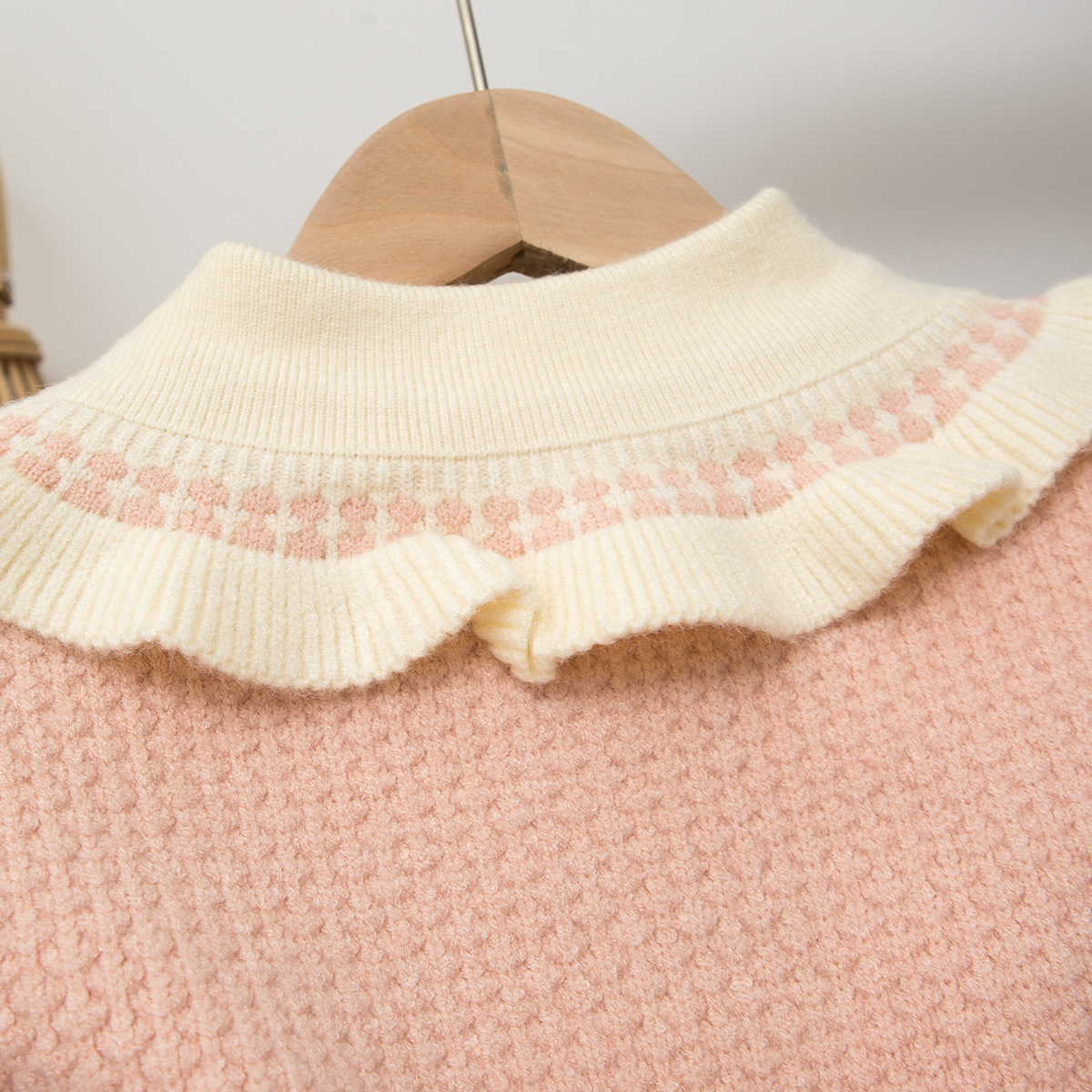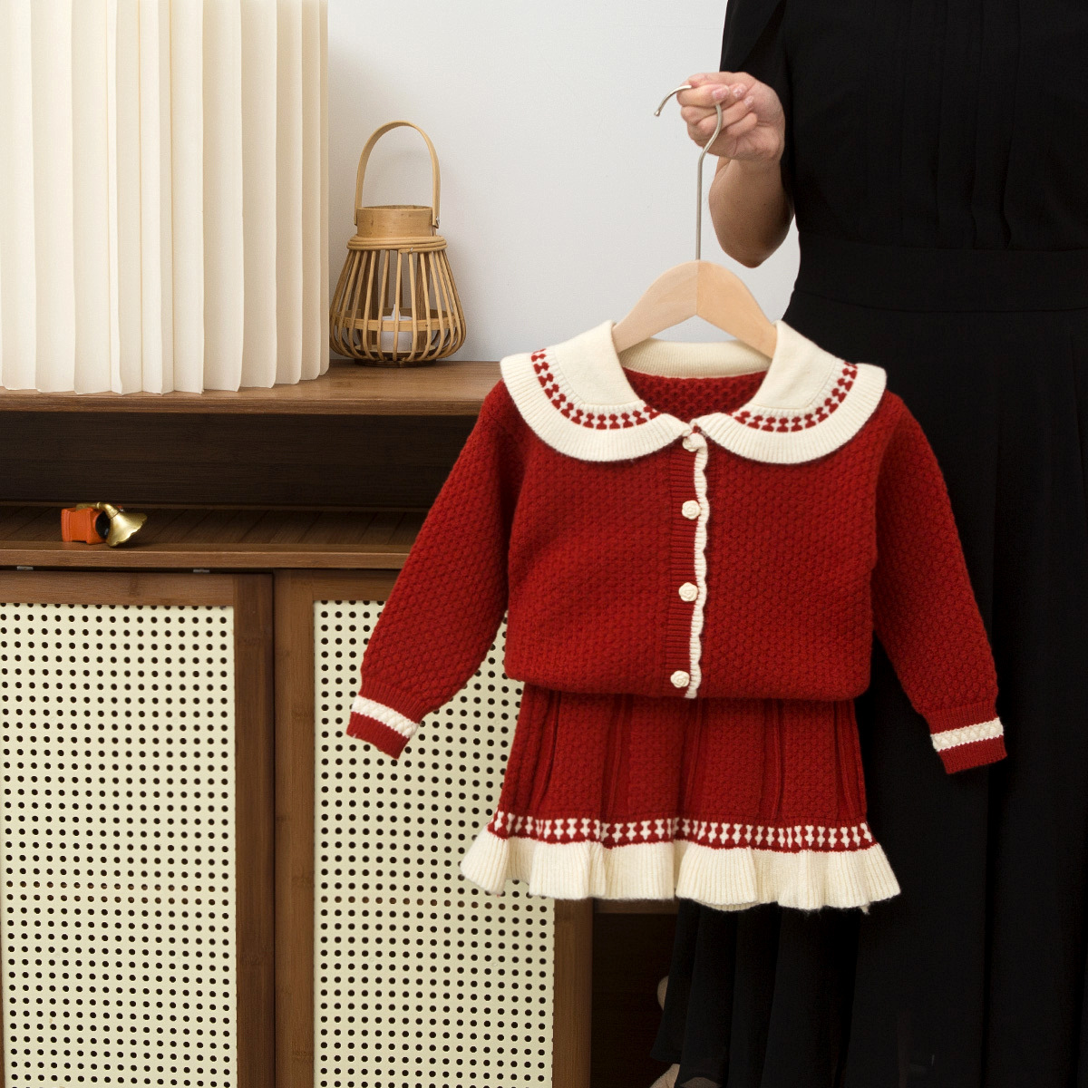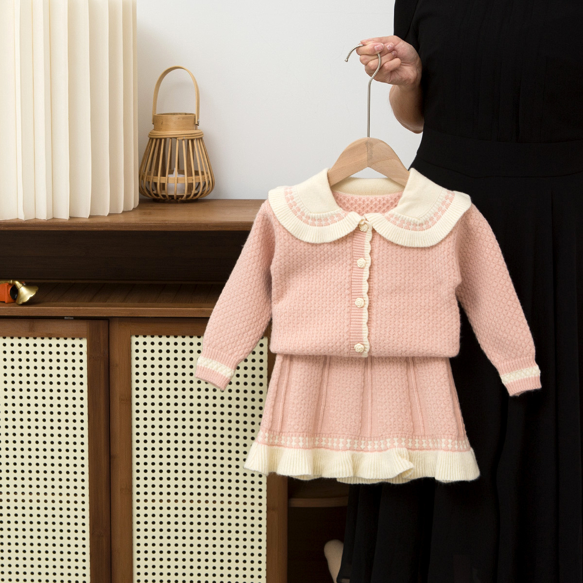 2024 새로운 어린이 스웨터 원피스 세트 니트 칼리지 스타일 귀여운 단색 옷깃 외부 착용 아기 소녀