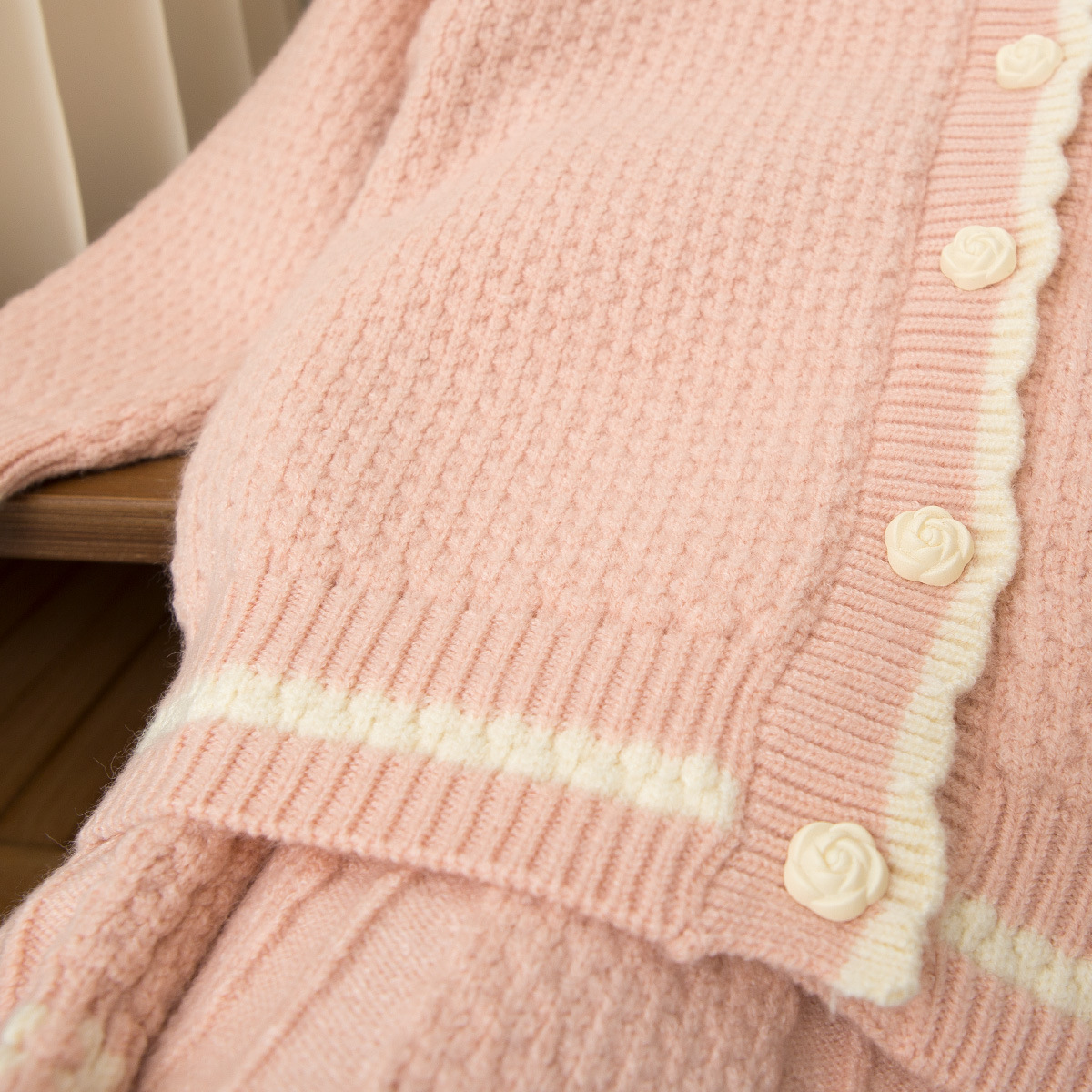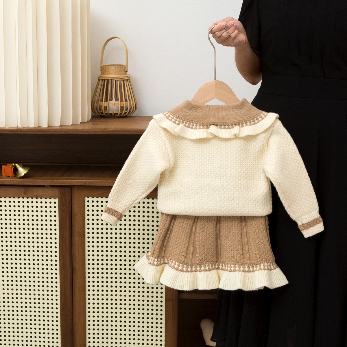 2024 새로운 어린이 스웨터 원피스 세트 니트 칼리지 스타일 귀여운 단색 옷깃 외부 착용 아기 소녀스토어 가기