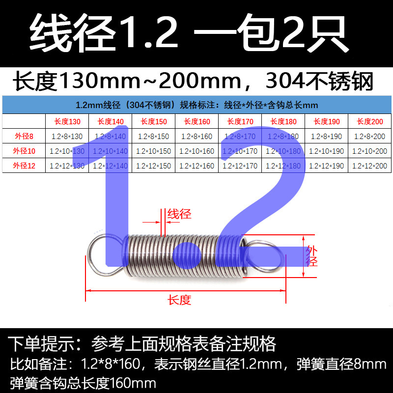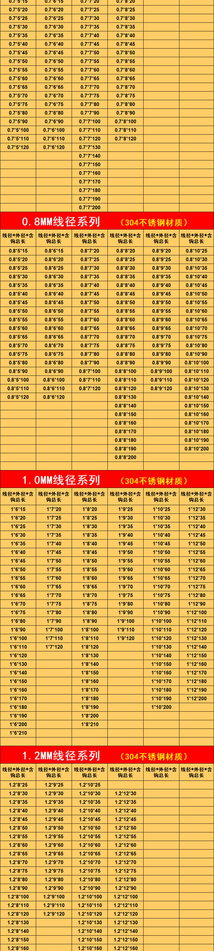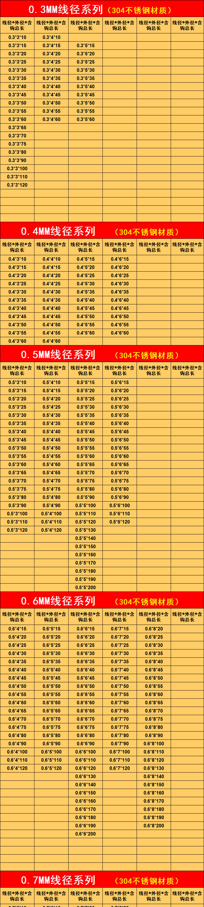 以下为不锈钢拉簧尺寸表格