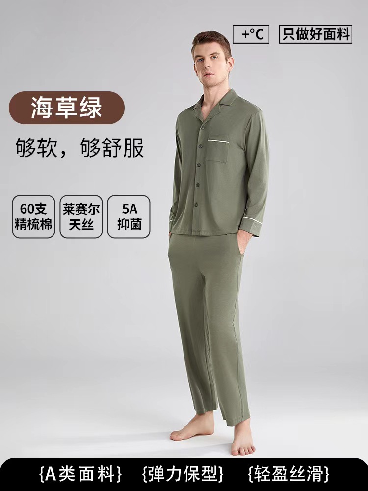 [5A 항균] 봄과 가을 긴 소매 텐셀 여성용 카디건 남자 잠옷 옷깃, 가슴 패드가 달린 옷깃