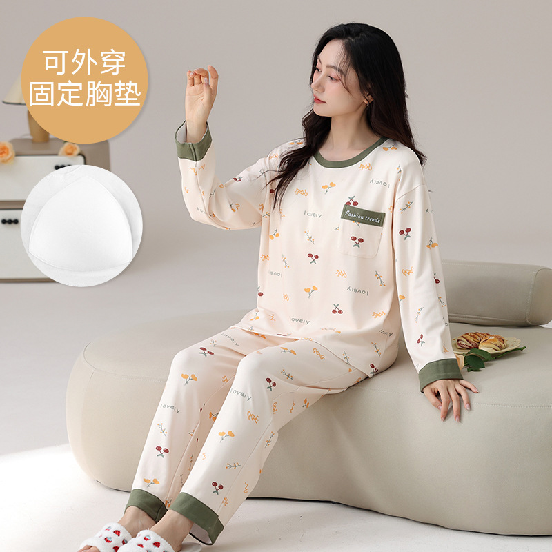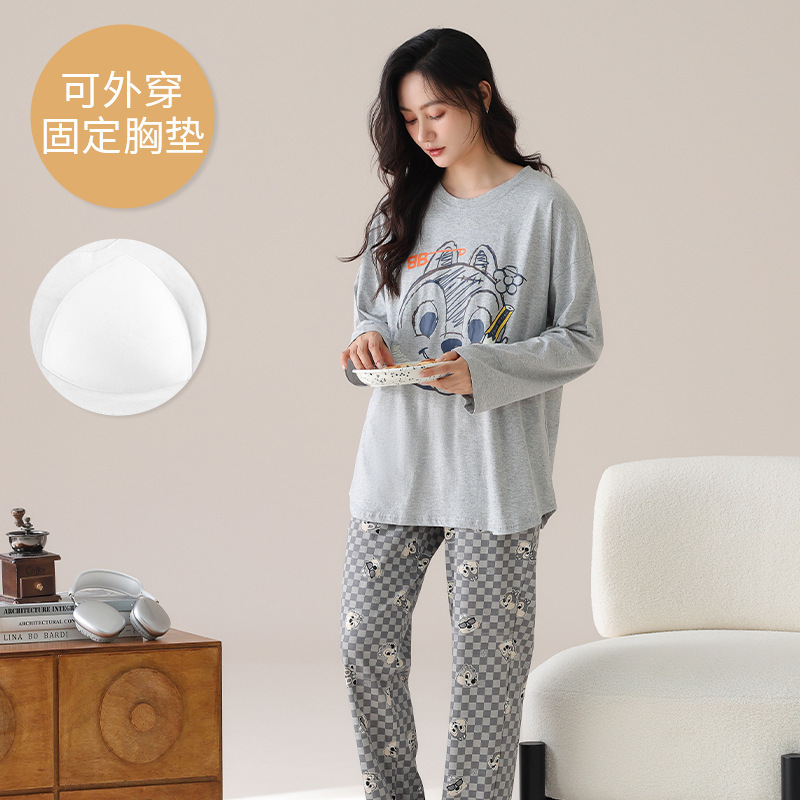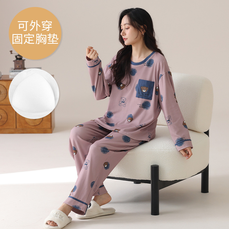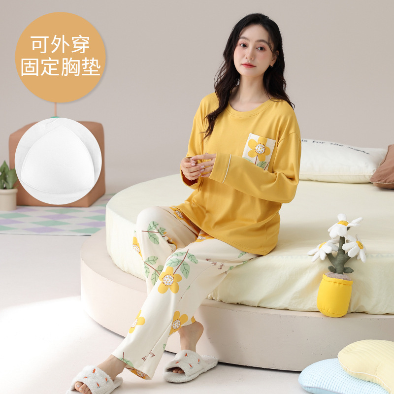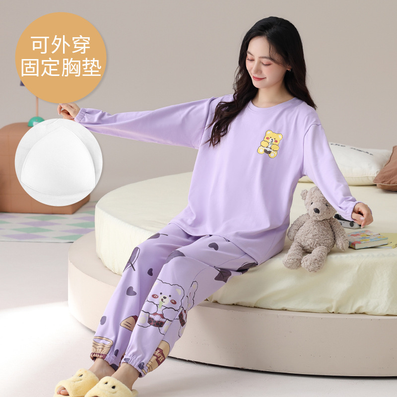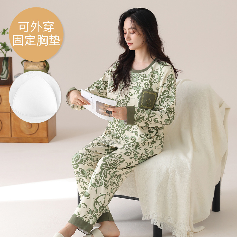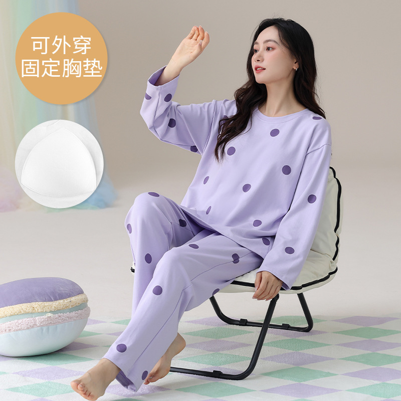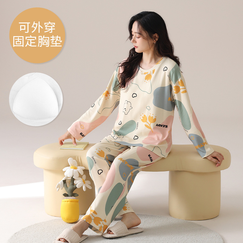 봄 및 가을 가슴 패드가 달린 면화 파자마 여성용 긴팔 세트 겉옷 무료 브래지어 안티 범프 홈 옷스토어 가기
