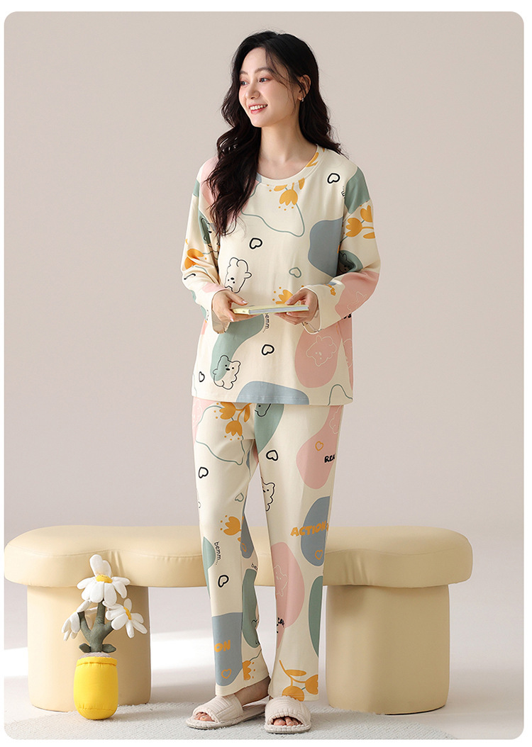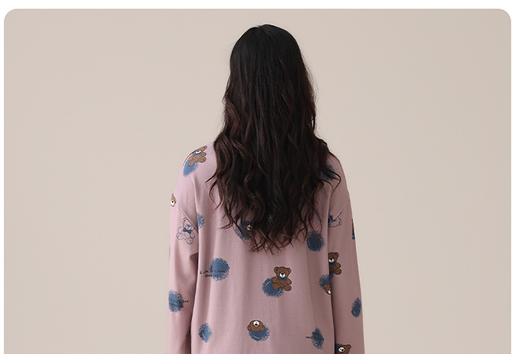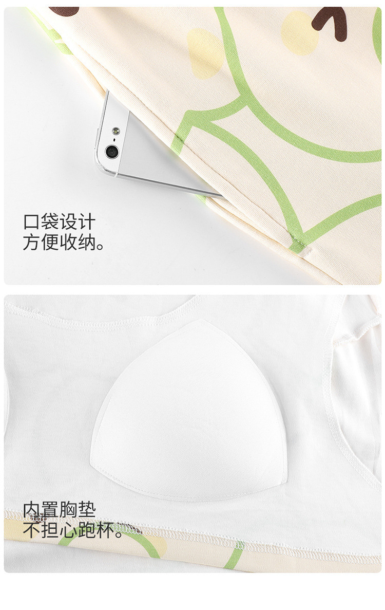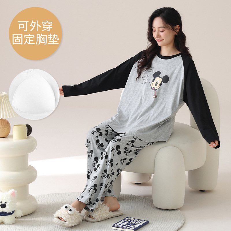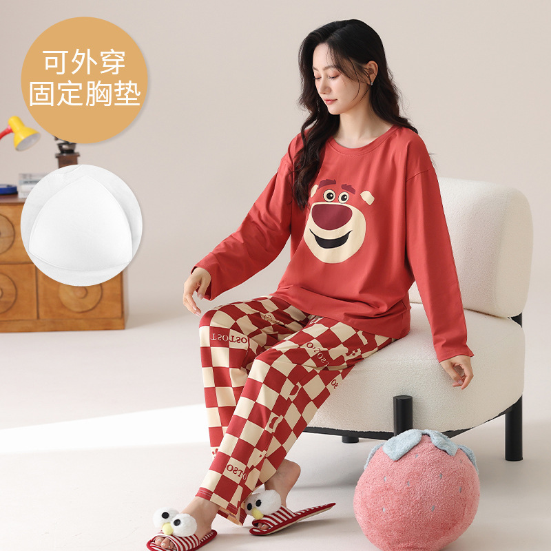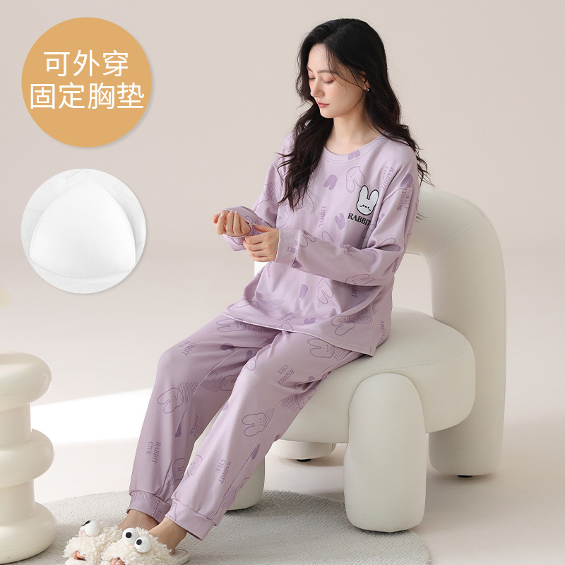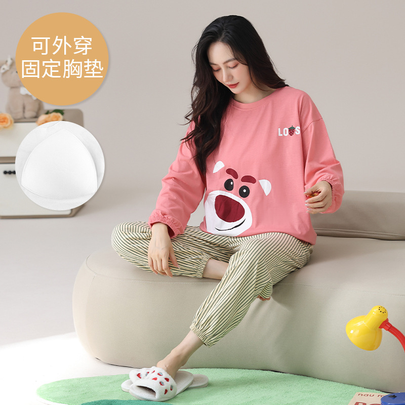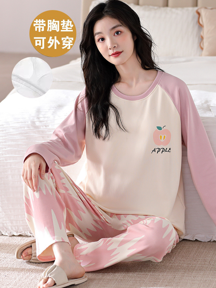 봄 및 가을 가슴 패드가 달린 면화 파자마 여성용 긴팔 세트 겉옷 무료 브래지어 안티 범프 홈 옷스토어 가기