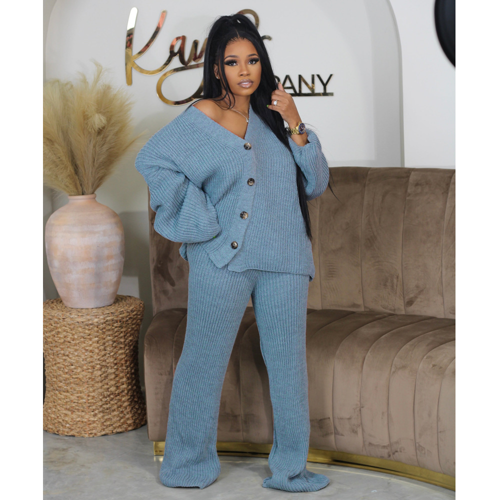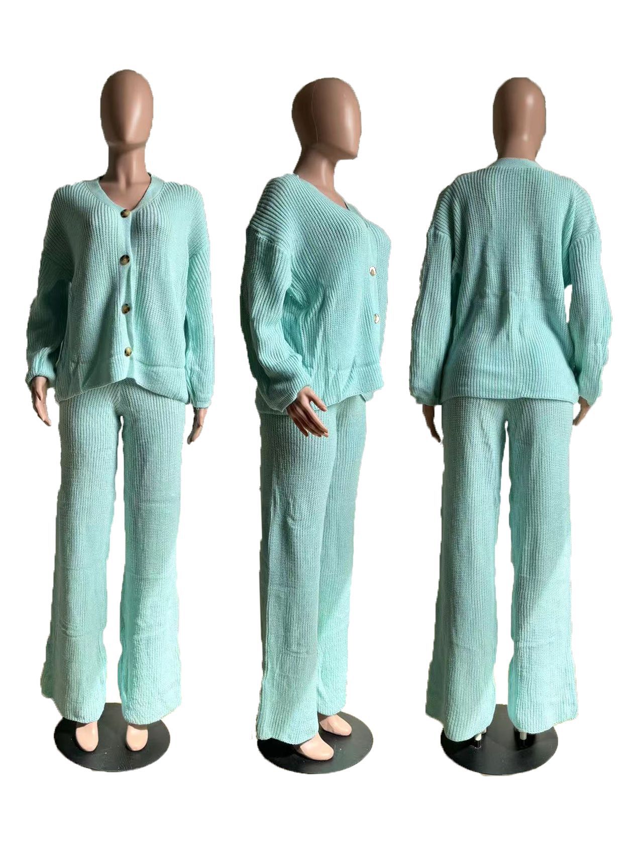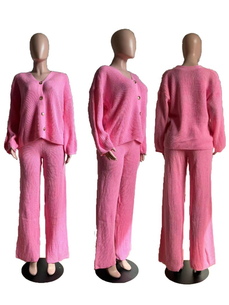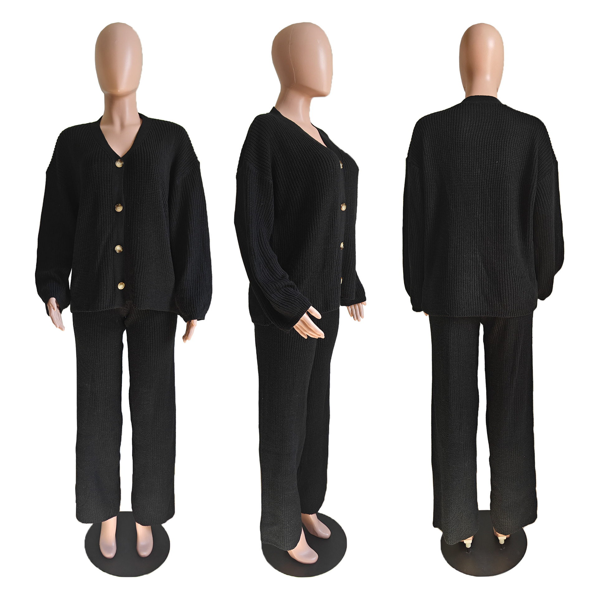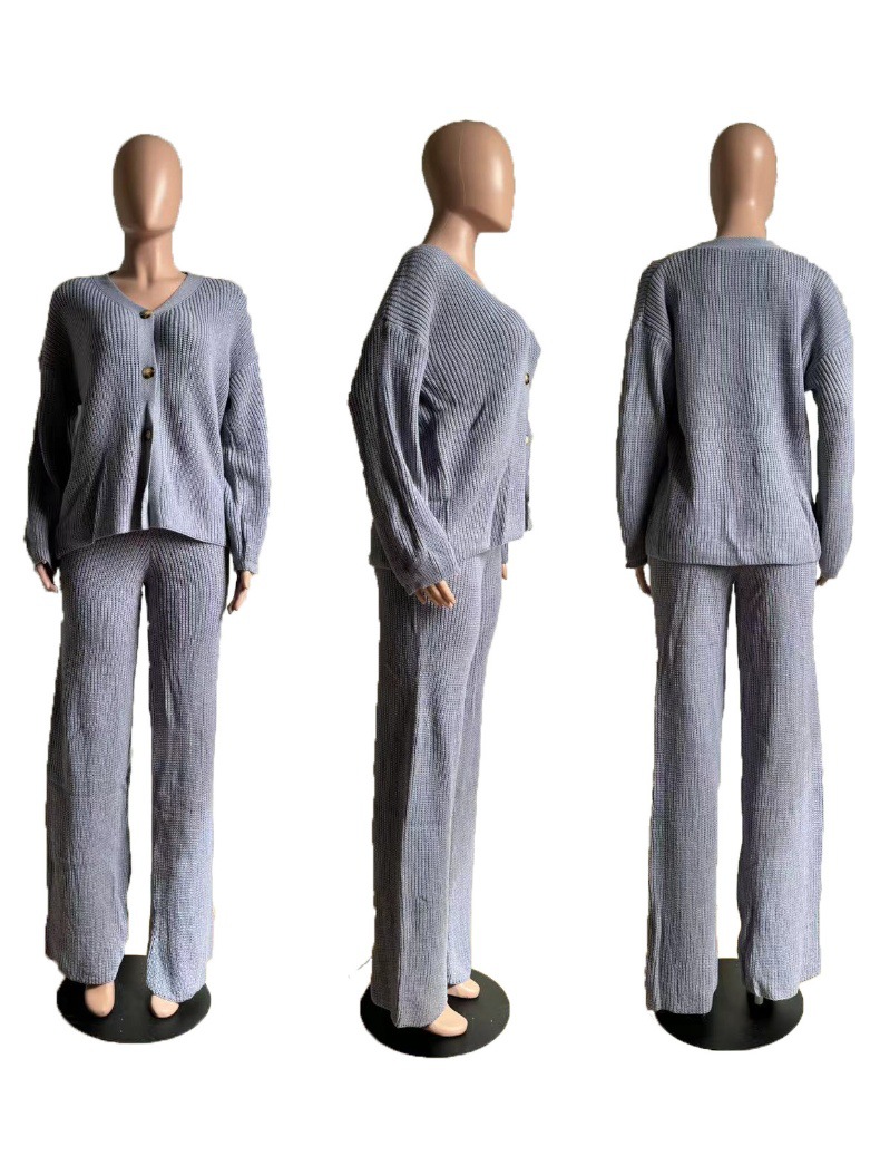 CN0224 유럽과 미국 여성의 2024 가을과 겨울 새로운 단색 V 넥 브레스트 카디건 넓은 다리 바지 스웨터 세트