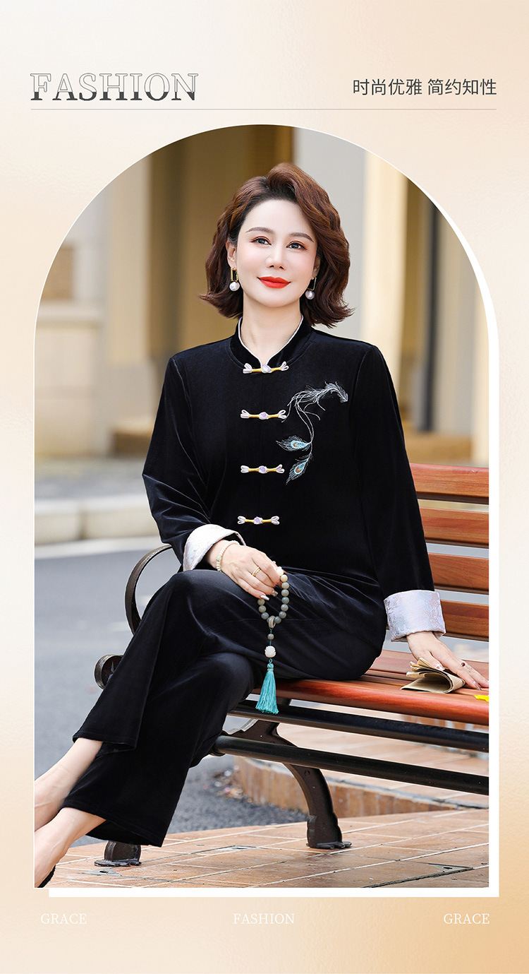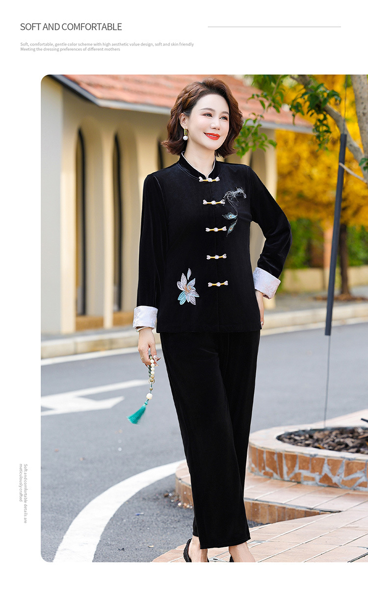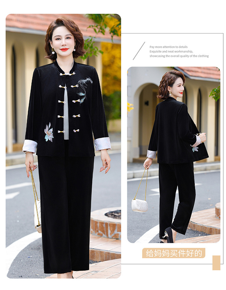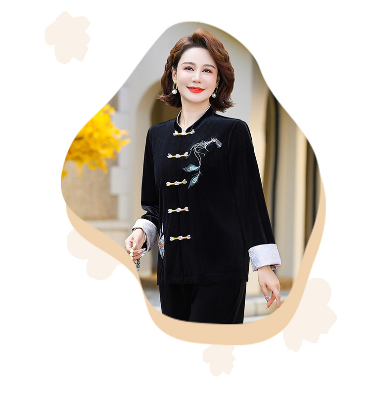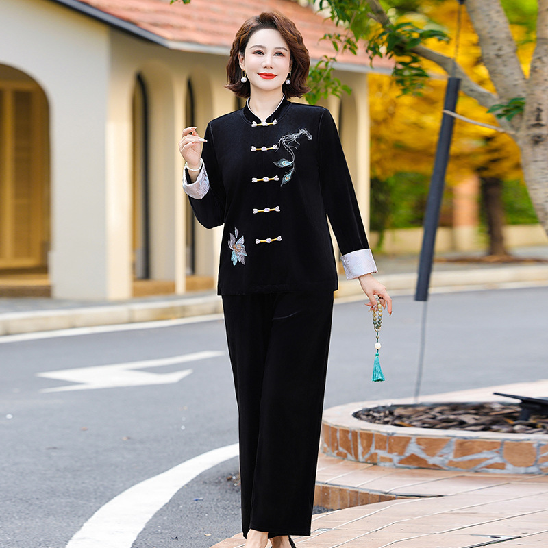 어머니 가을 새로운 중국식 골드 벨벳 세트 새로운 중년 및 노인 여성 의류 Guofeng 자수 당나라 세트 재킷 투피스 세트