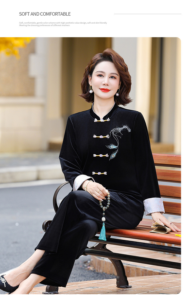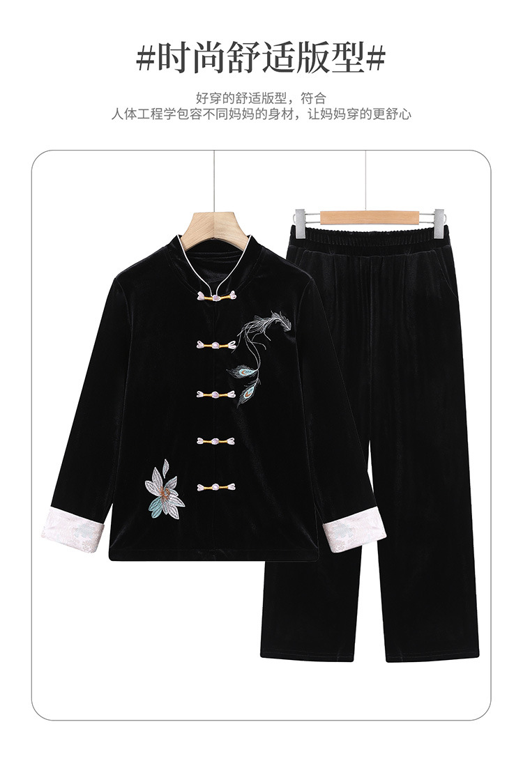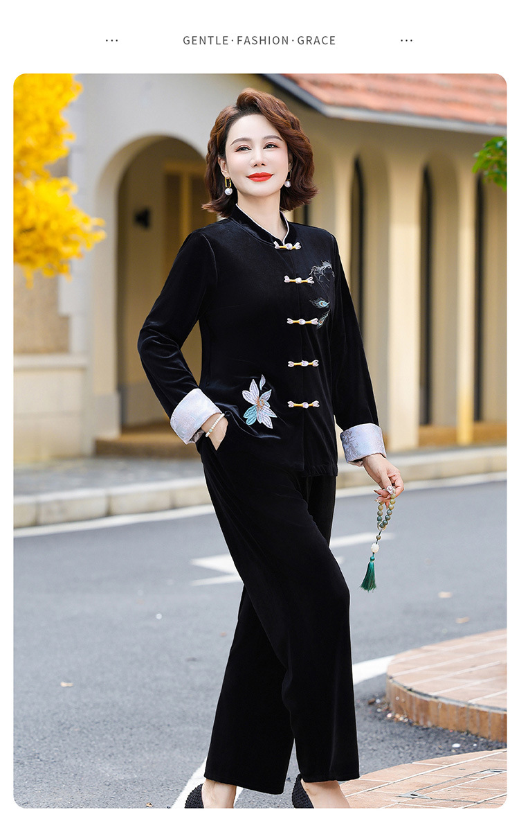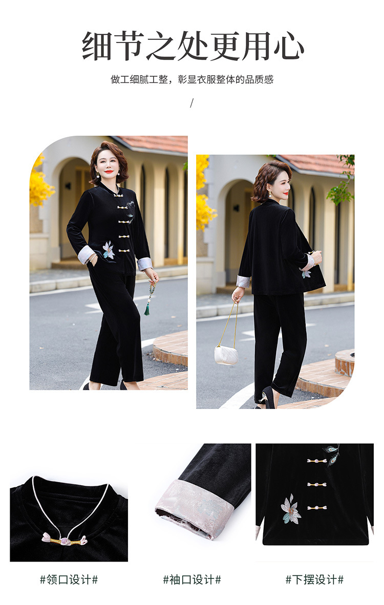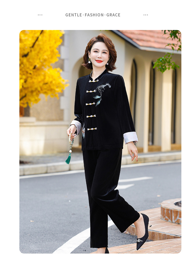 어머니 가을 새로운 중국식 골드 벨벳 세트 새로운 중년 및 노인 여성 의류 Guofeng 자수 당나라 세트 재킷 투피스 세트