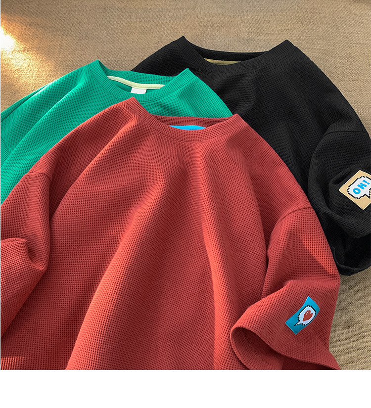 와플 반팔 티셔츠 남성용 화이트 여름 느슨한 반팔 Ins 홍콩 스타일 패턴베이스 셔츠, 둥근 목 자수