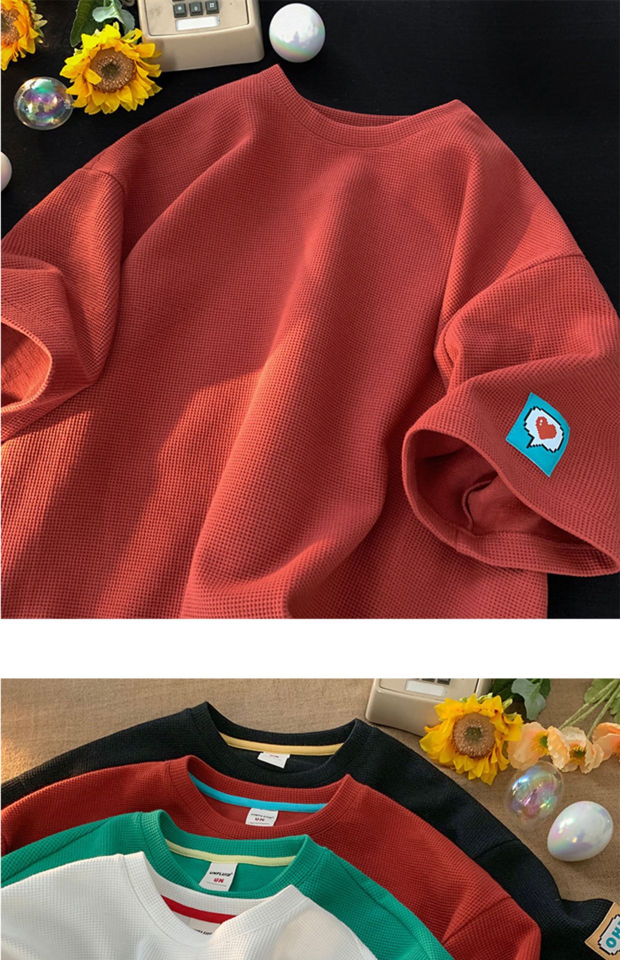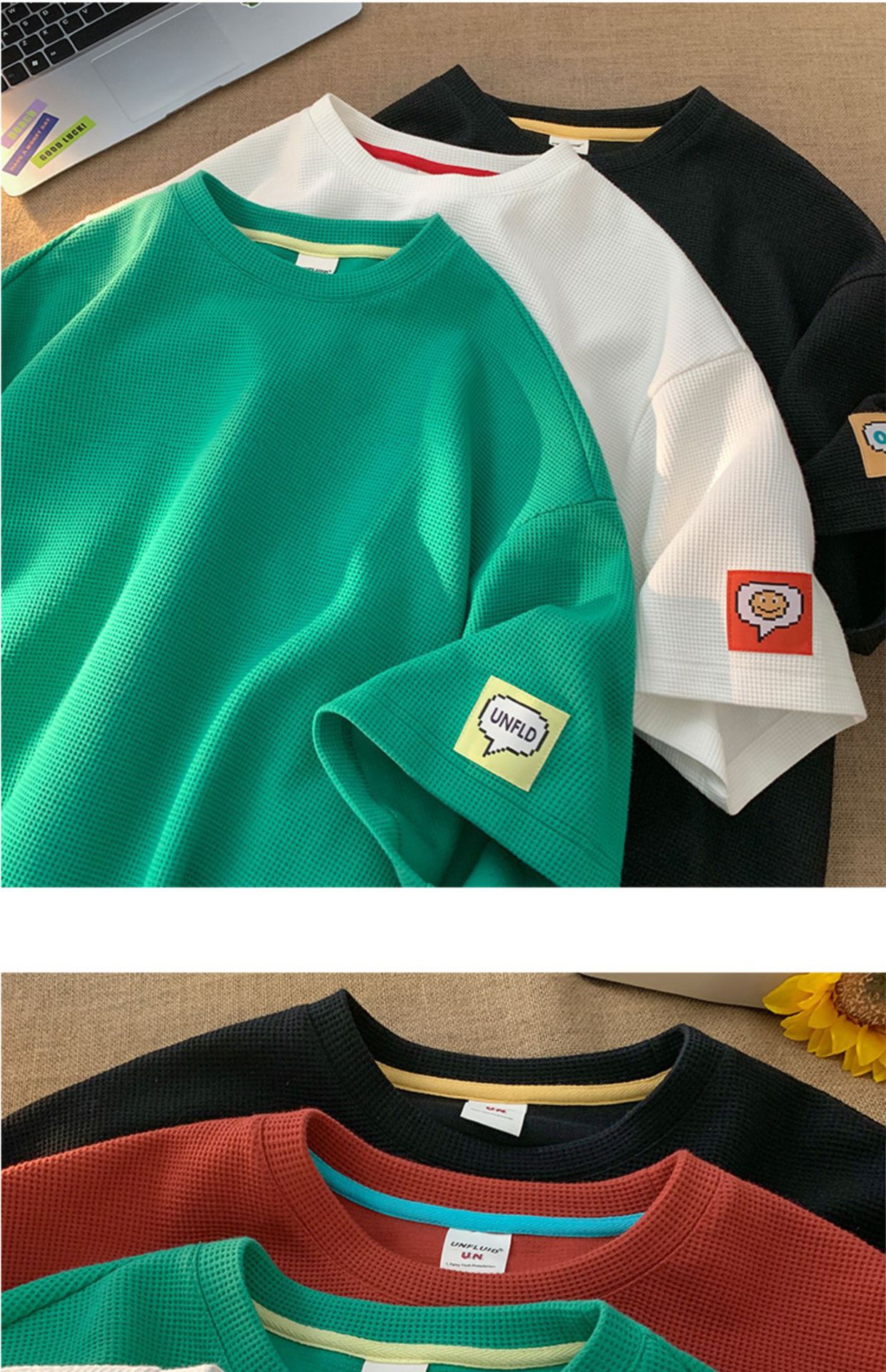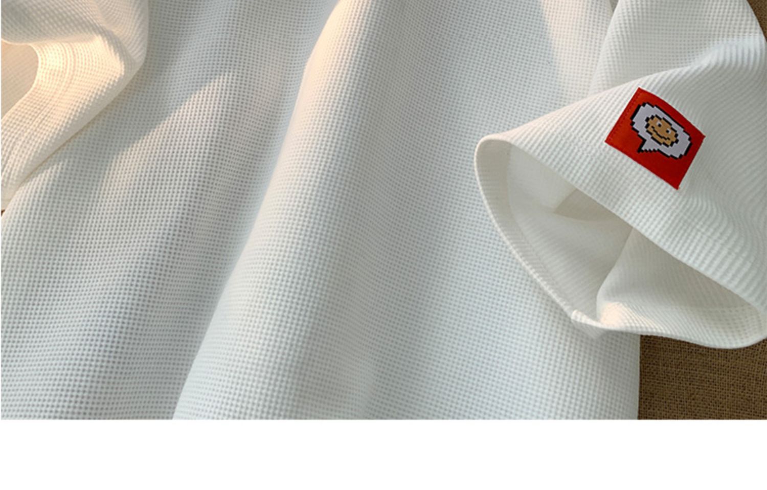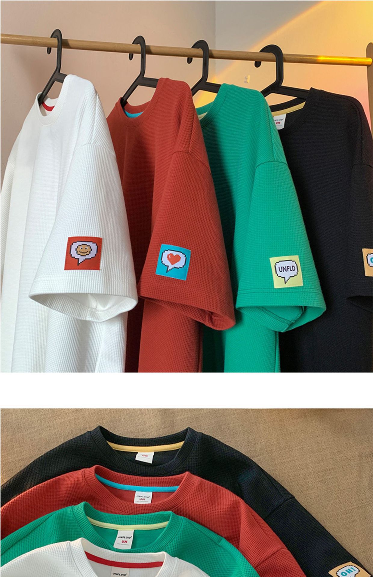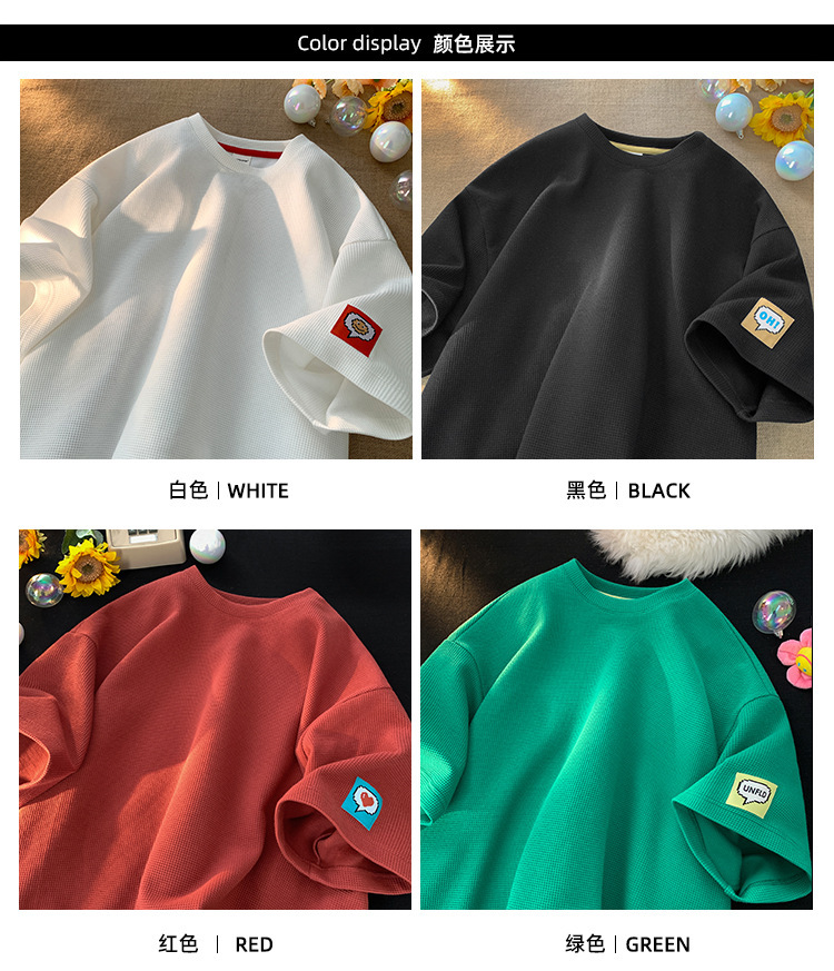 와플 반팔 티셔츠 남성용 화이트 여름 느슨한 반팔 Ins 홍콩 스타일 패턴베이스 셔츠, 둥근 목 자수스토어 가기