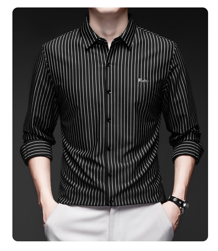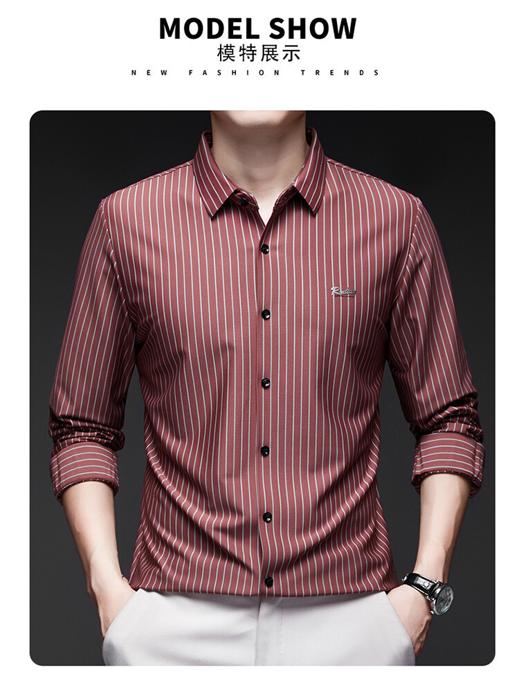 봄과 가을 남성용 트레이스 아이스 실크 긴팔 셔츠 고급 중년 아빠 착용 비 다림질 주름 방지 캐주얼 스트라이프 셔츠스토어 가기