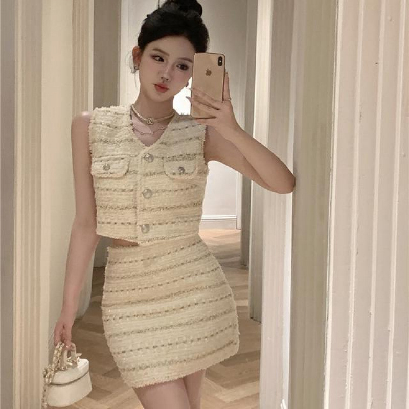 샤넬 스타일 세트 레트로 민소매 조끼 최고 여성 여름 스커트 힙합 스커트 우아한 투피스 세트