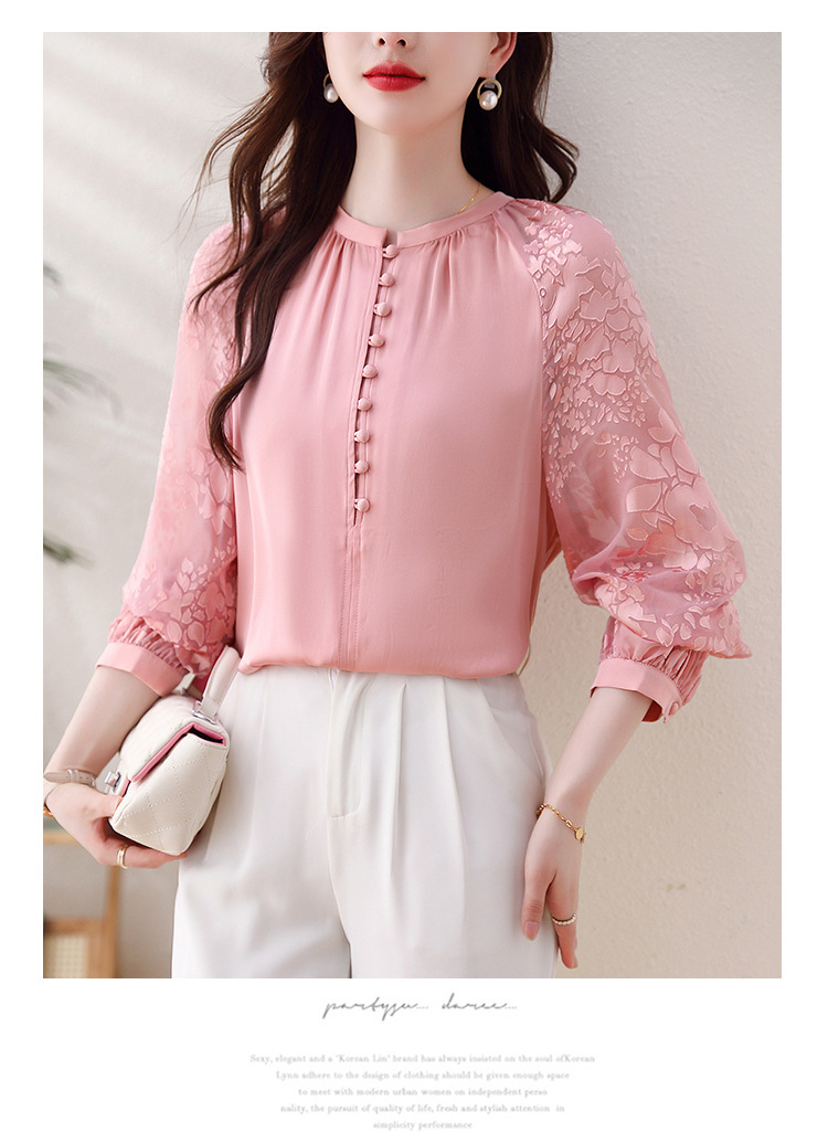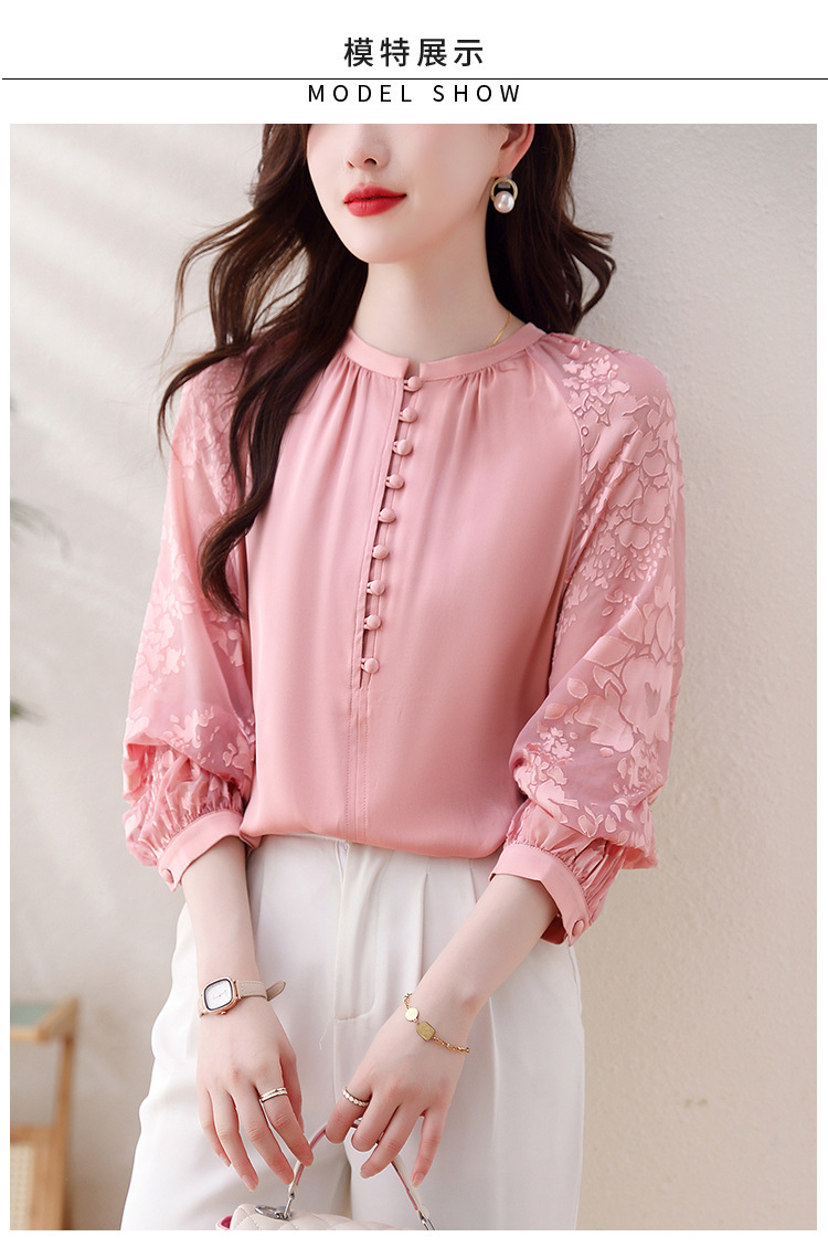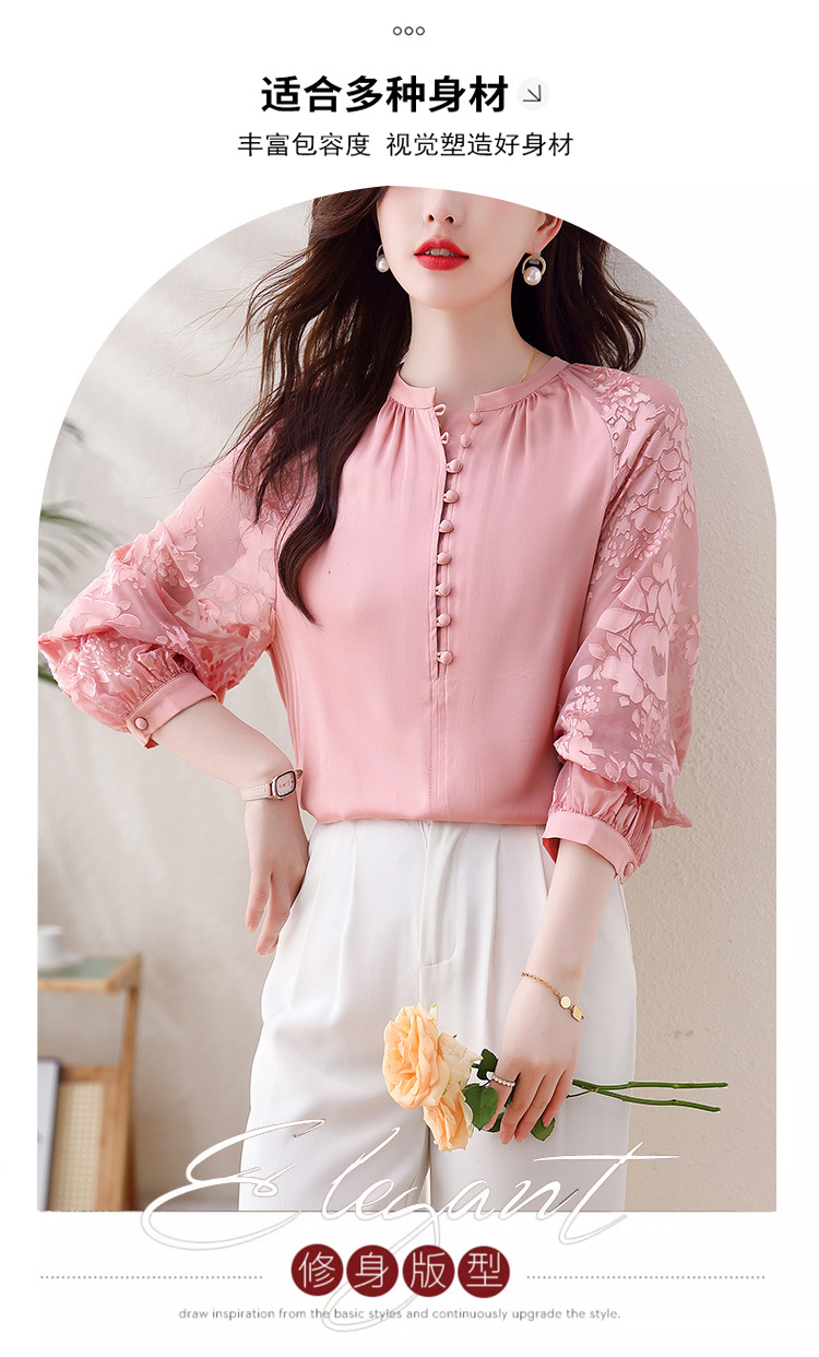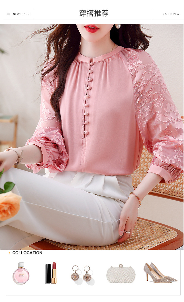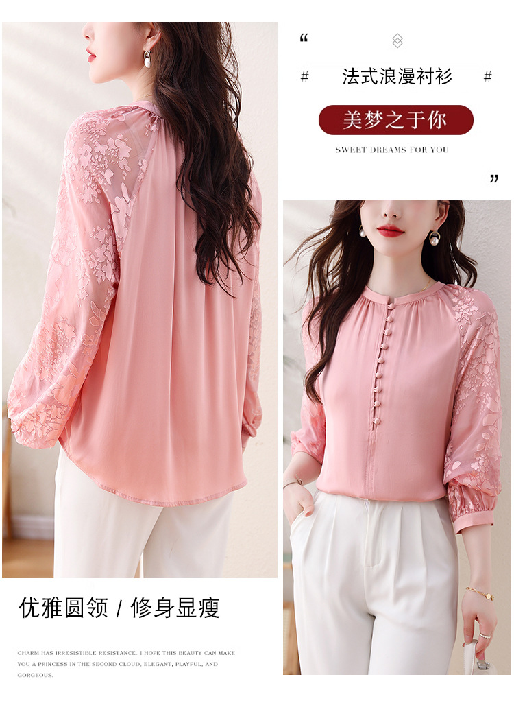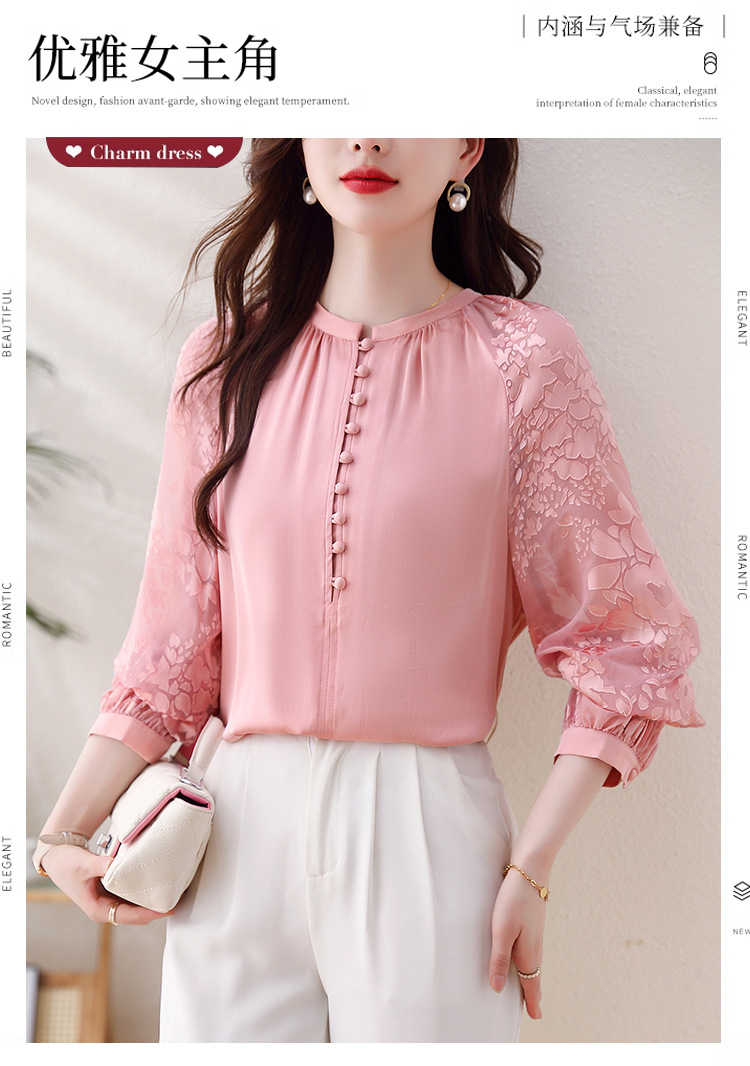 2024 년 가을 뉴 헤비 실크 라이트 럭셔리 통기성 새틴 자카드 셔츠 최고 여성 싱글 브레스트 쉬폰 셔츠스토어 가기