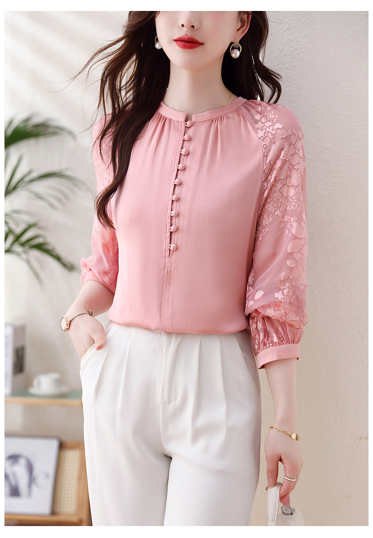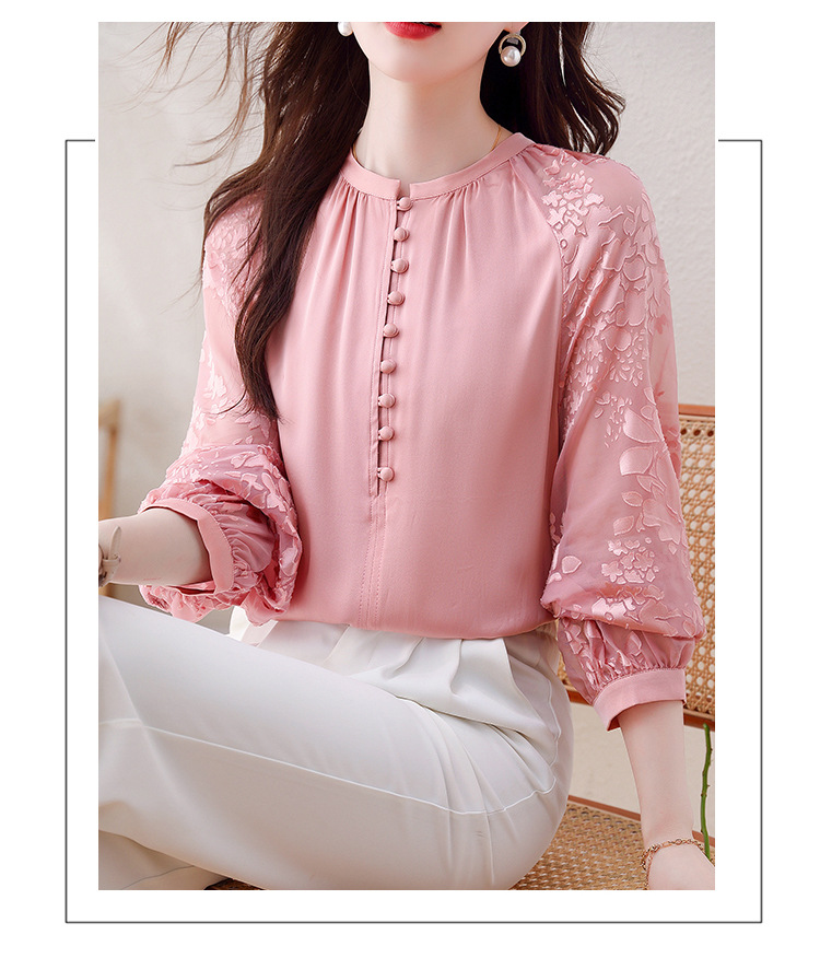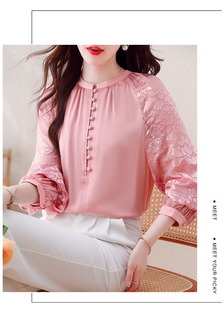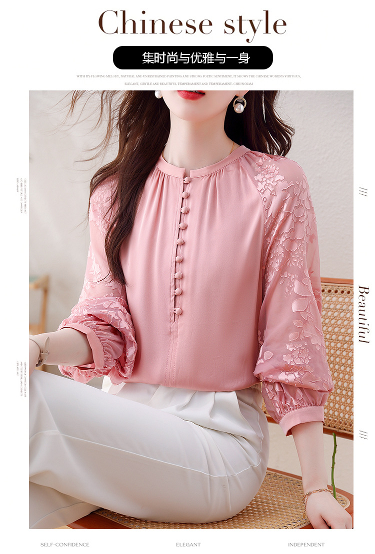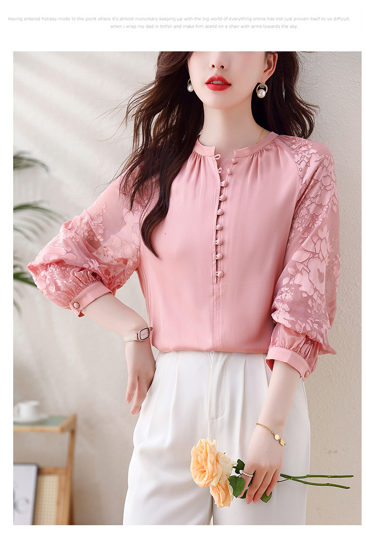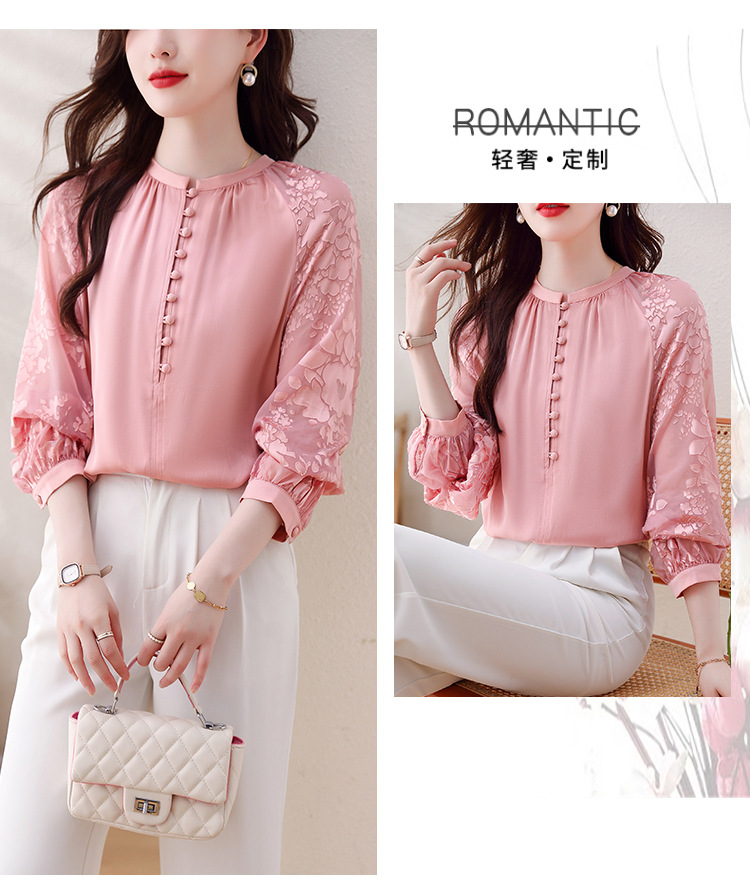 2024 년 가을 뉴 헤비 실크 라이트 럭셔리 통기성 새틴 자카드 셔츠 최고 여성 싱글 브레스트 쉬폰 셔츠스토어 가기