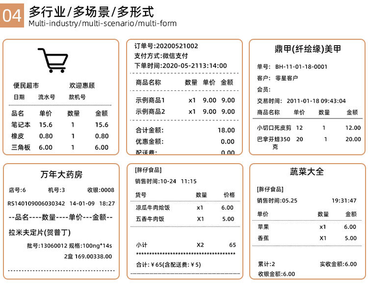 - 出租车票据打印,管理费收据打印,收据打印,餐厅订购信息打印等小型轻便,易于出门工作。