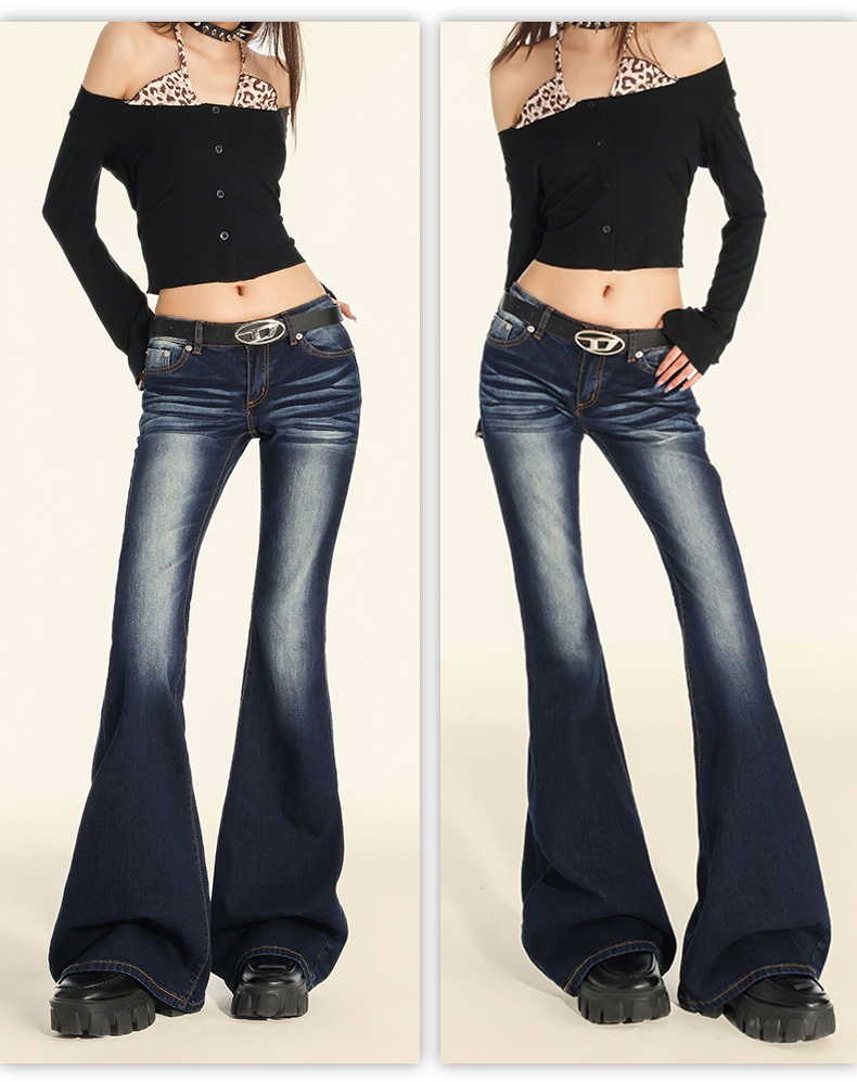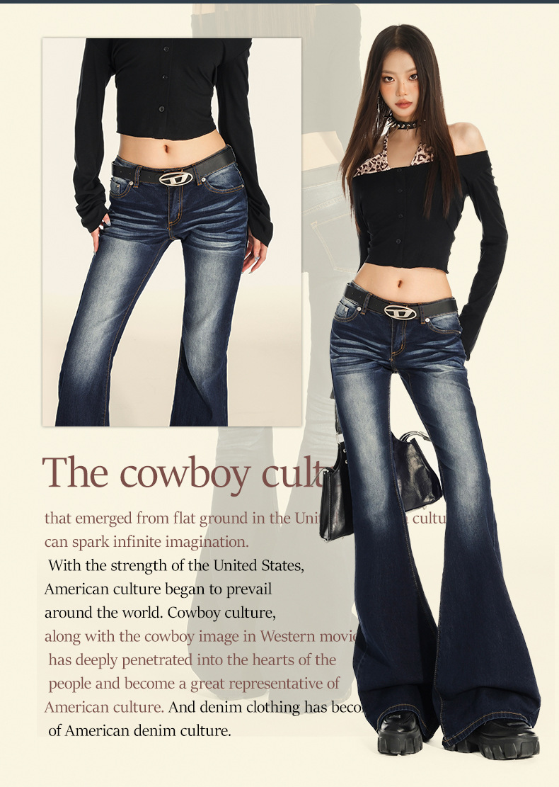 오렌지 실크 여성 의류 # 여성을위한 미국 복고풍 매력 낮은 허리 마이크로 플레어 청바지 2025 가을 새로운 스트레치 바닥 길이 바지스토어 가기