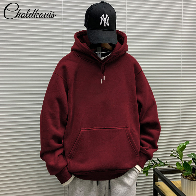 • 버건디 후드 스웨트셔츠 플러스 벨벳 스타일 - 솔리드 컬러 [GL]