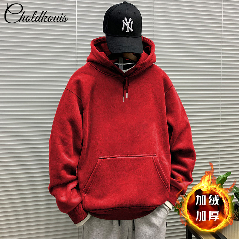 • 빅 레드 후드 스웨트셔츠 플러스 벨벳 스타일 - 솔리드 컬러 [GL]