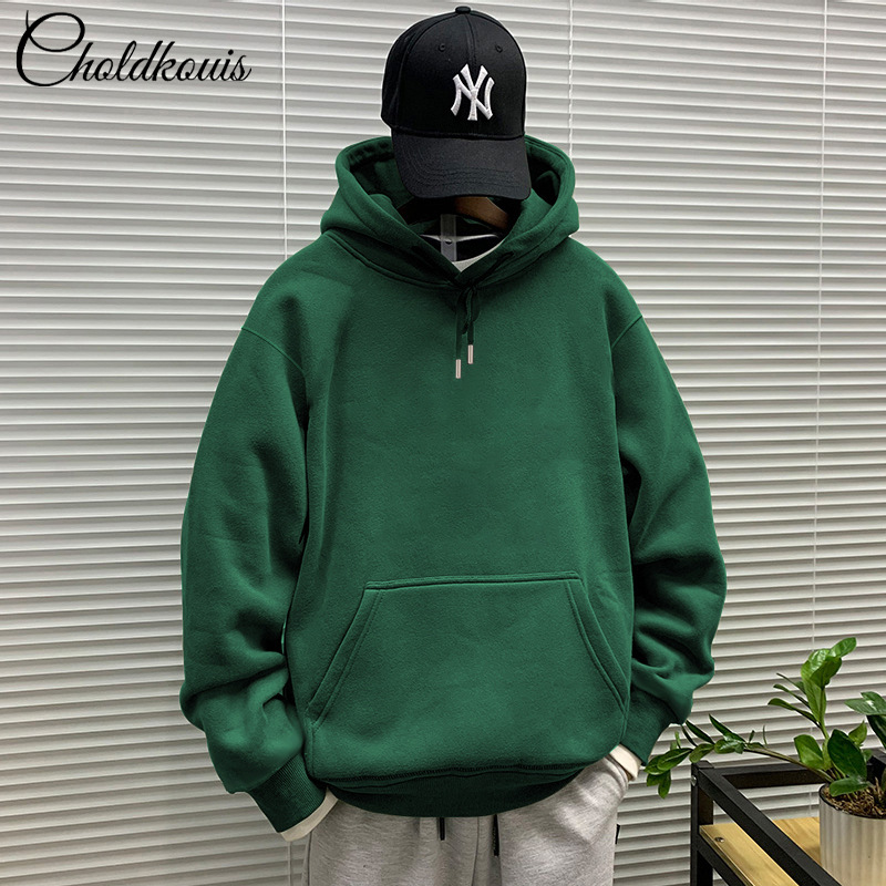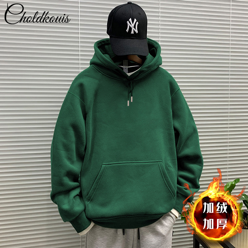 • 다크그린 후드 스웨트셔츠 플러스 벨벳 스타일 - 솔리드 컬러 [GL]