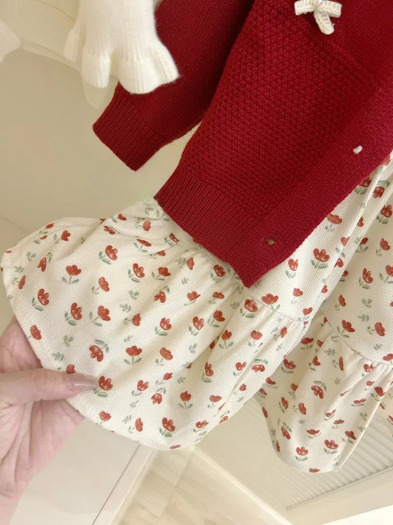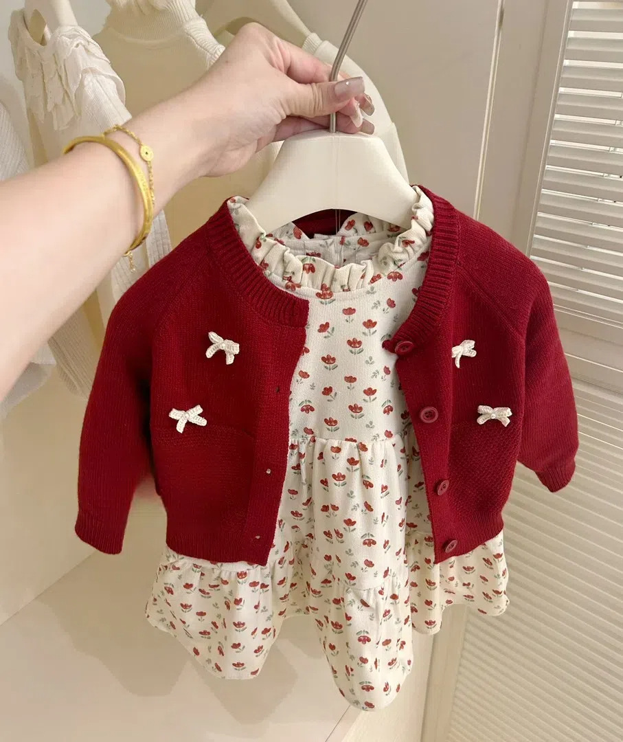 여자 이른 가을 새 빨간 활 카디건 꽃 한국 스타일 스커트 세트 아기 봄 가을 겨울 니트웨어