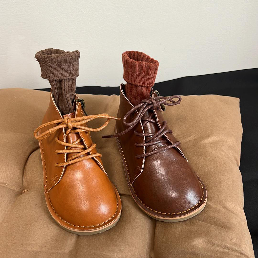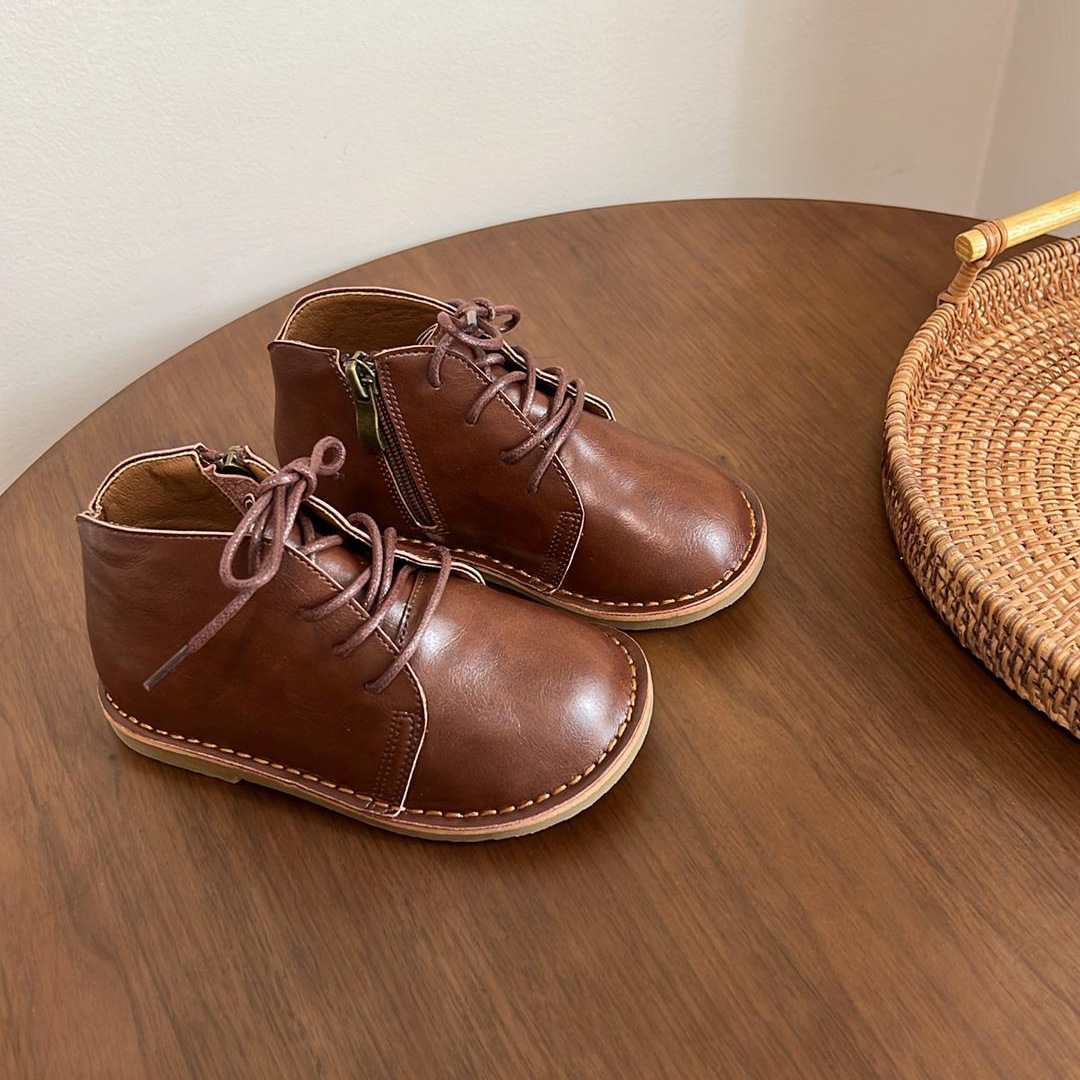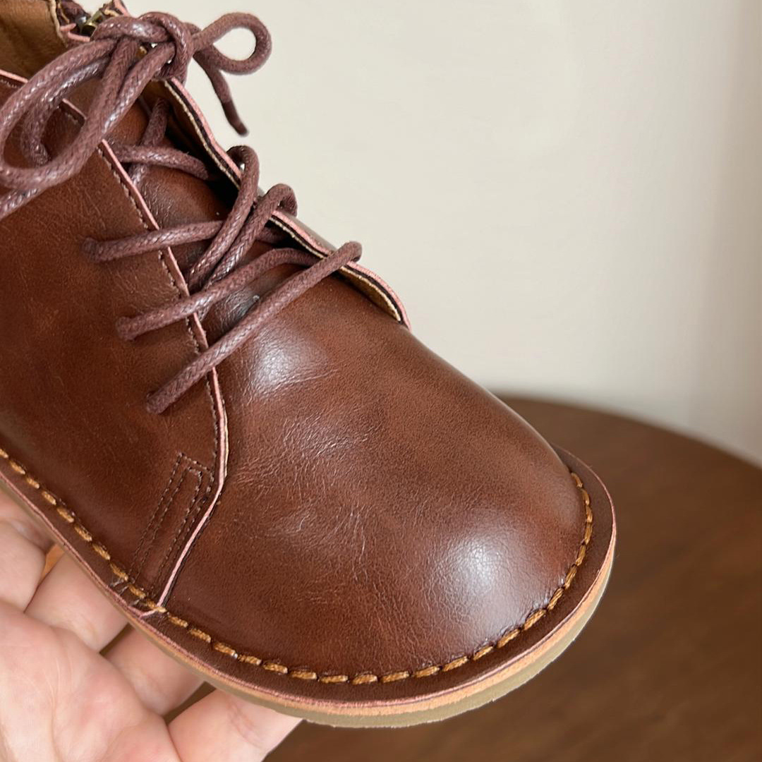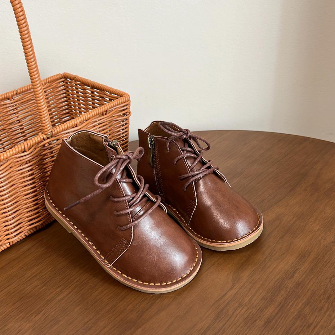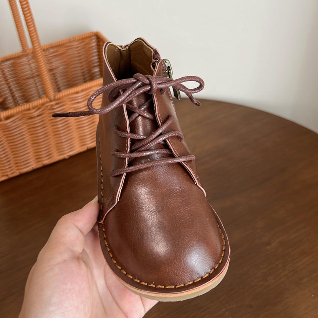 한국 가죽 부츠 2024 가을과 겨울 새로운 빈티지 소녀 모리 스타일 짧은 부츠 소년 소녀 사이드 지퍼 부드러운 바닥 낮은 부츠 조수