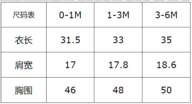 尺码表 0-1M 1-3M 3-6M