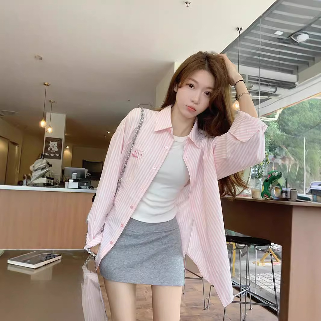 자수 핑크 줄무늬 셔츠 여성용 한국식 폴로 칼라 새 얇은 느슨한 태양 보호 셔츠 긴팔 캐주얼 셔츠스토어 가기