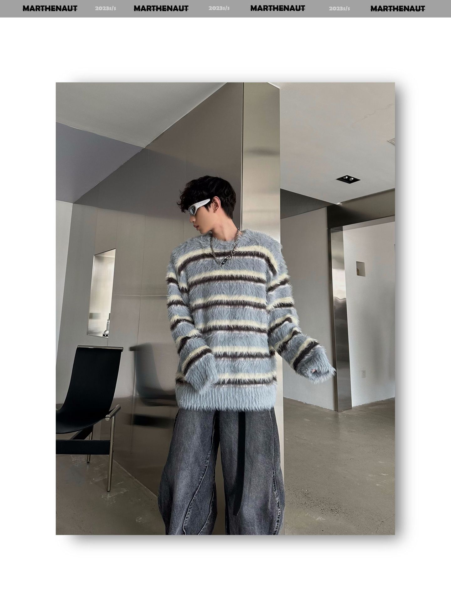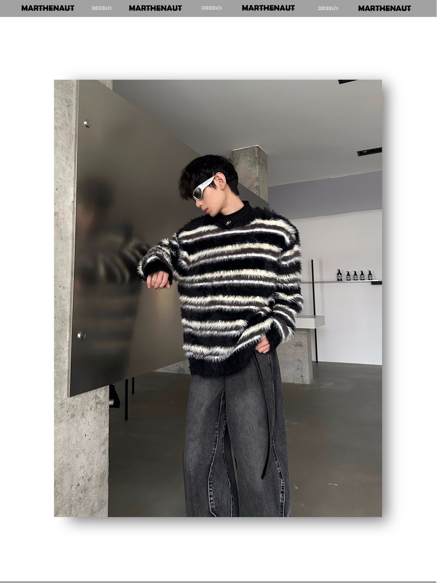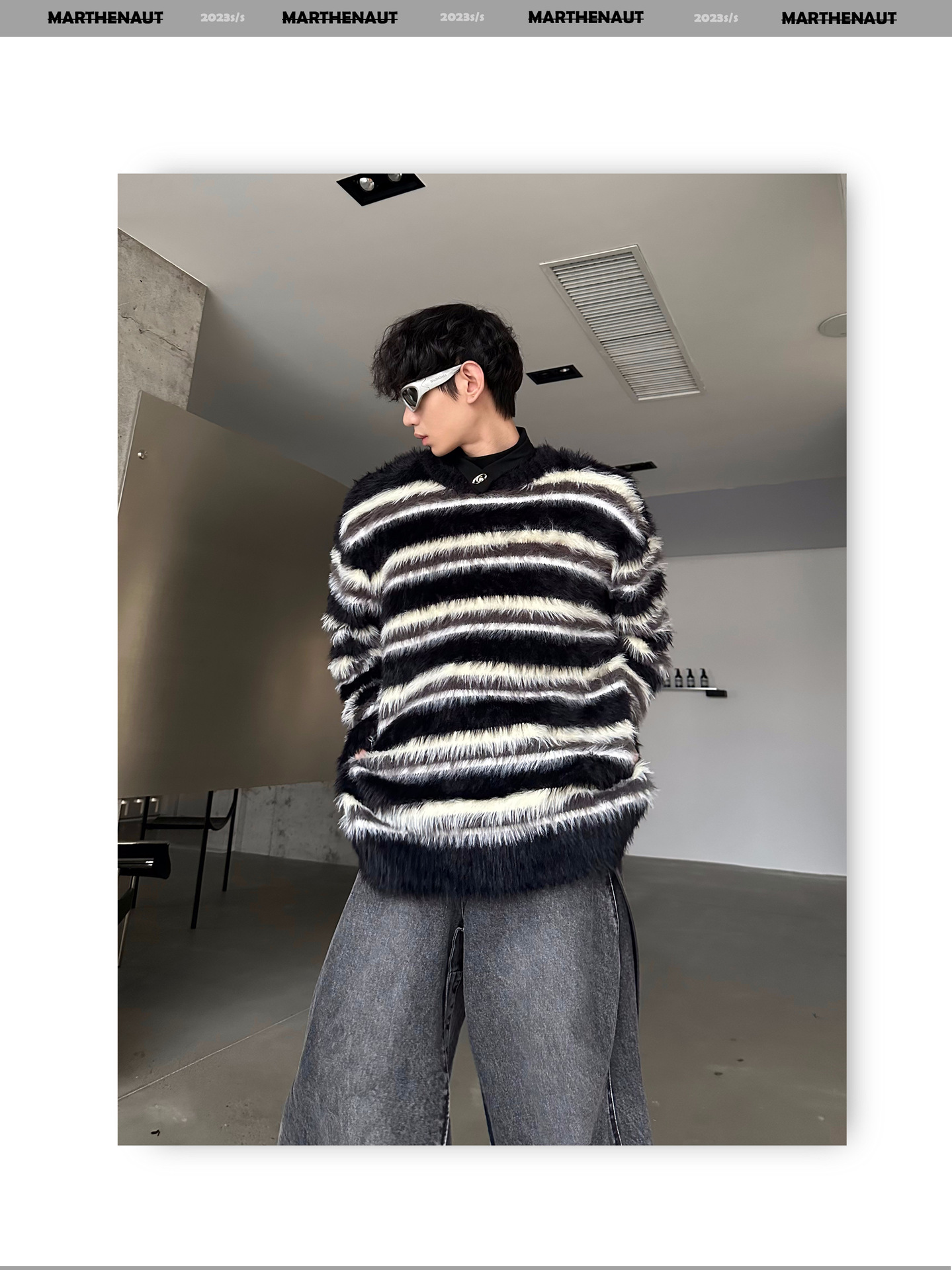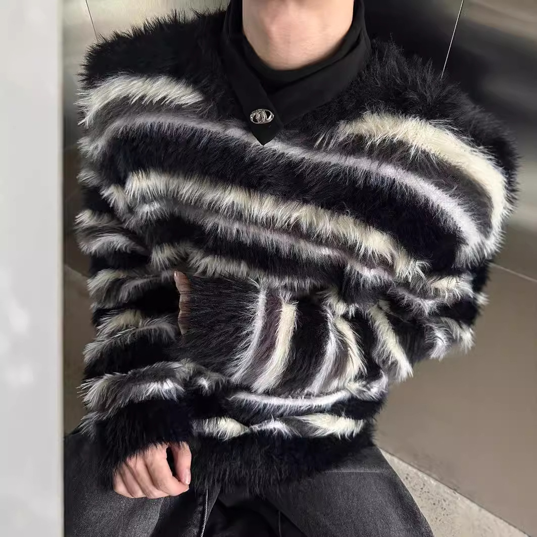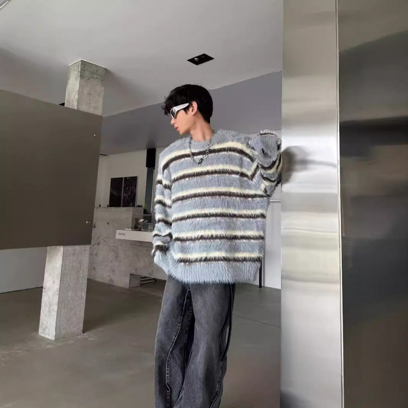 공장 직접 공급 틈새 모헤어 블랙과 화이트 스트라이프 디자인 센스 플러시 스웨터 남성의 간단한 하이 엔드 센스 스웨터 트렌디스토어 가기