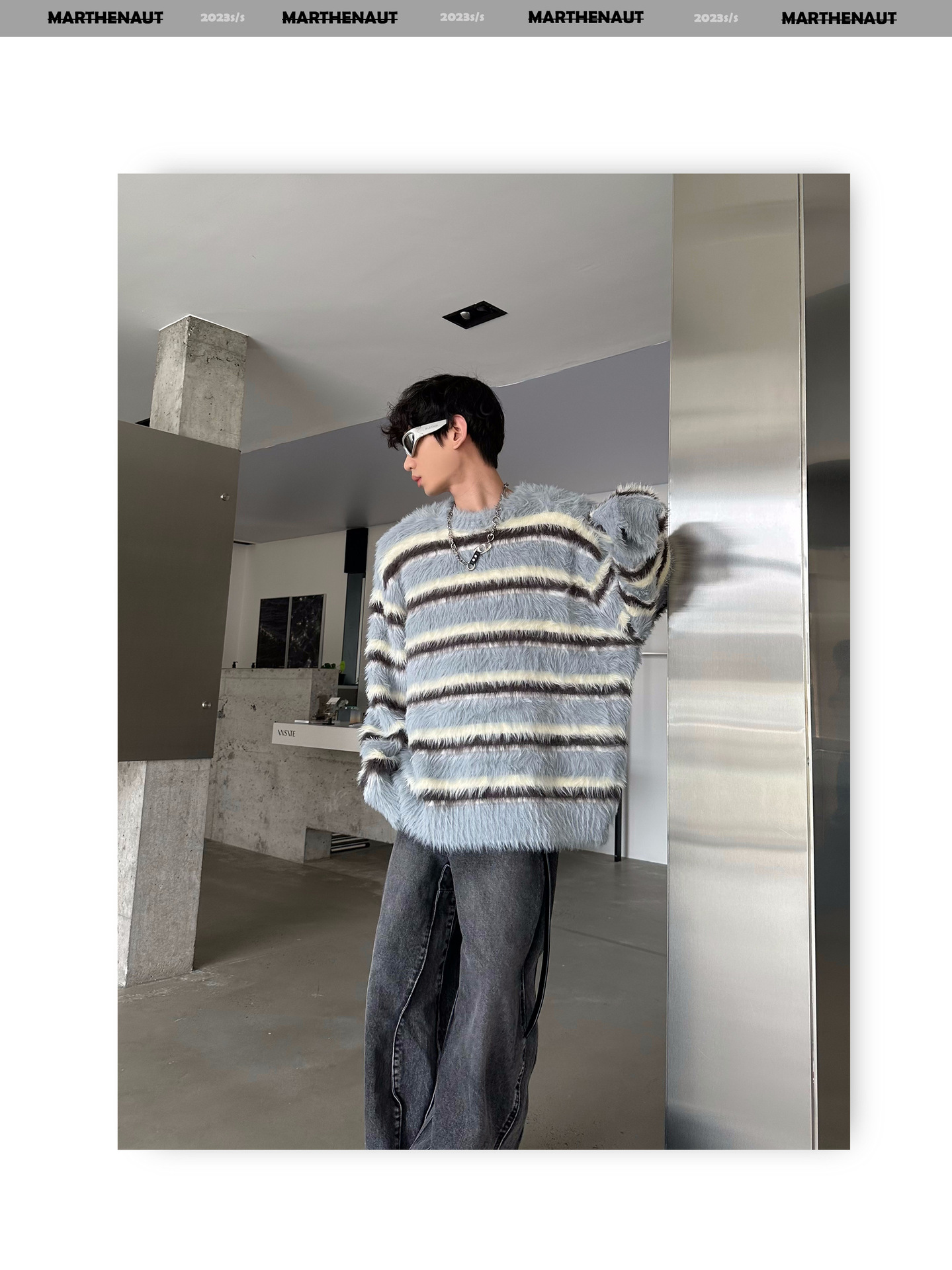 공장 직접 공급 틈새 모헤어 블랙과 화이트 스트라이프 디자인 센스 플러시 스웨터 남성의 간단한 하이 엔드 센스 스웨터 트렌디
