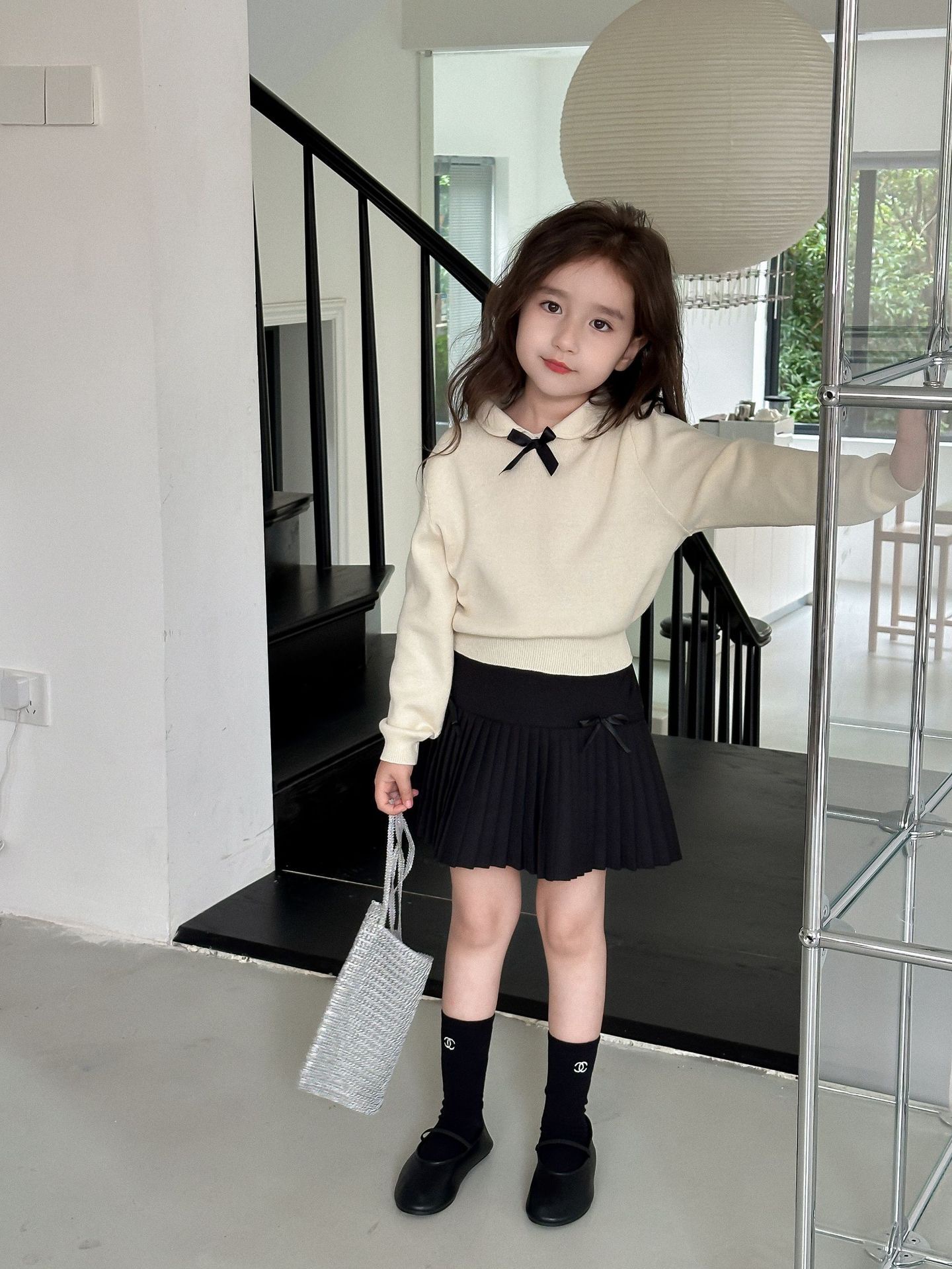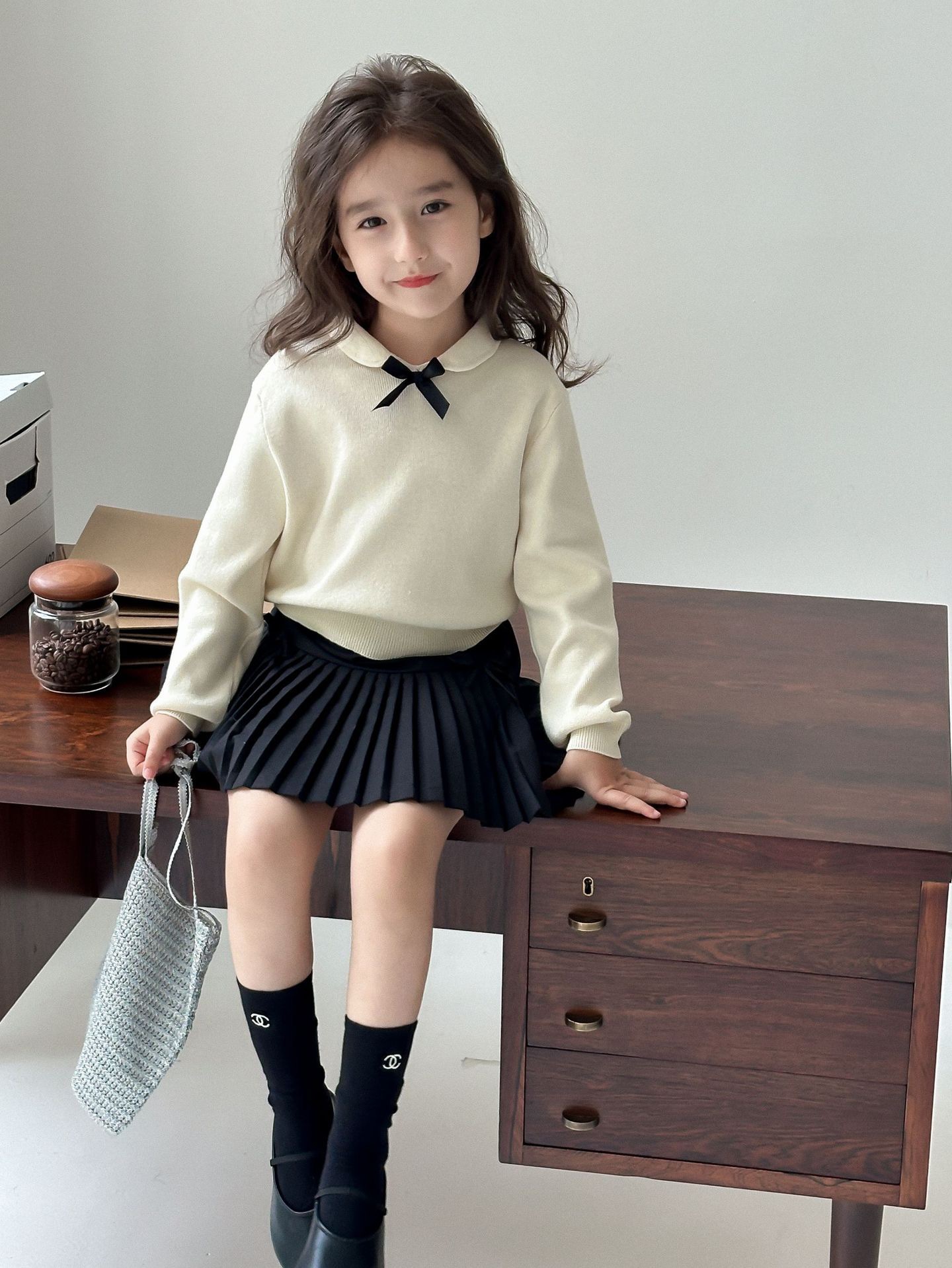 2025ktbb 가을 신상 여아 미우 스타일 컬리지룩 리본 단색 스웨터 인형 칼라 상의+플리츠 스커트