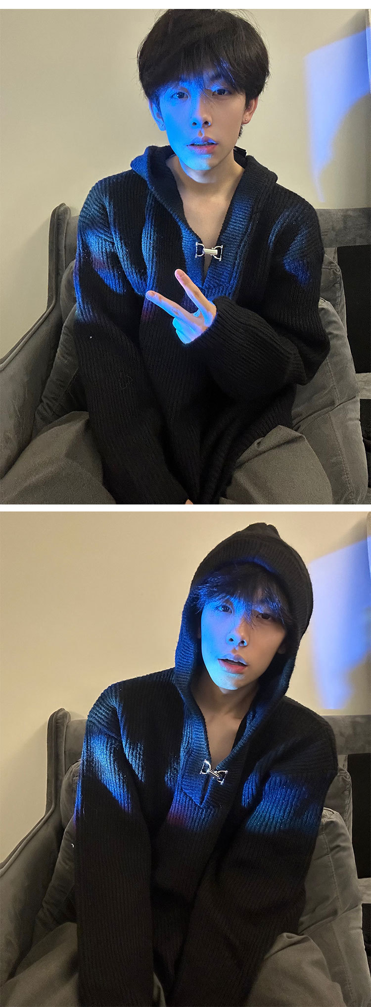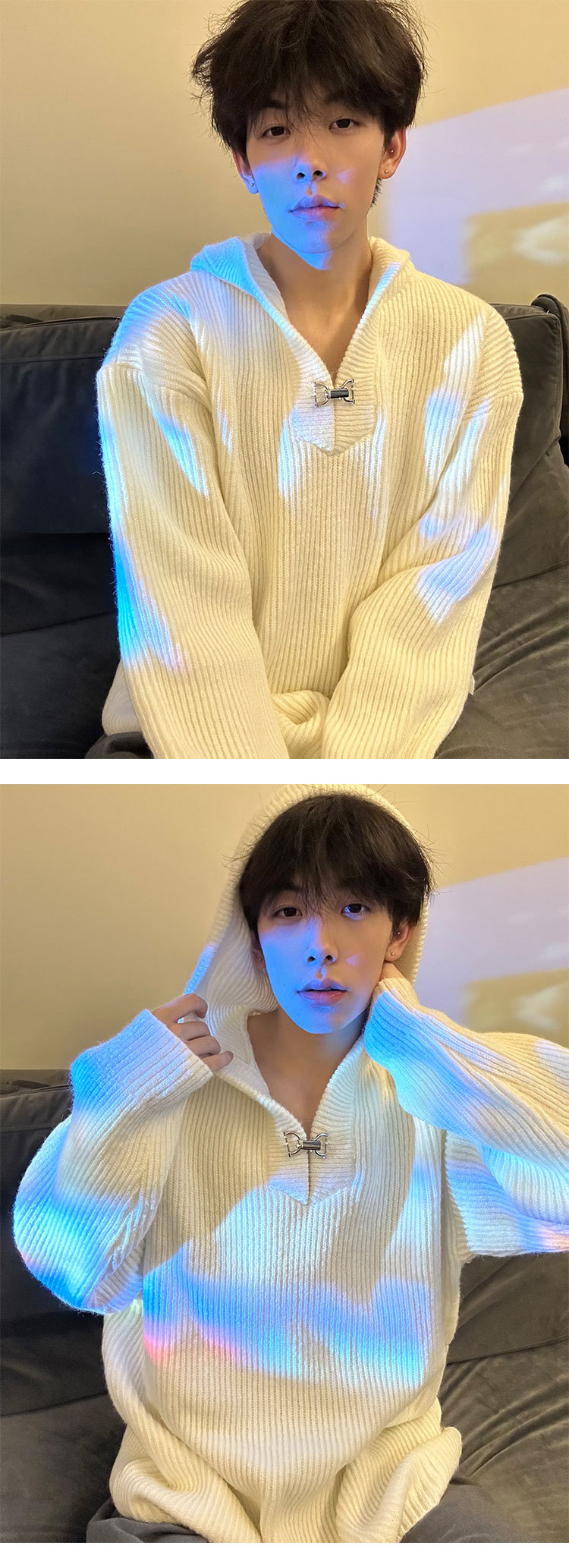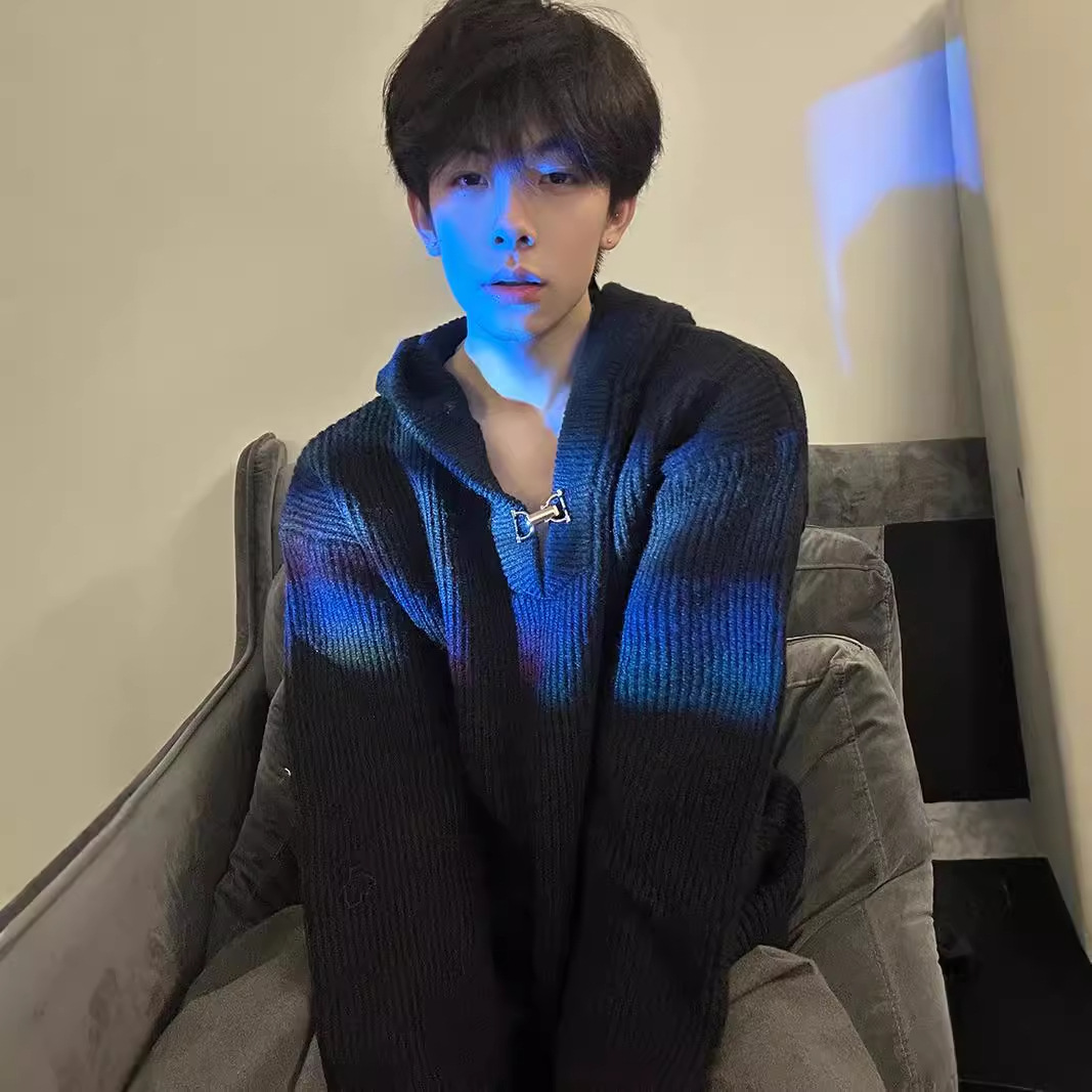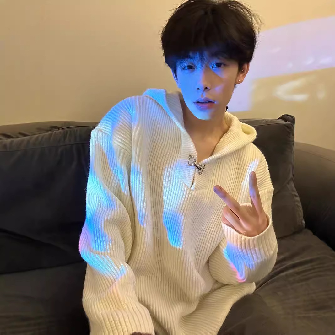 흰색 살구색 V 넥 후드 스웨터 남성 가을과 겨울 금속 버클 디자인 느낌 ruffian 잘 생긴 십대 스웨터 탑