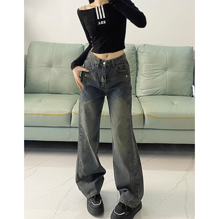 2024 아메리칸 레트로 청바지 여성의 봄과 가을 높은 허리 느슨한 슬리밍 디자인 감각 플러스 사이즈 넓은 다리 바지스토어 가기