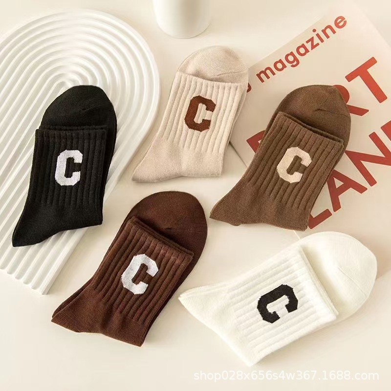 양말 여자 중간 길이 양말 C 편지 가을과 겨울 다크 브라운 스타일 한국 캐주얼 올매치 유행 여자 양말 인터넷 축하 스타킹