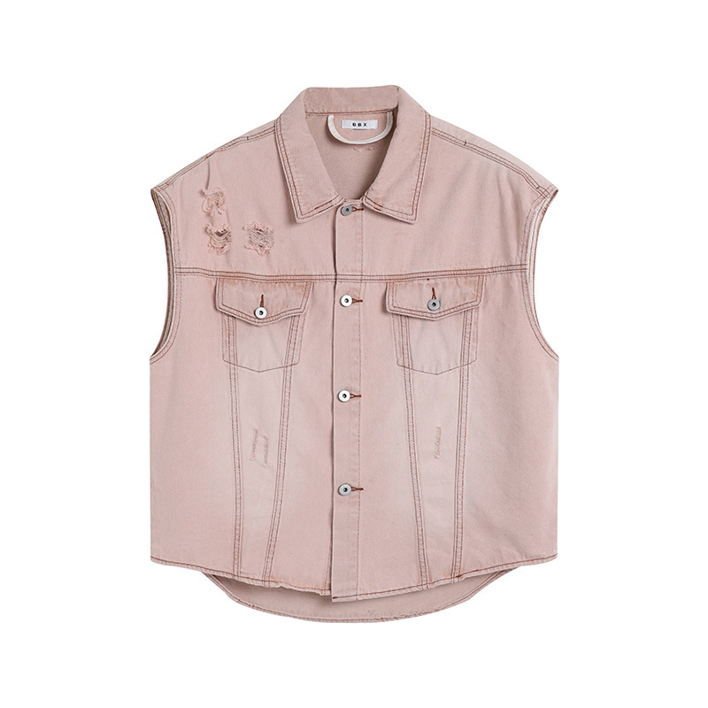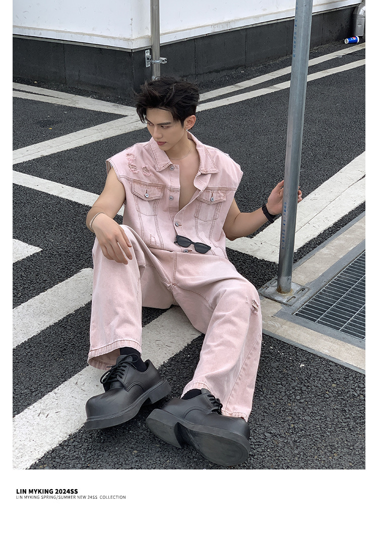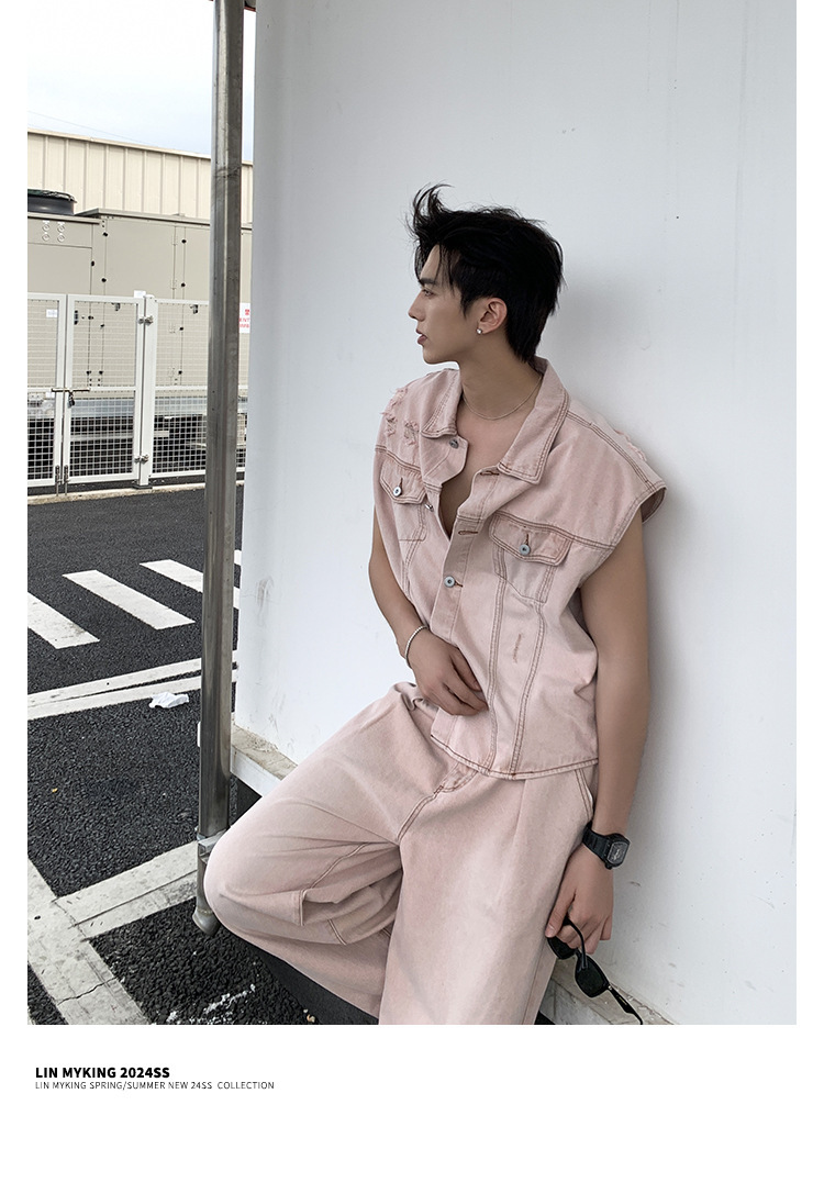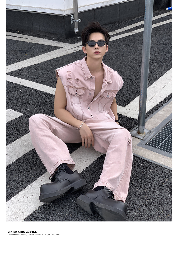 미국 틈새 표백 및 연마 데님 세트 남성 봄과 가을 새로운 민소매 조끼 디자인 넓은 다리 긴 바지스토어 가기