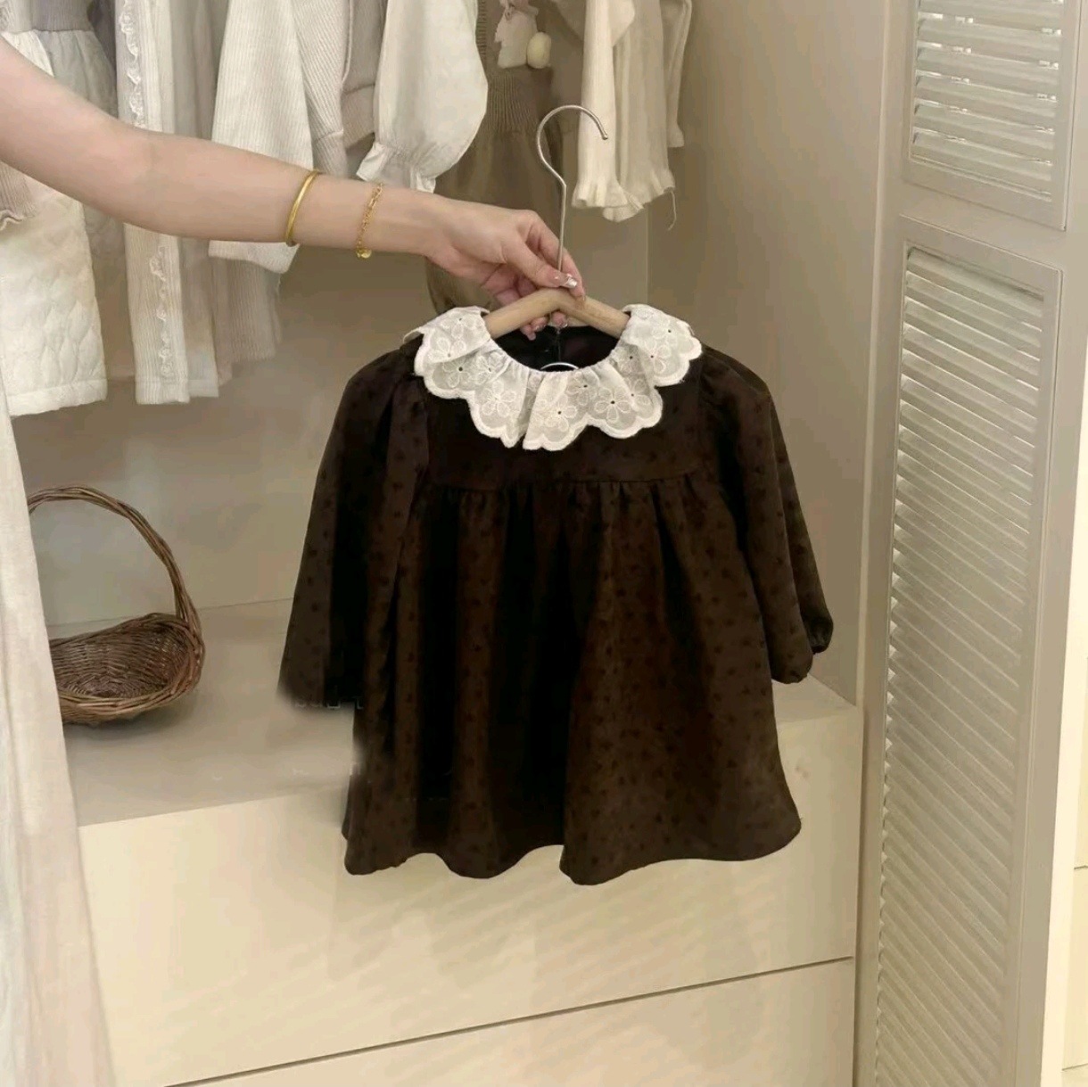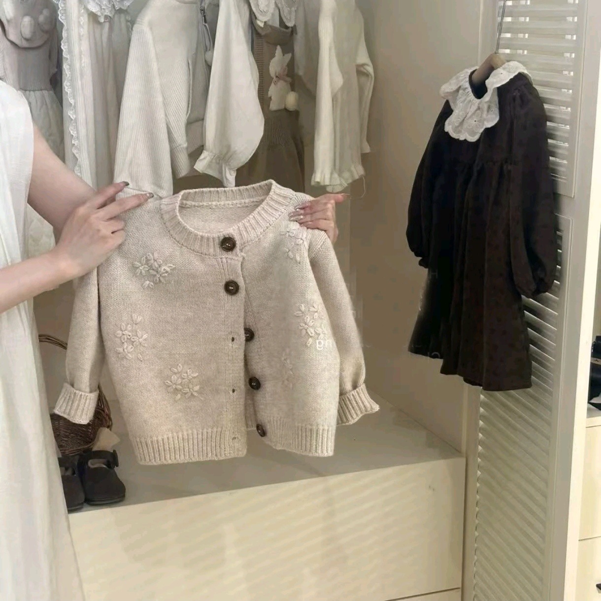 스위트 샤오시 25 봄 가을 신상 여아복 레트로 크로셰 니트 가디건 플로럴 원피스 투피스 세트 트렌디스토어 가기