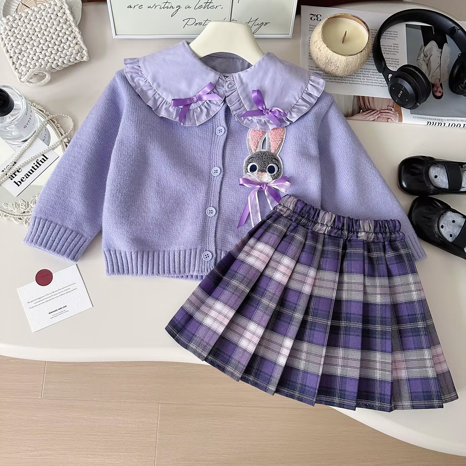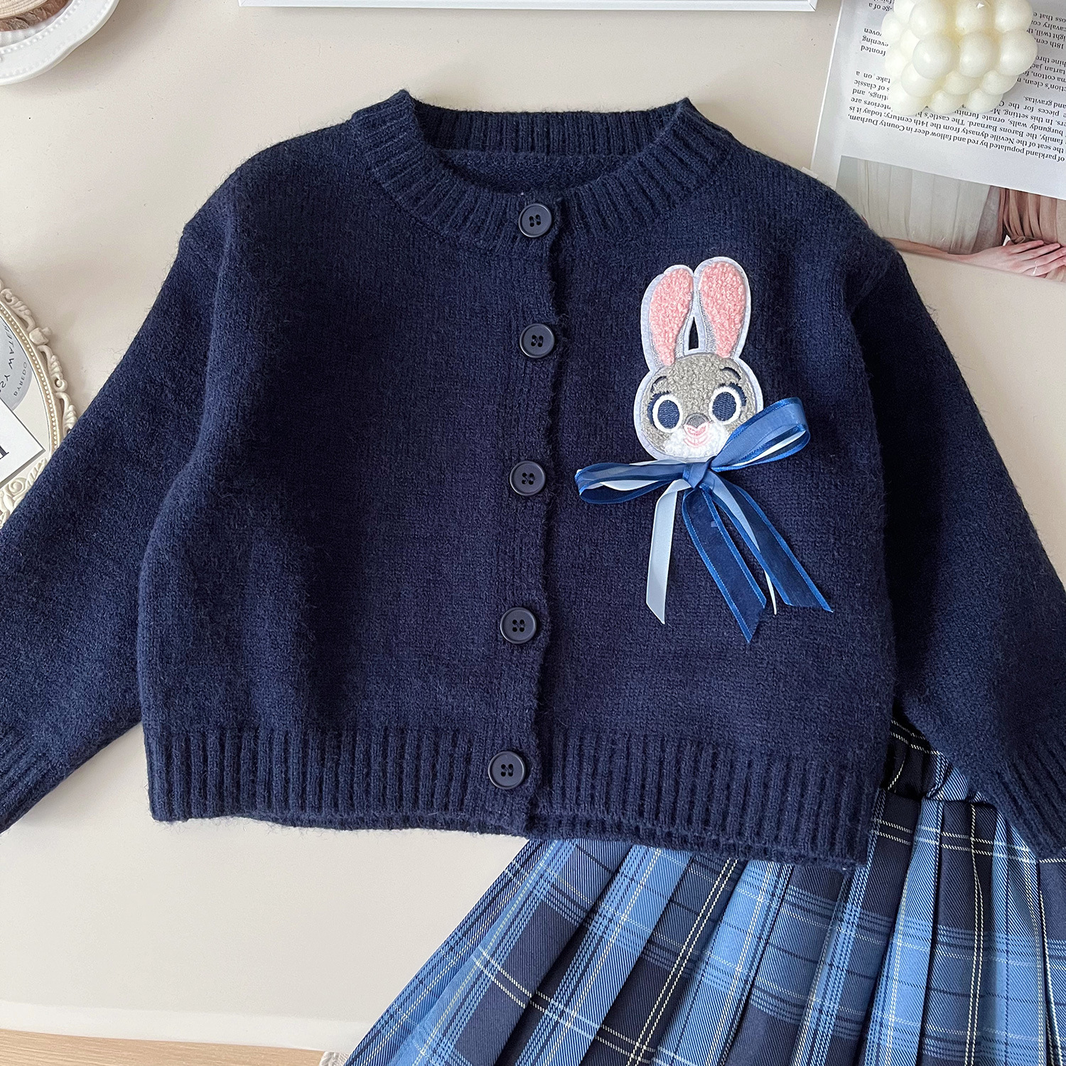 소녀의 3 조각 세트 2024 새로운 대학 스타일 토끼 니트 카디건 셔츠 유료 스커트 대학 스타일 세트스토어 가기