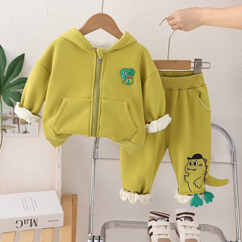 소년 가을 겨울 세트 2024 새로운 잘 생긴 어린이 아기 기모 만화 공룡 후드 자켓 투피스 세트