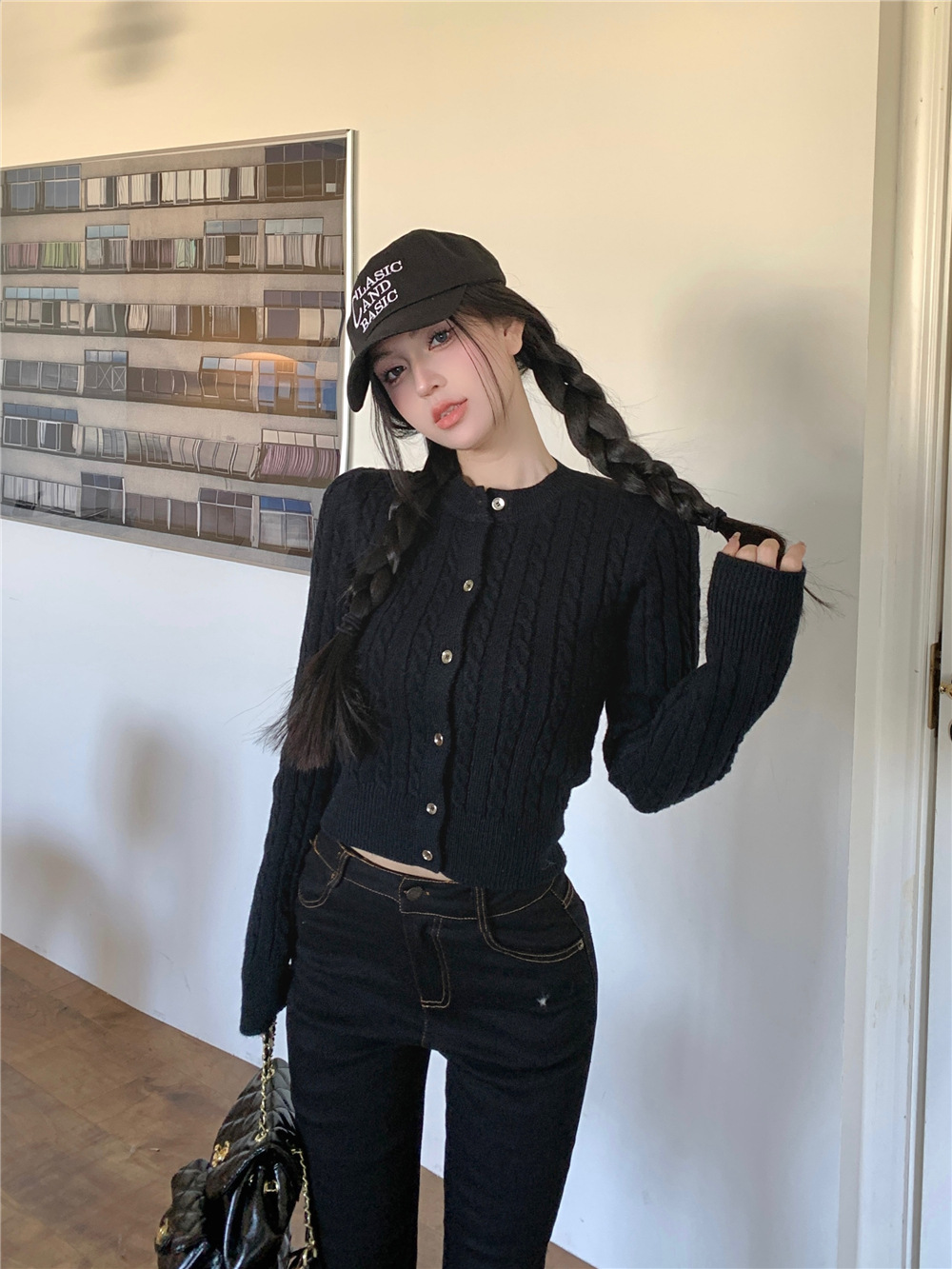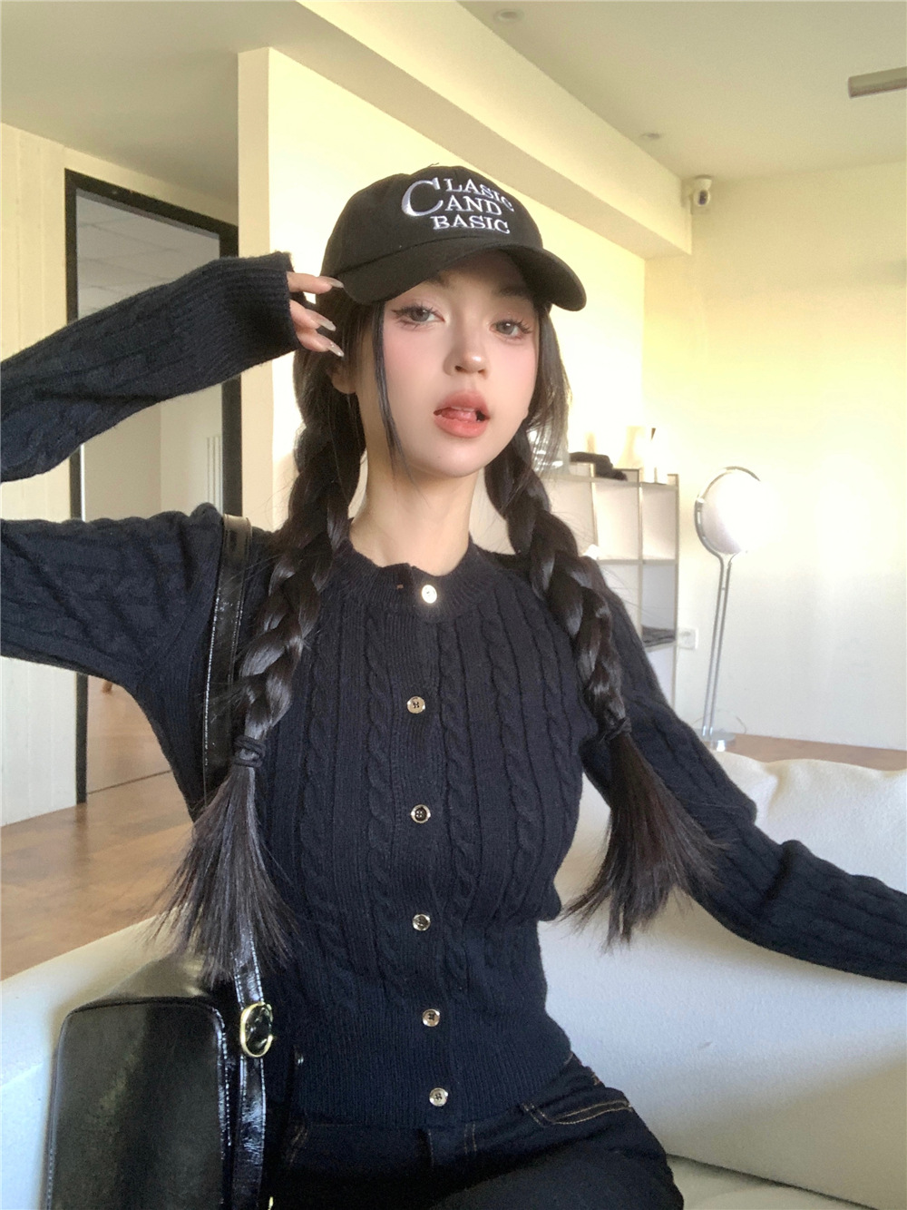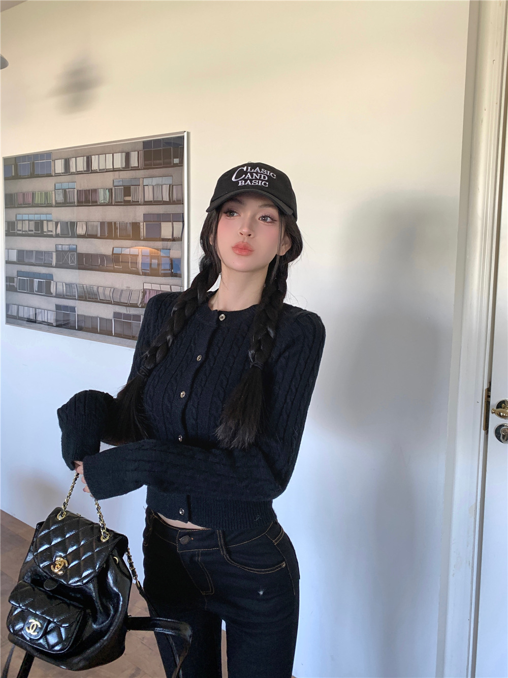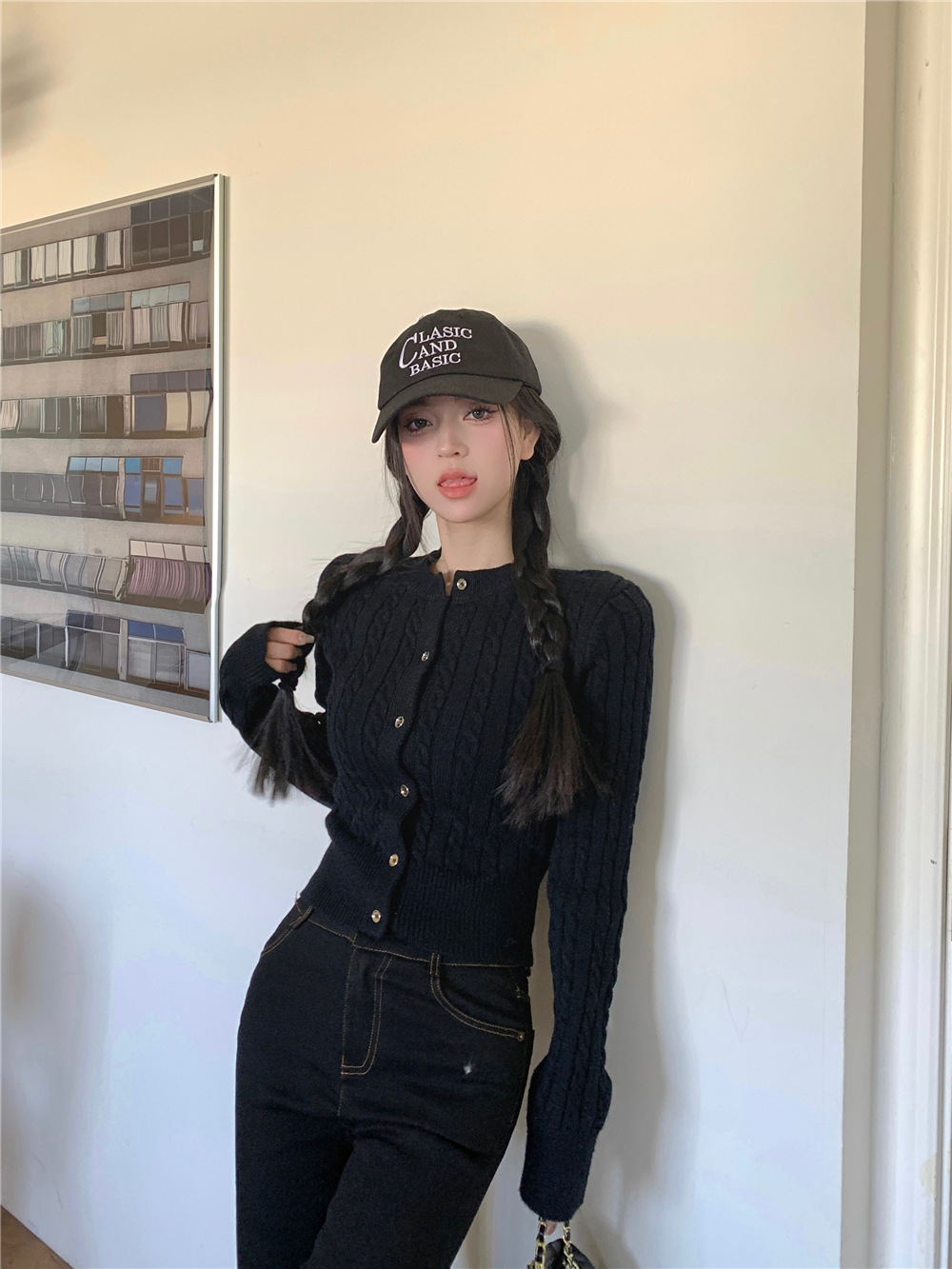 블랙 쇼트 트위스트 니트웨어 여성용 2024 가을 한국 스타일 새로운 슬림 핏 슬리밍 스파이스 소녀 내부 긴 소매 카디건